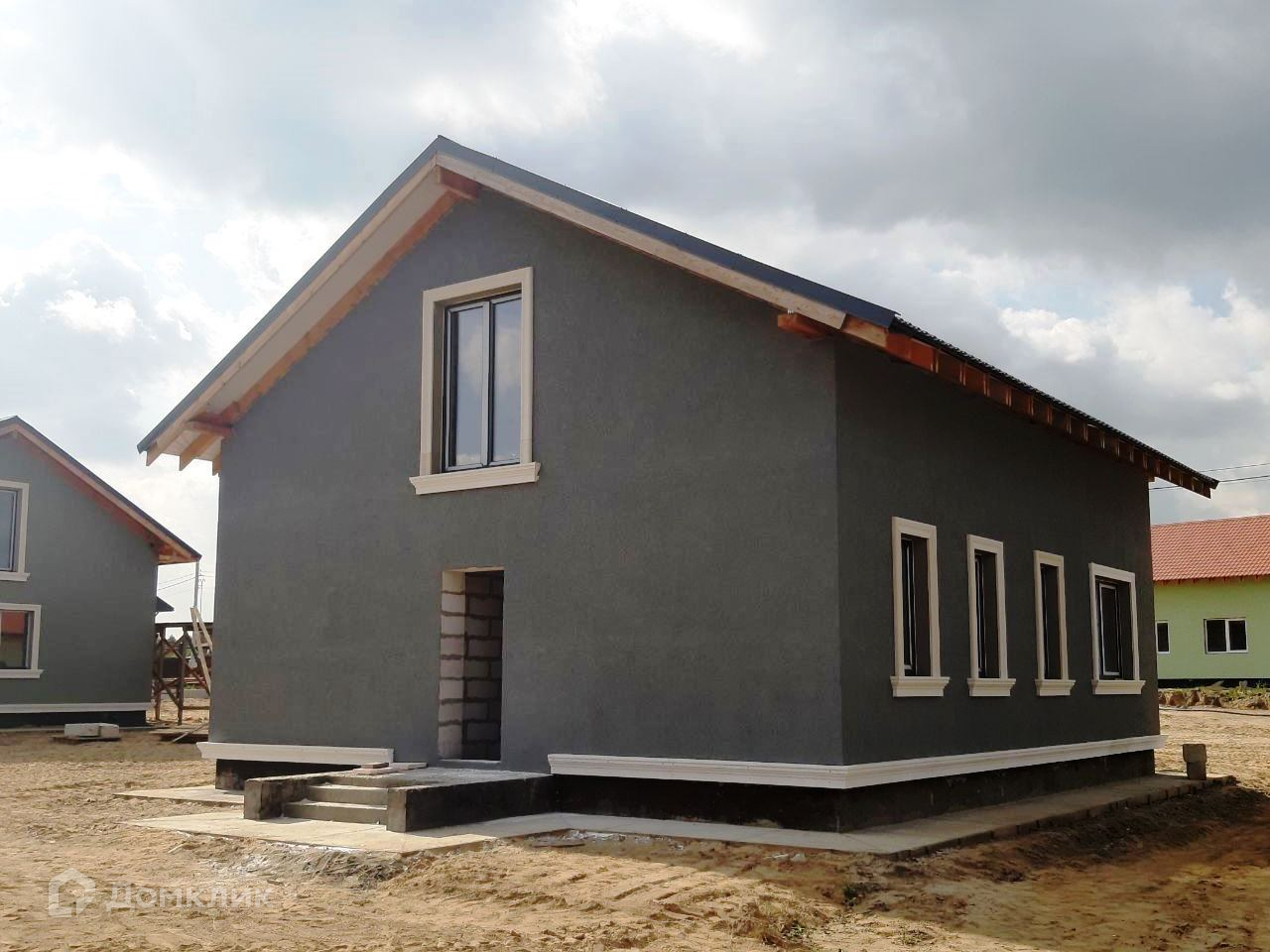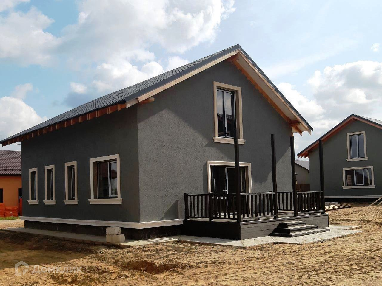 Теплый просторный коттедж построен из газоблока Д500. Фасад оштукатурен, покрашен и декорирован. Окна и дверь на террасу - двухкамерный стеклопакет. Установлены - водосточная система, снегозадержатели, залита отмостка 90 см. По проекту цоколь утеплен термопанелями, выполняются крыльцо и терраса с навесом, входная дверь утепленная металлическая.
