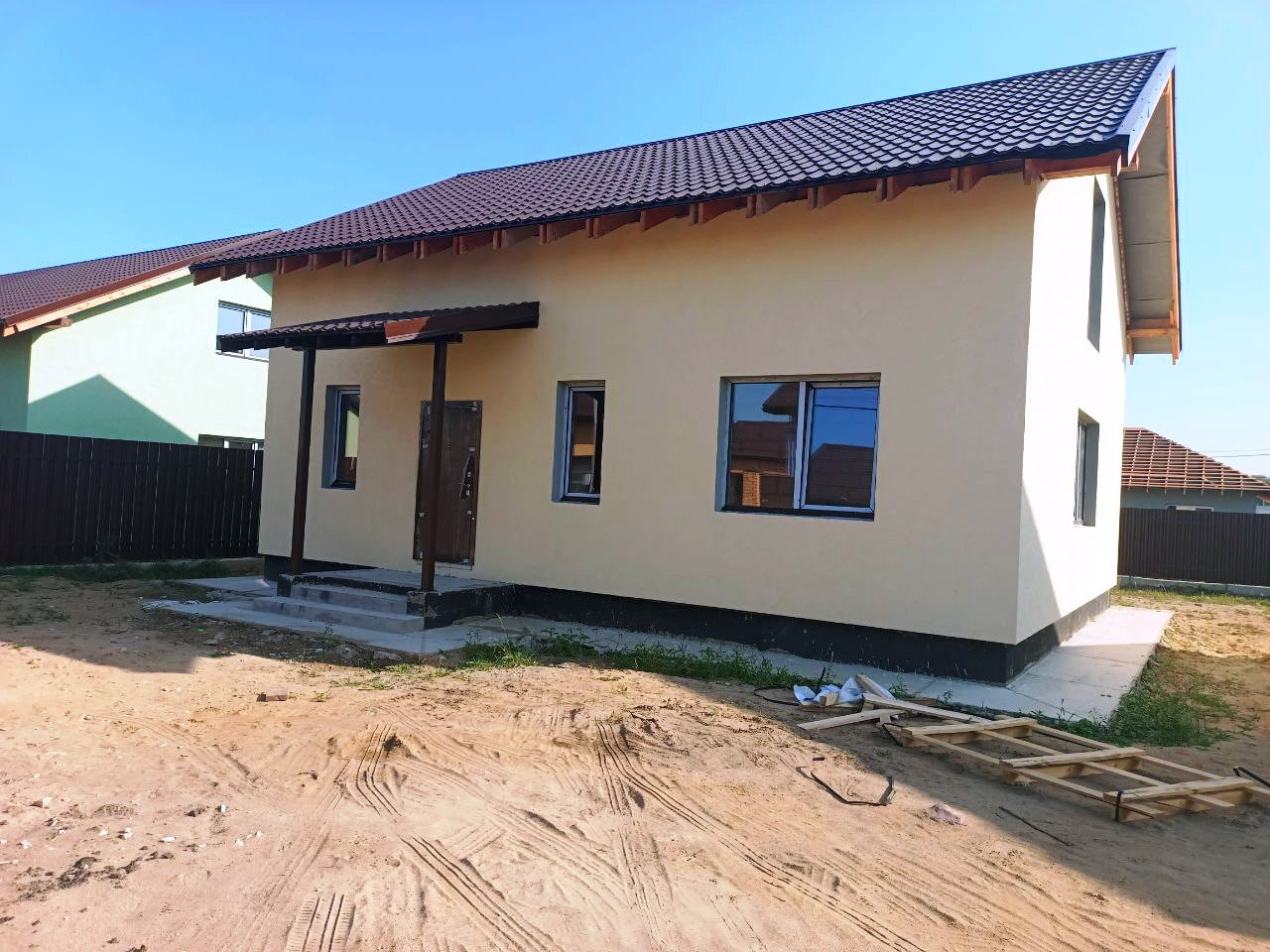 Теплый просторный коттедж построен из газоблока Д500. Фасад оштукатурен и покрашен. Окна и дверь на террасу - двухкамерный стеклопакет. Установлены - водосточная система, снегозадержатели, залита отмостка 90 см. По проекту фасад дома с декором, цоколь утеплен термопанелями, выполняется терраса с навесом, входная дверь утепленная металлическая.