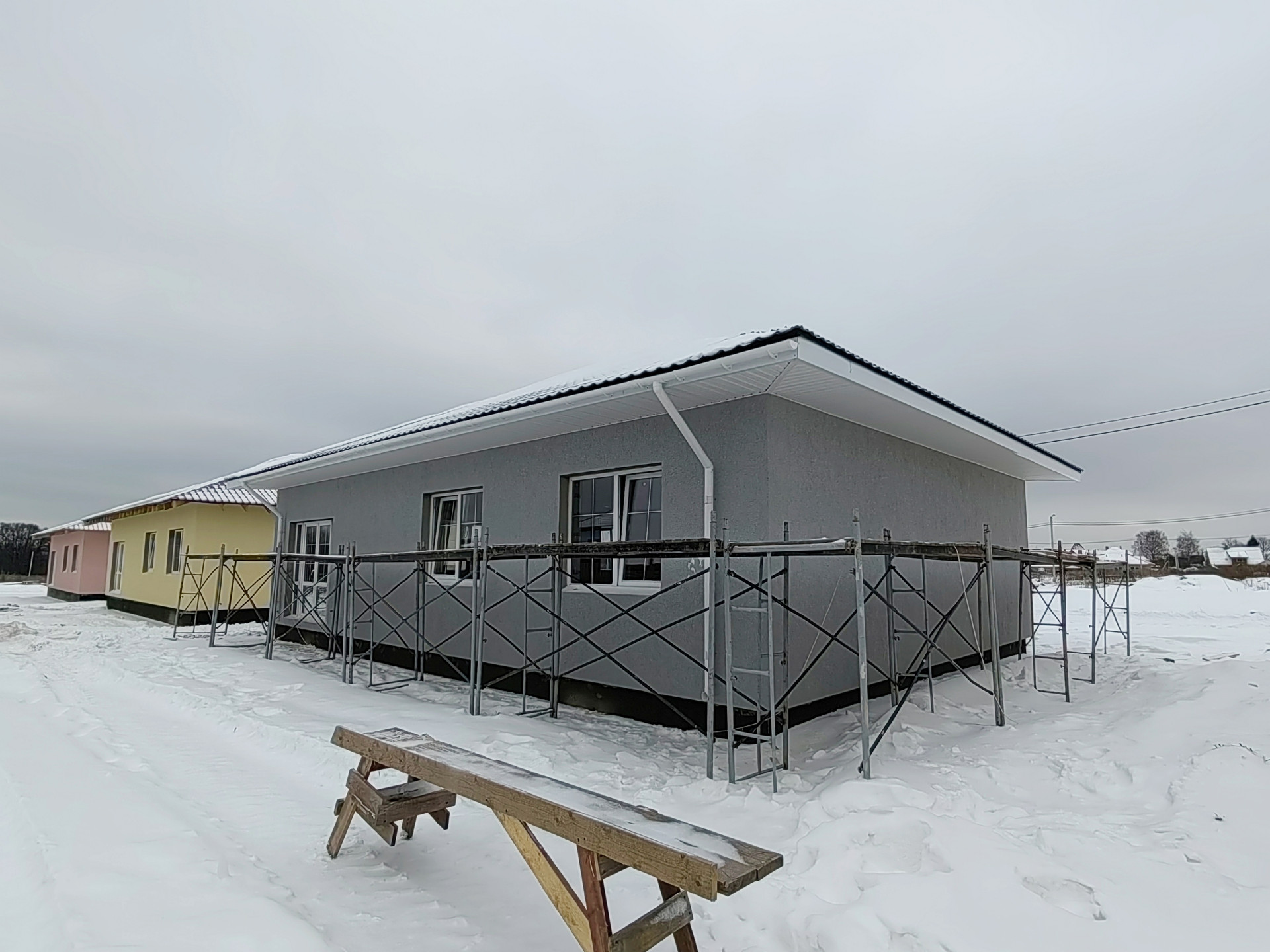 - Фасад: Штукатурка с покраской и фасадным декором. Цоколь утеплен термопанелями, выполнена отмостка