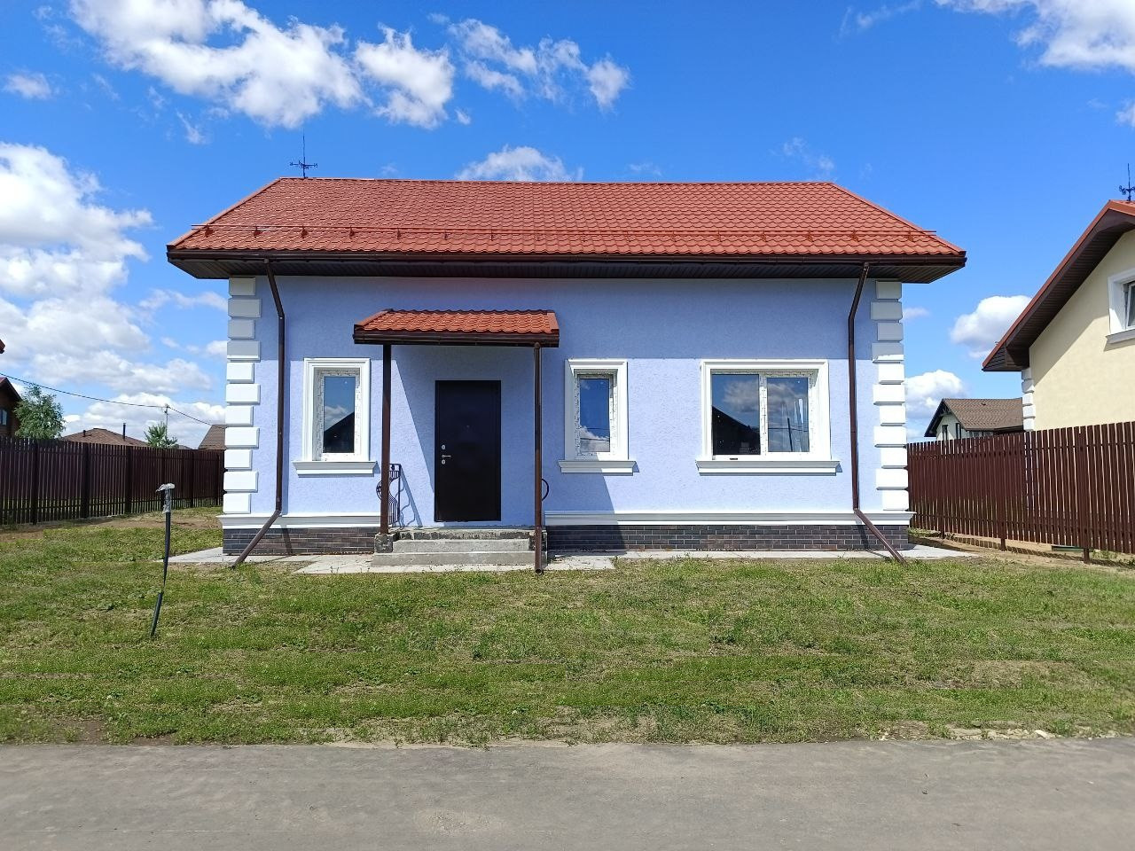 - Фасад: Штукатурка, покраска, Цоколь утеплен и облицован термопанелями, выполнена отмостка
