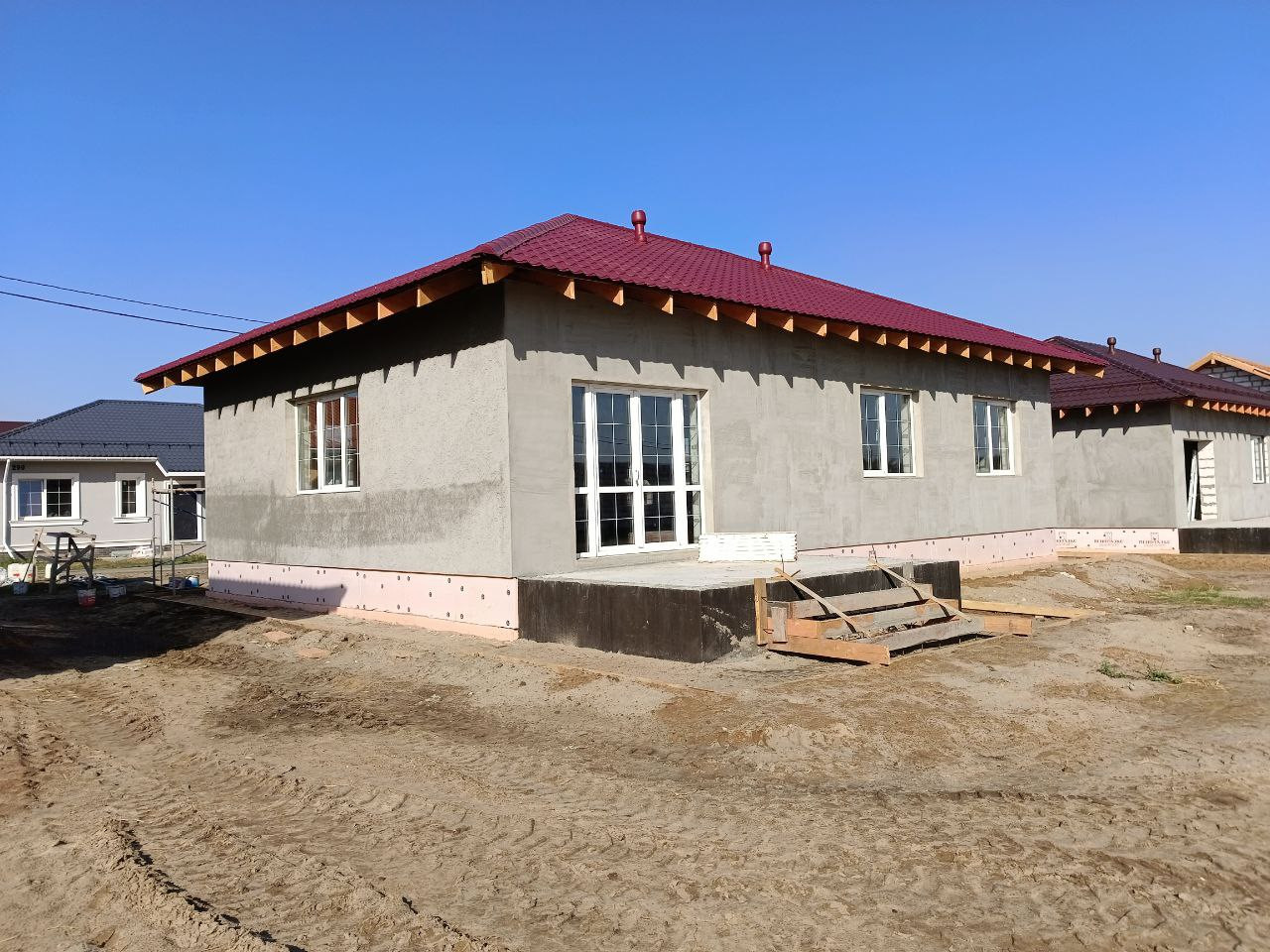-Фасад: Штукатурка, покраска, Цоколь утеплен и облицован термопанелями, выполнена отмостка.