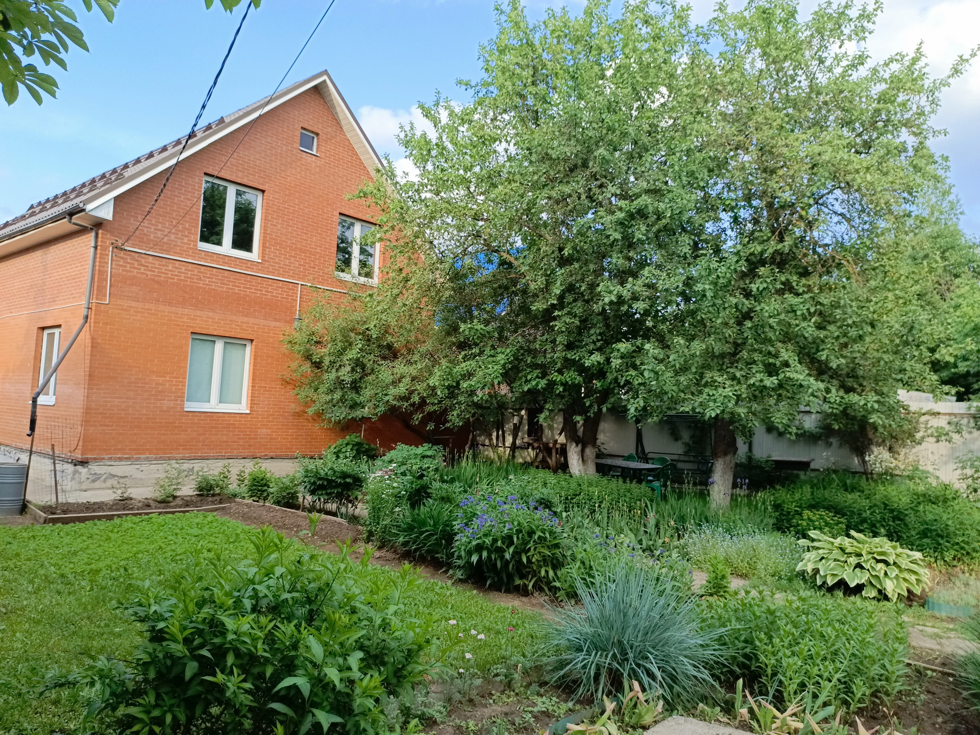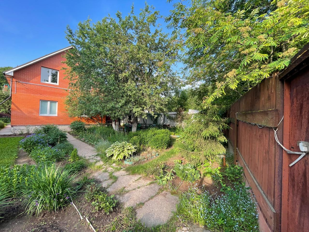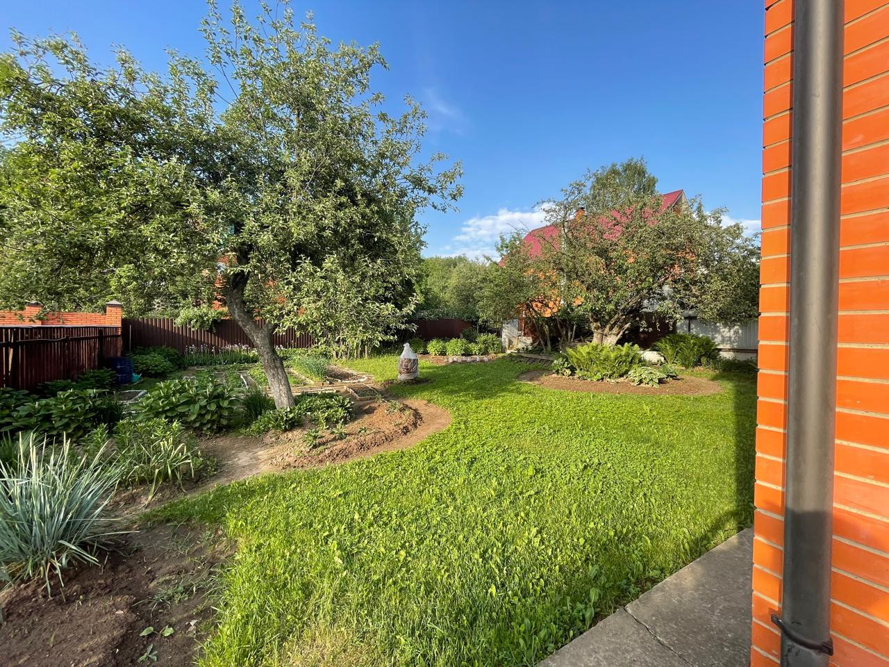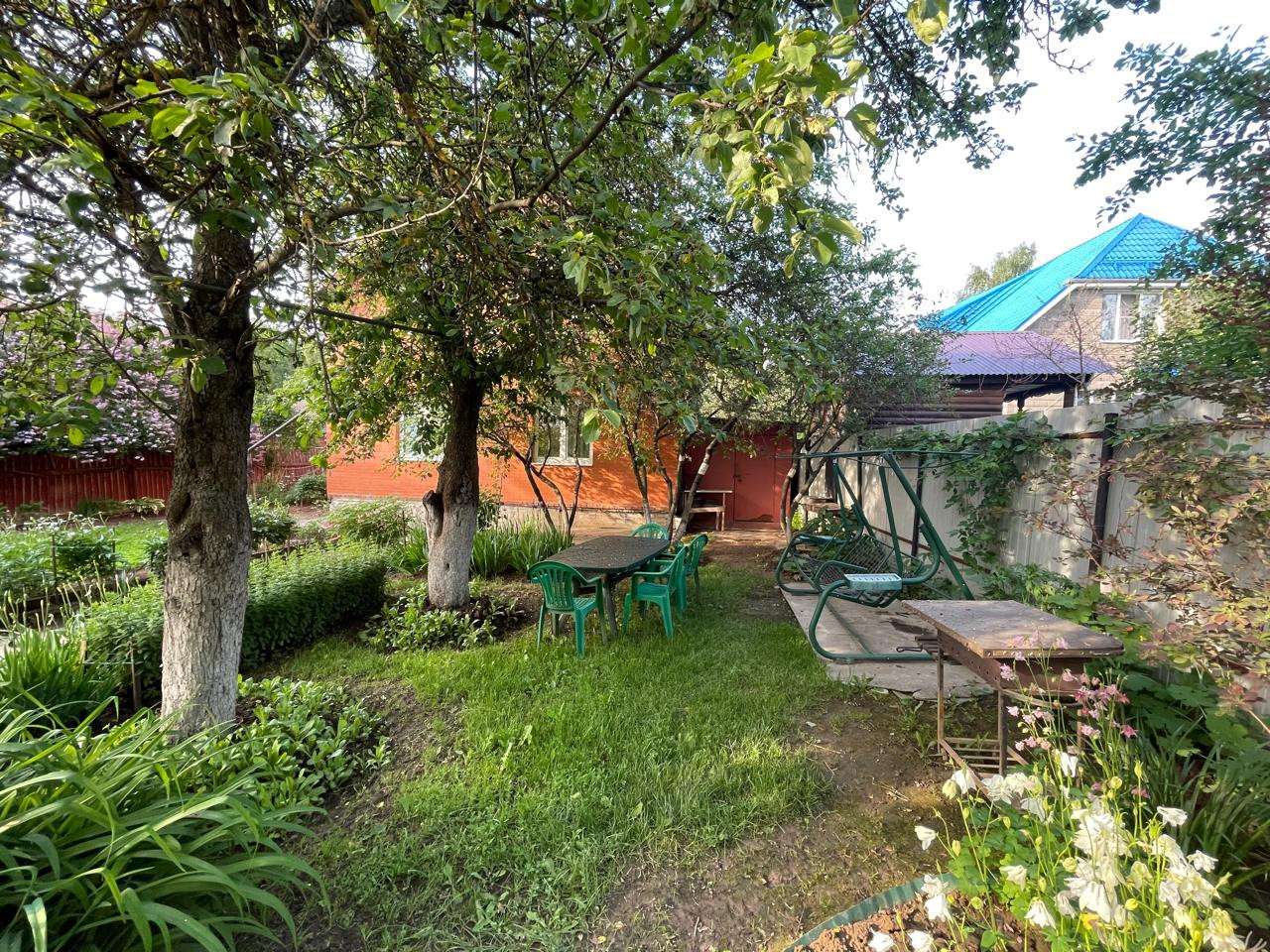 Участок с ландшафтным дизайном. На участке фруктовые деревья: 4 яблони, слива, груша, две вишни, кусты малины, смородины. Имеются кусты сирени, роз, шиповника.