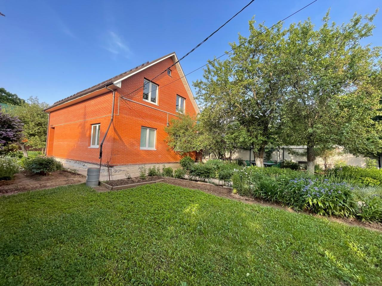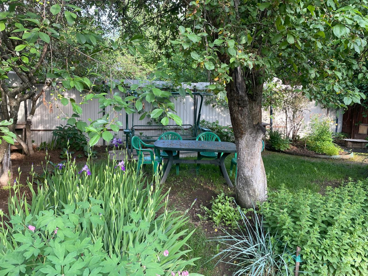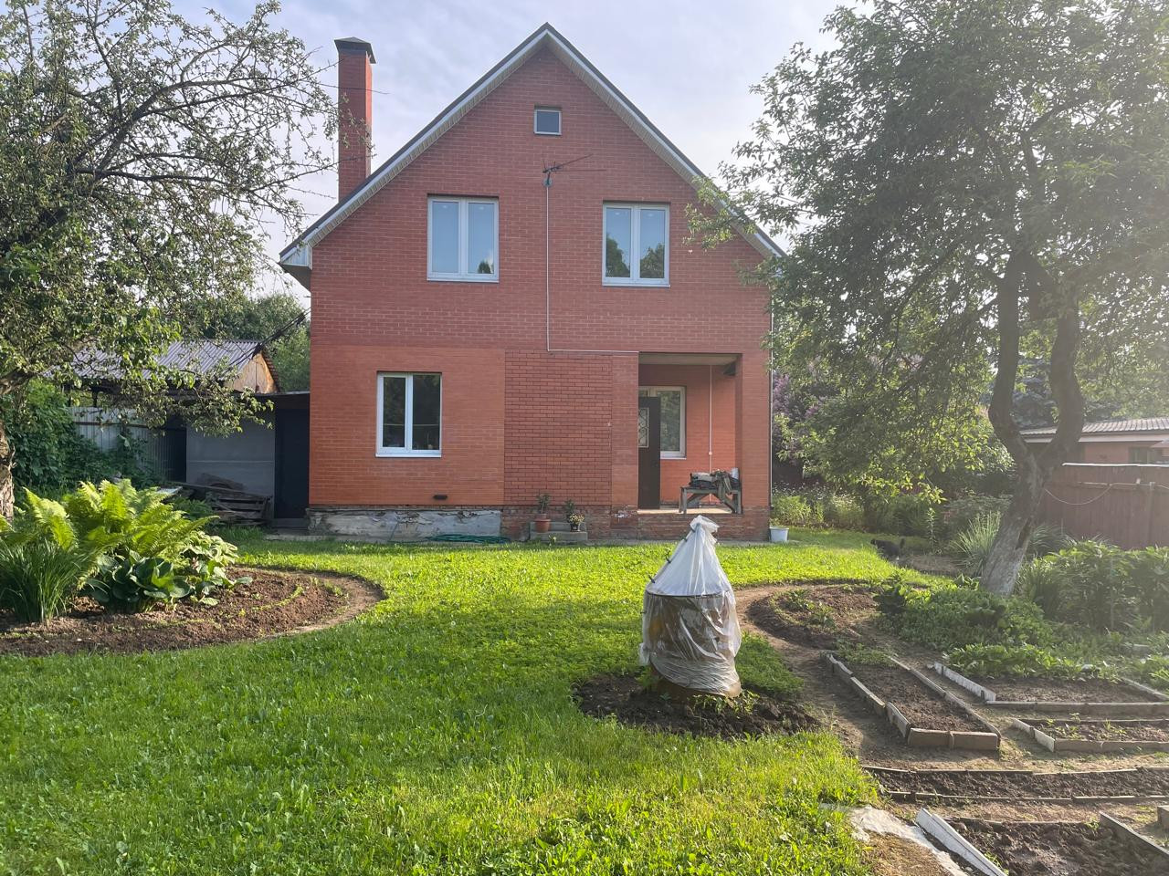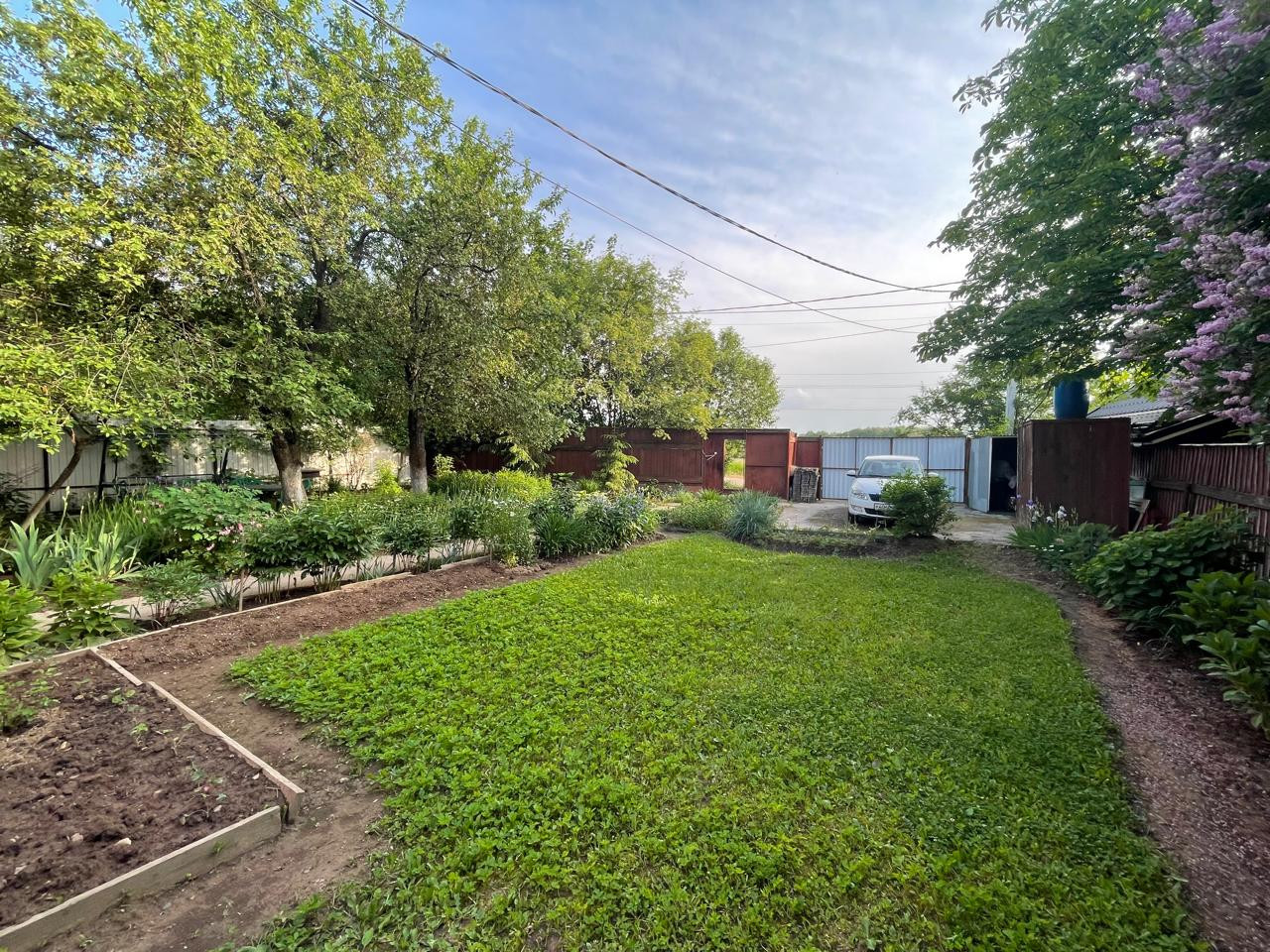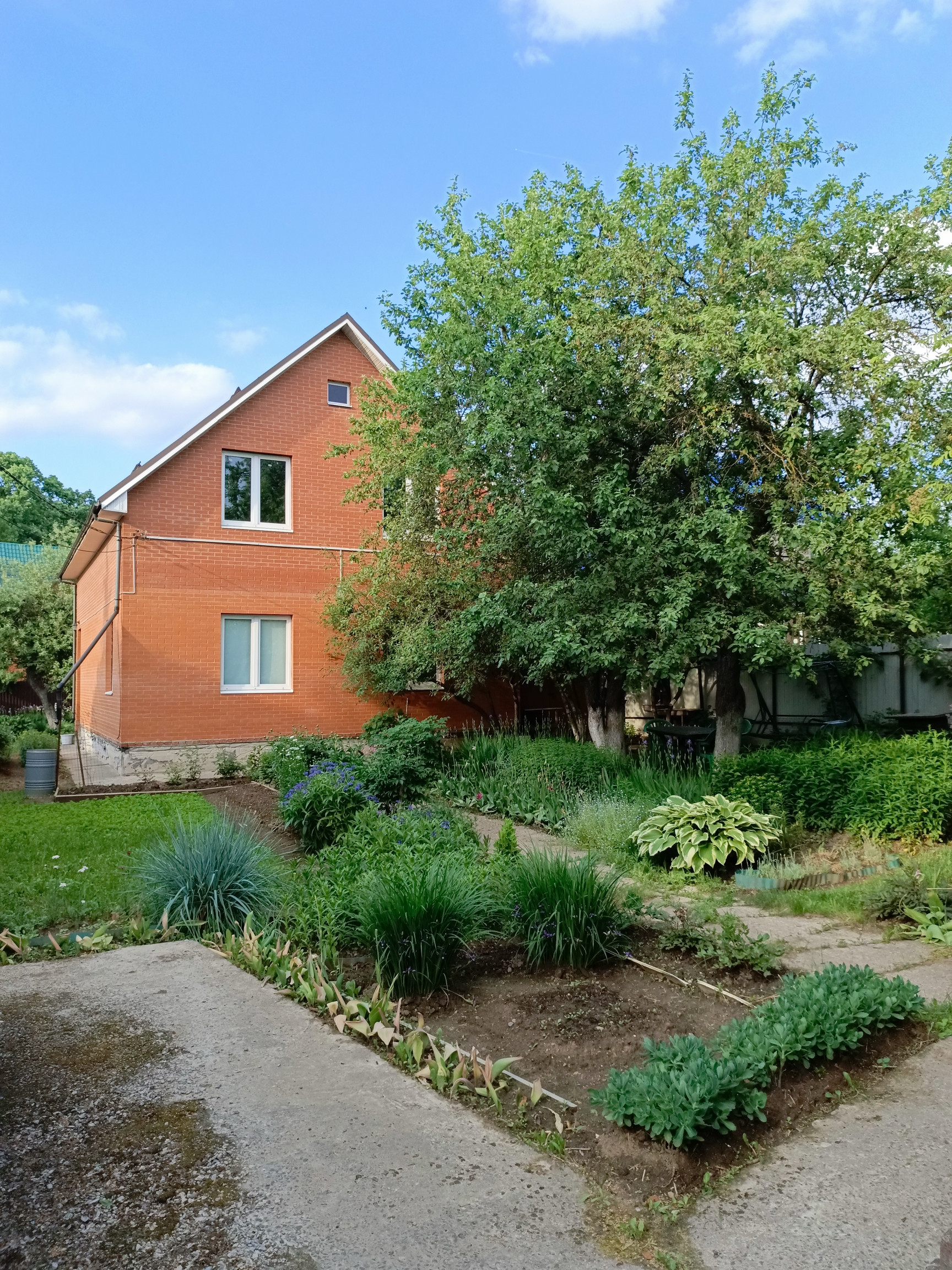 Участок с ландшафтным дизайном. На участке фруктовые деревья: 4 яблони, слива, груша, две вишни, кусты малины, смородины. Имеются кусты сирени, роз, шиповника.