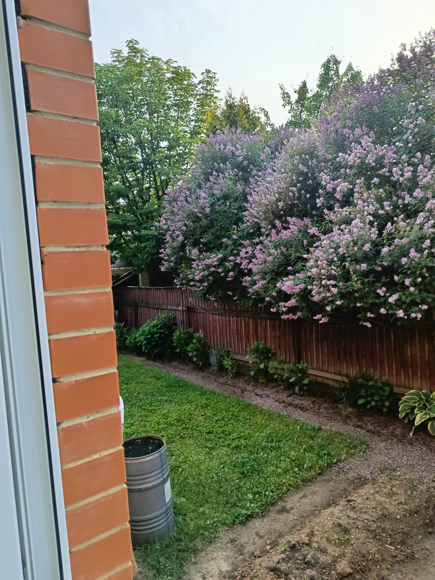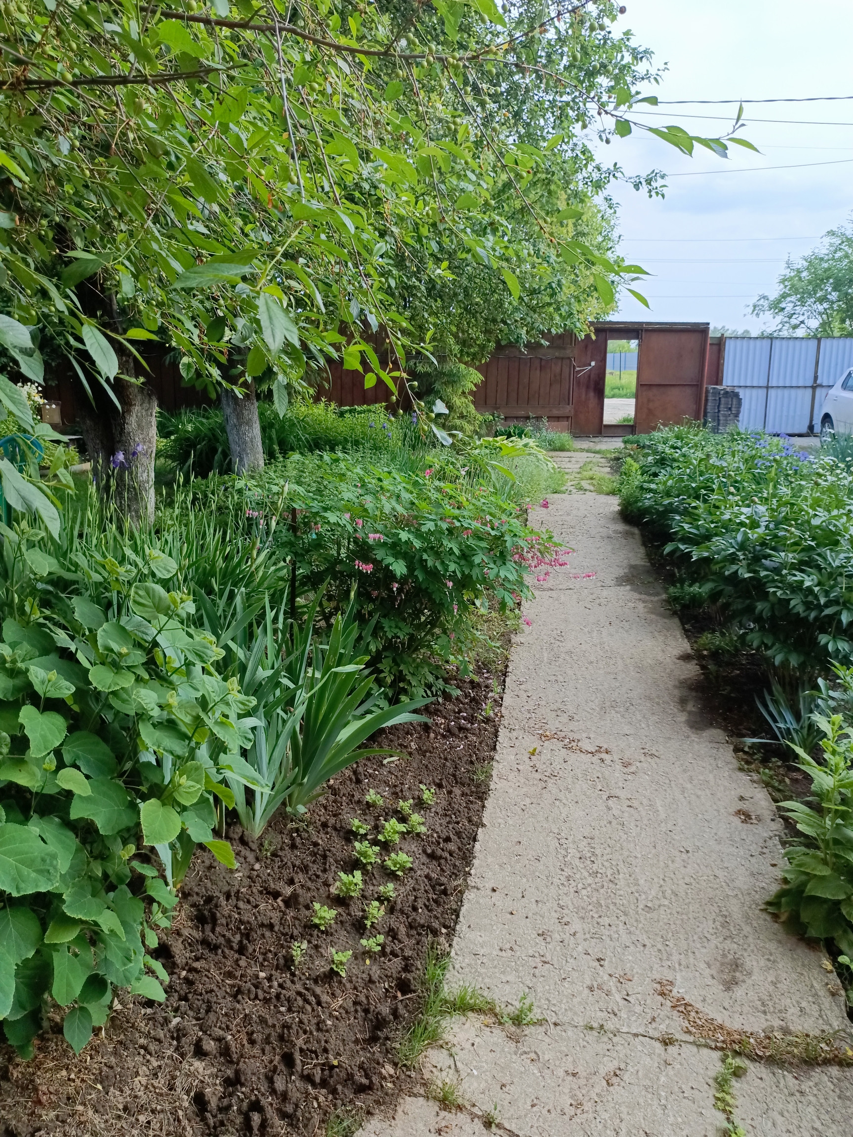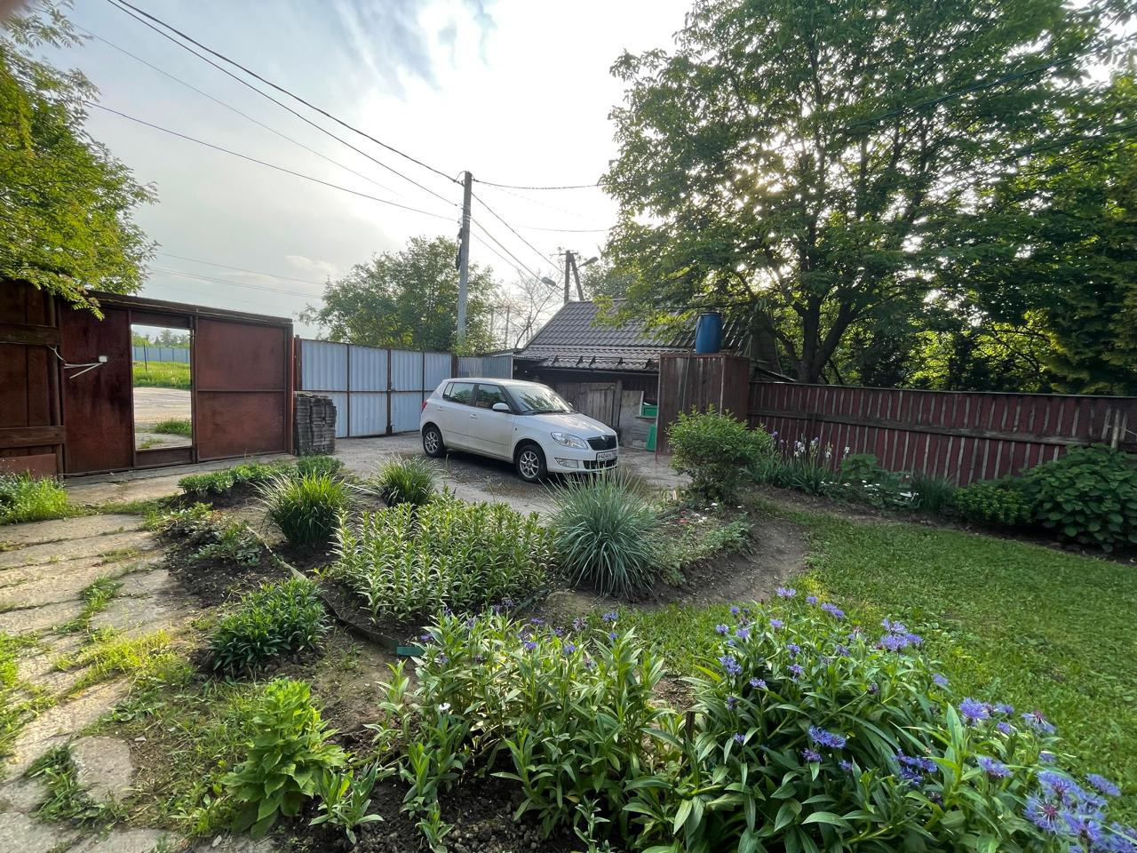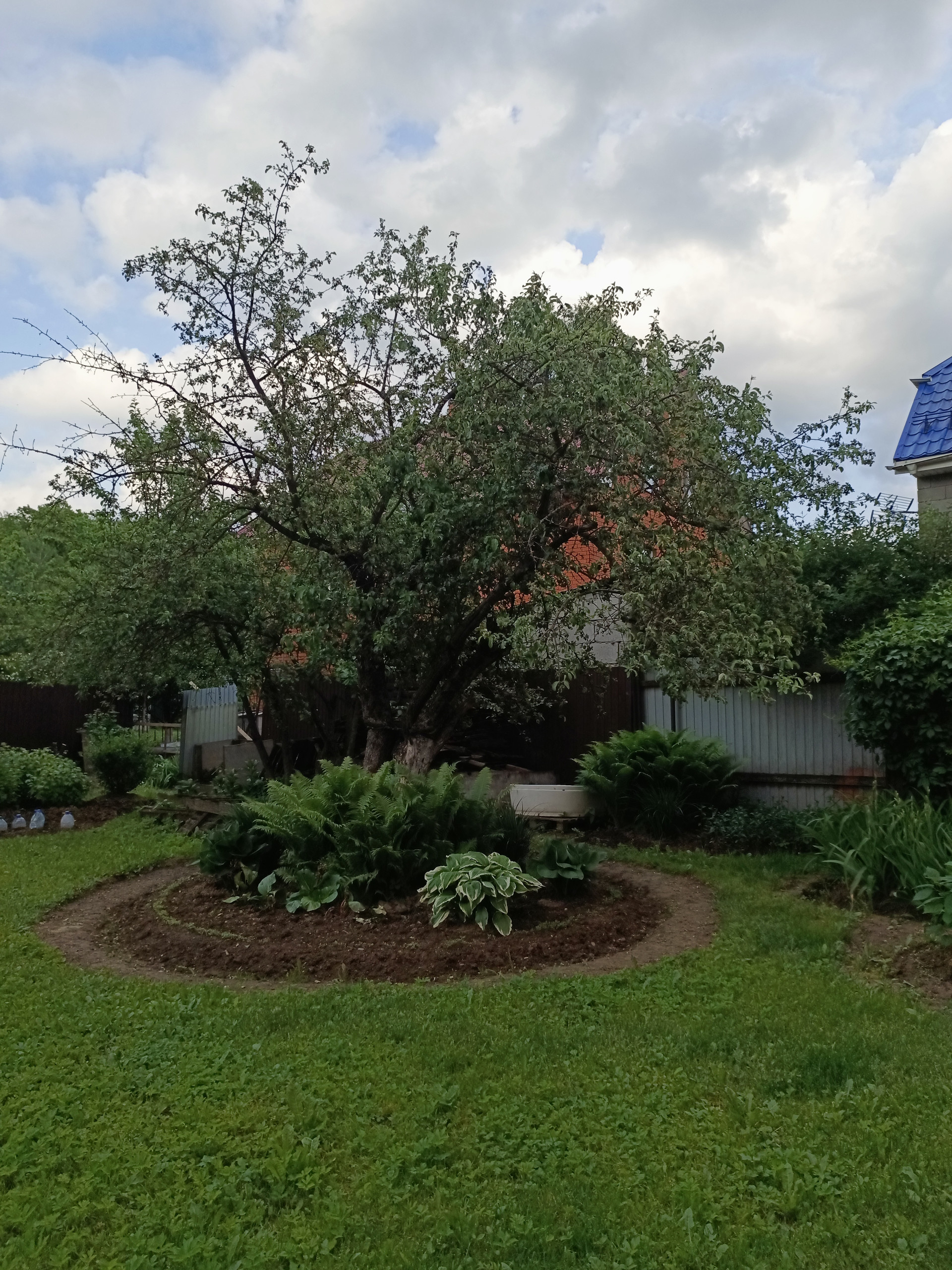 Участок с ландшафтным дизайном. На участке фруктовые деревья: 4 яблони, слива, груша, две вишни, кусты малины, смородины. Имеются кусты сирени, роз, шиповника.