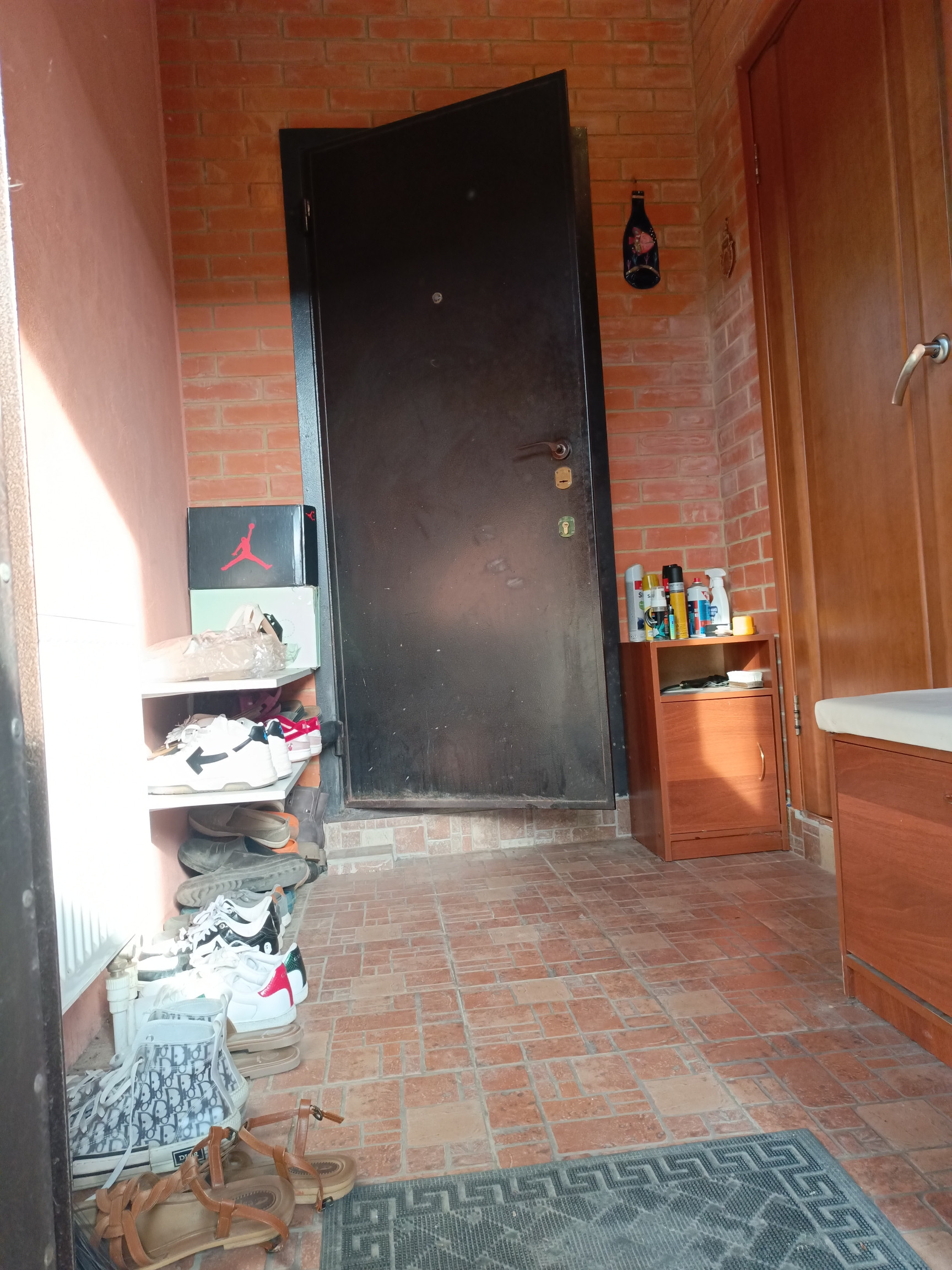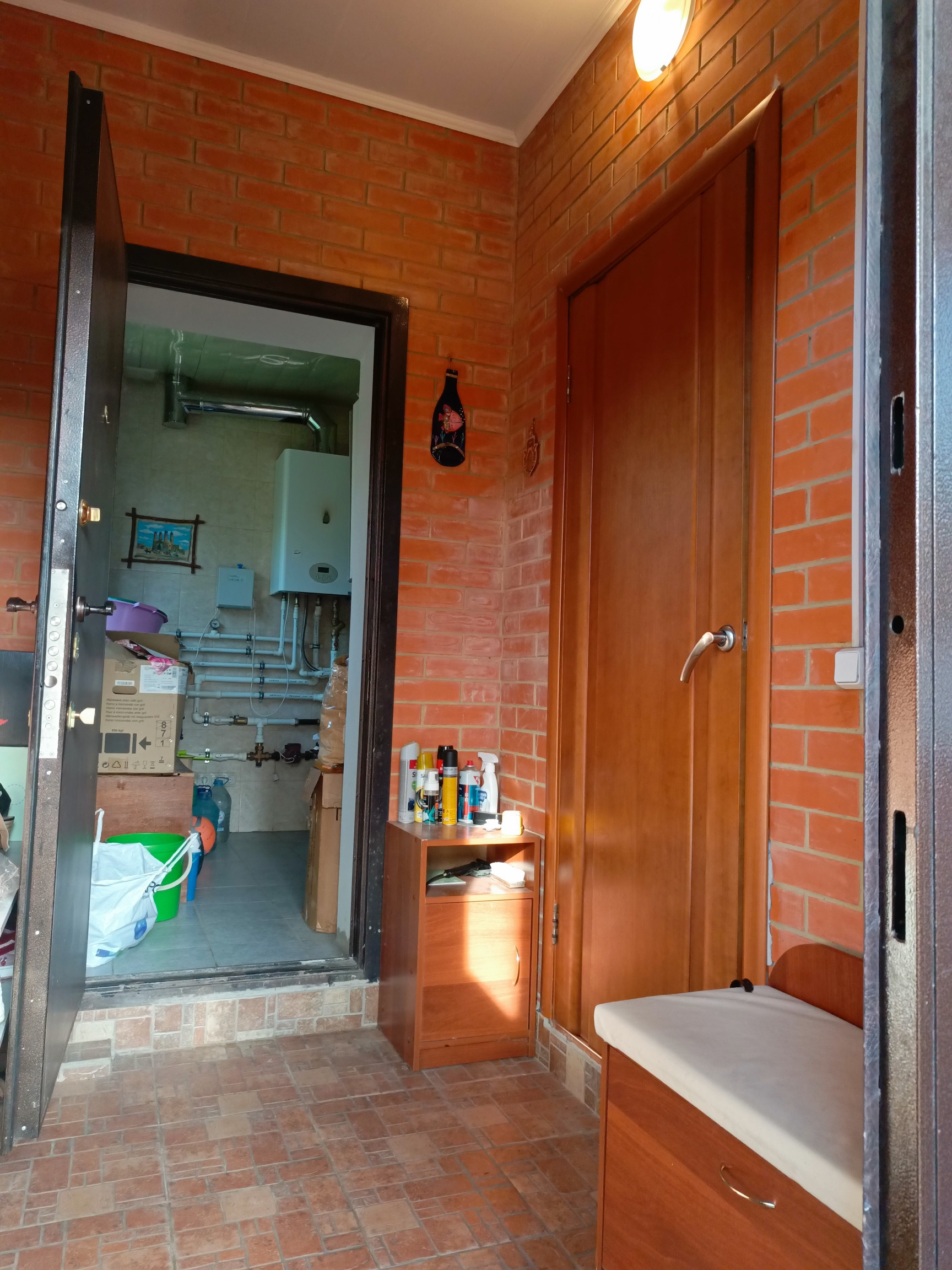 Материал дома: двойной кирпич, блоки,толщина стен - полметра. Очень тепло, зимой хватает  теплых полов, можно проживать  без включения отопления.