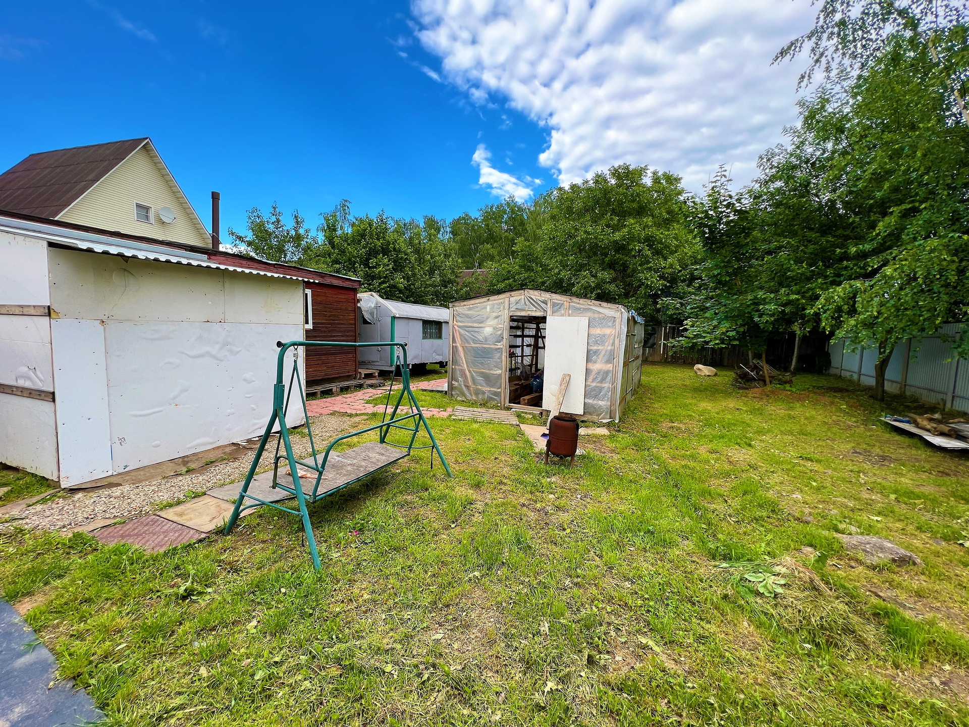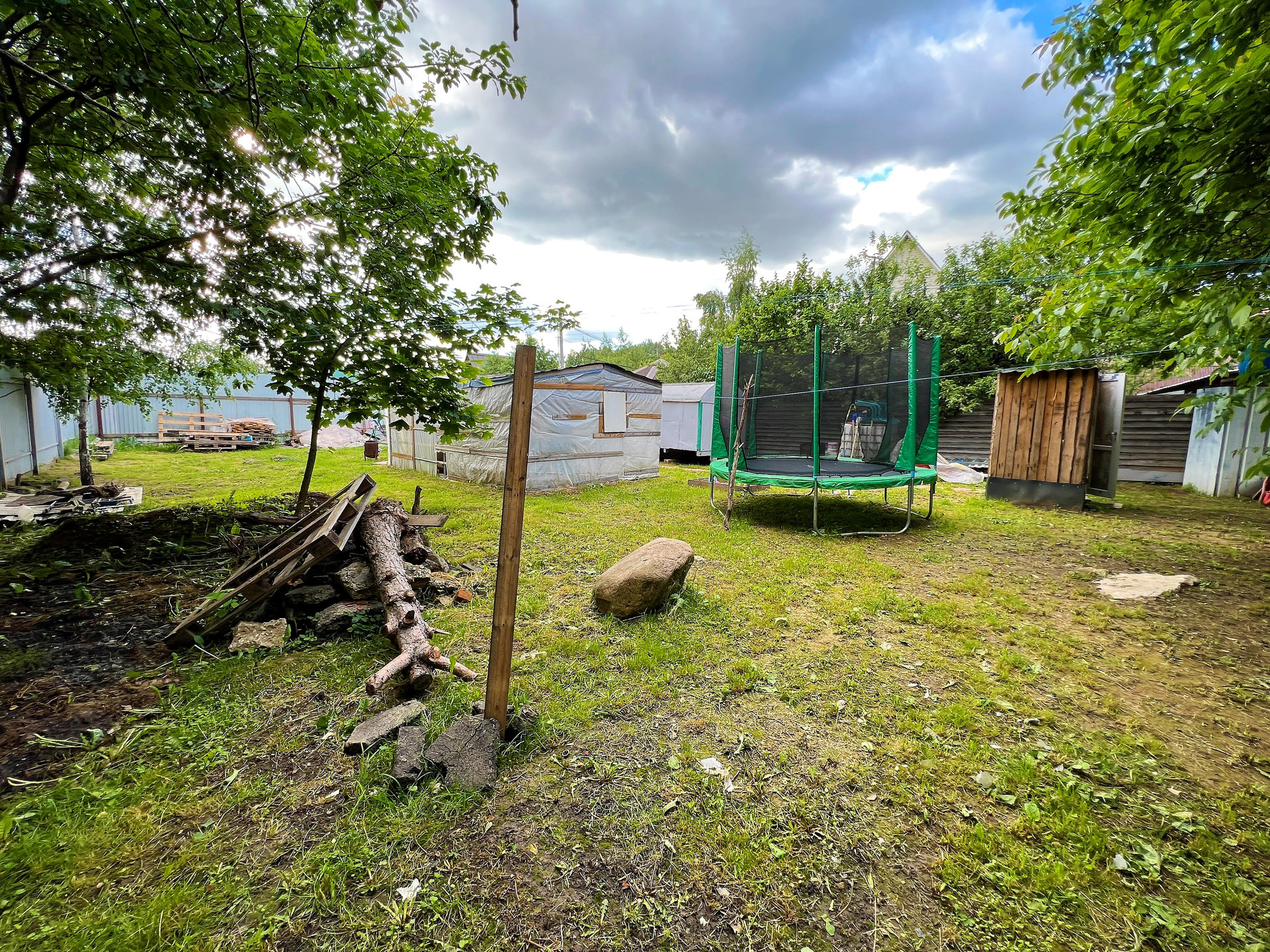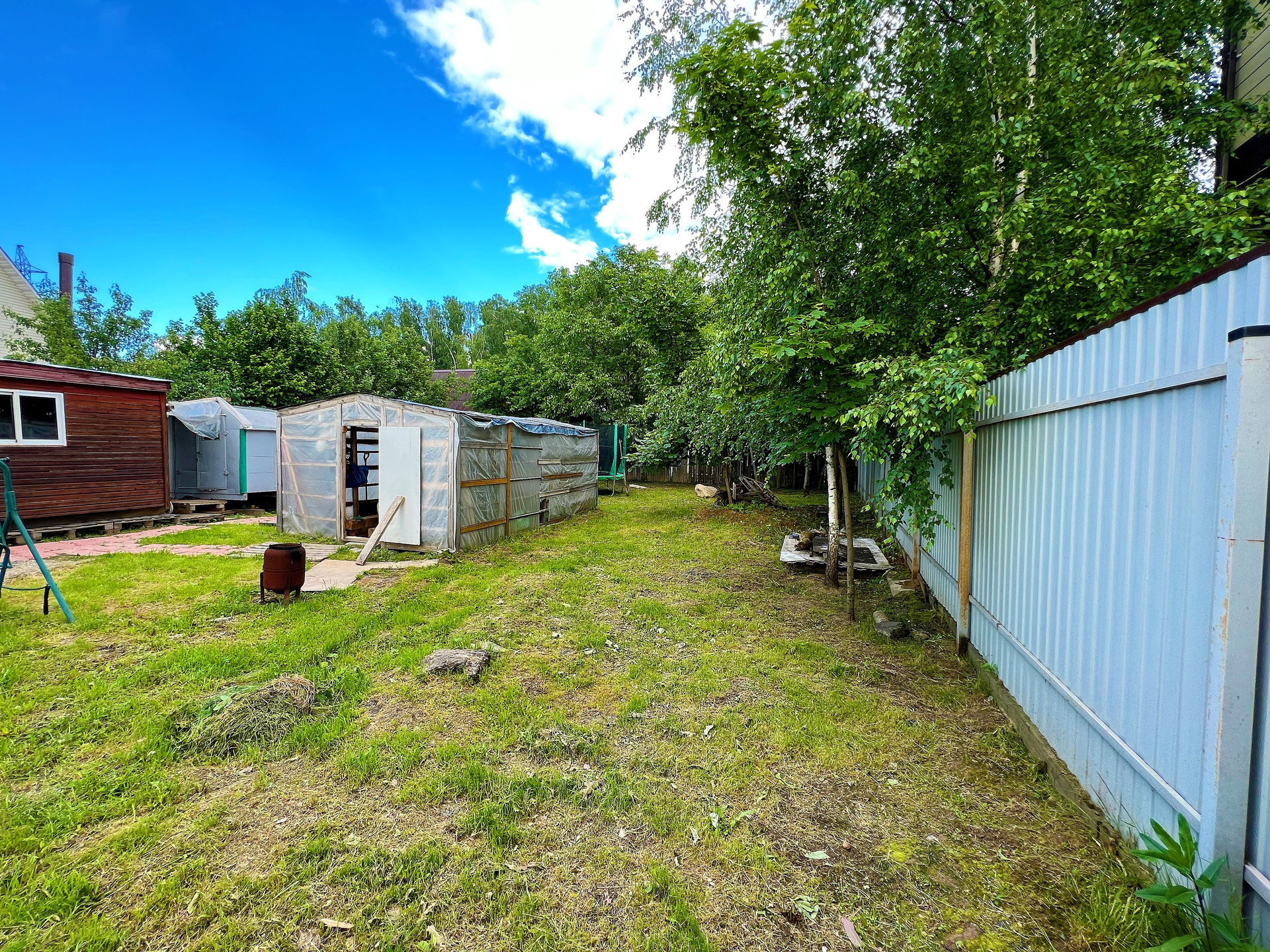 На участке растут плодовые деревья. Так же на территории бытовка, теплица, батут.