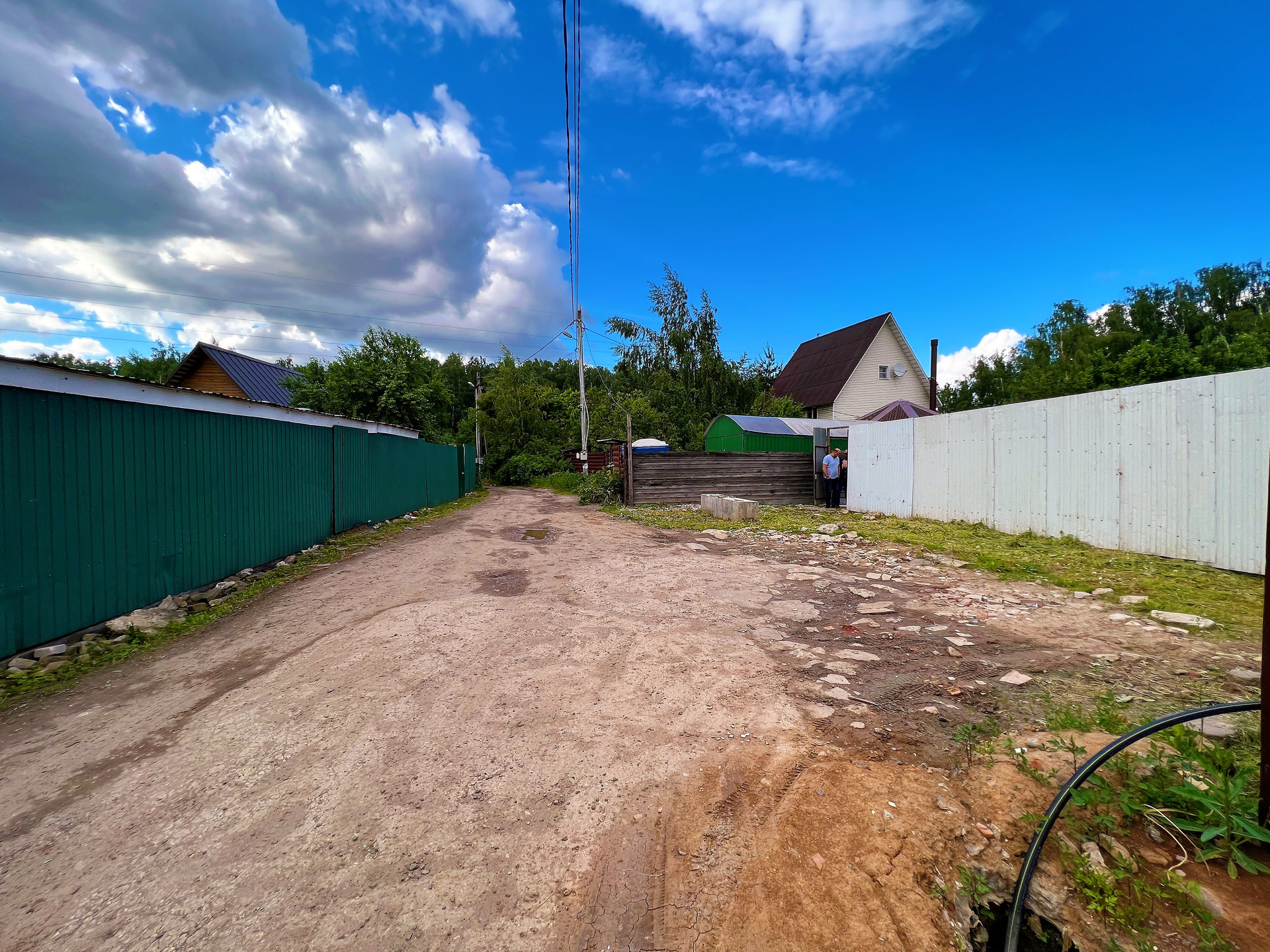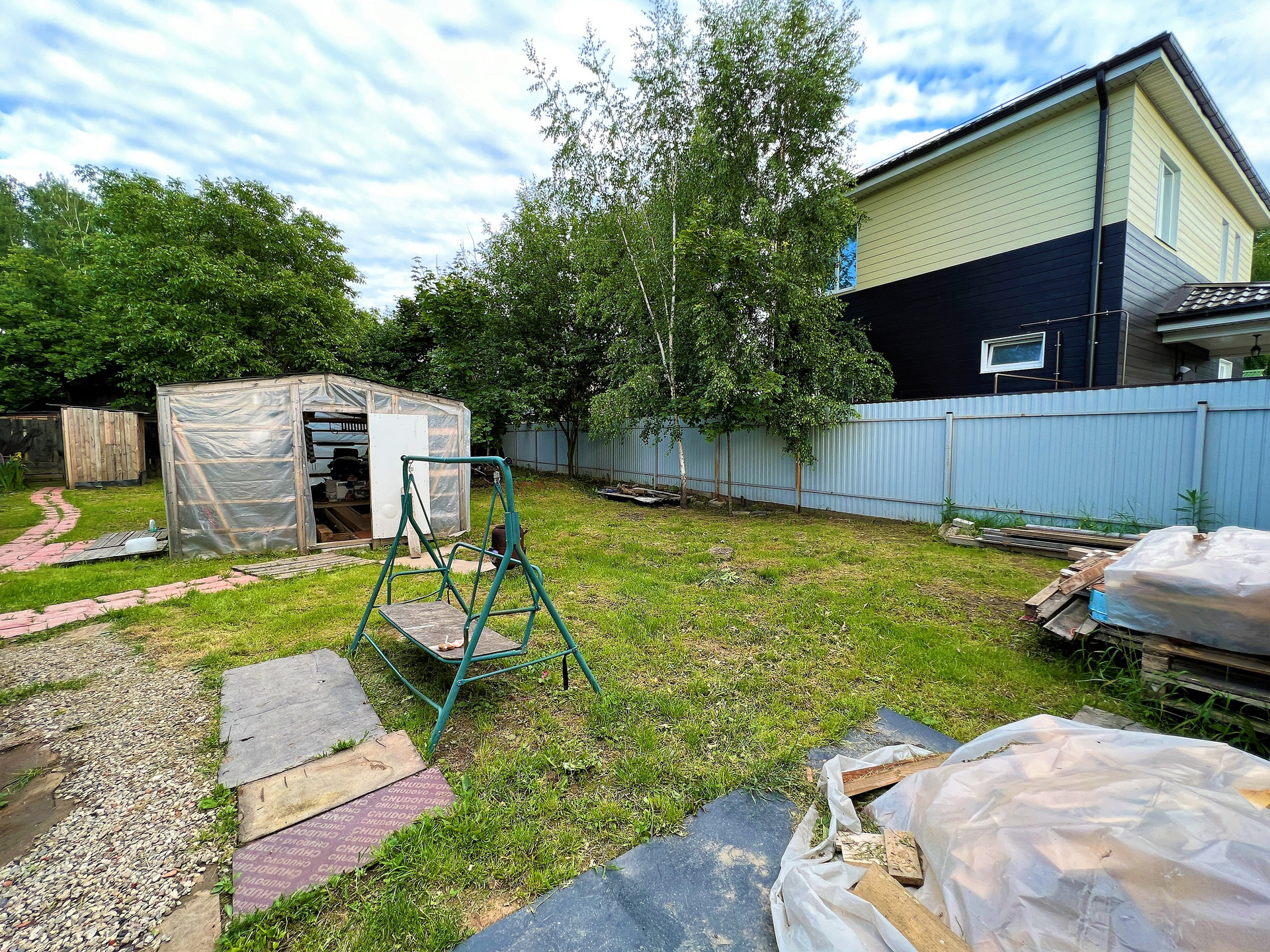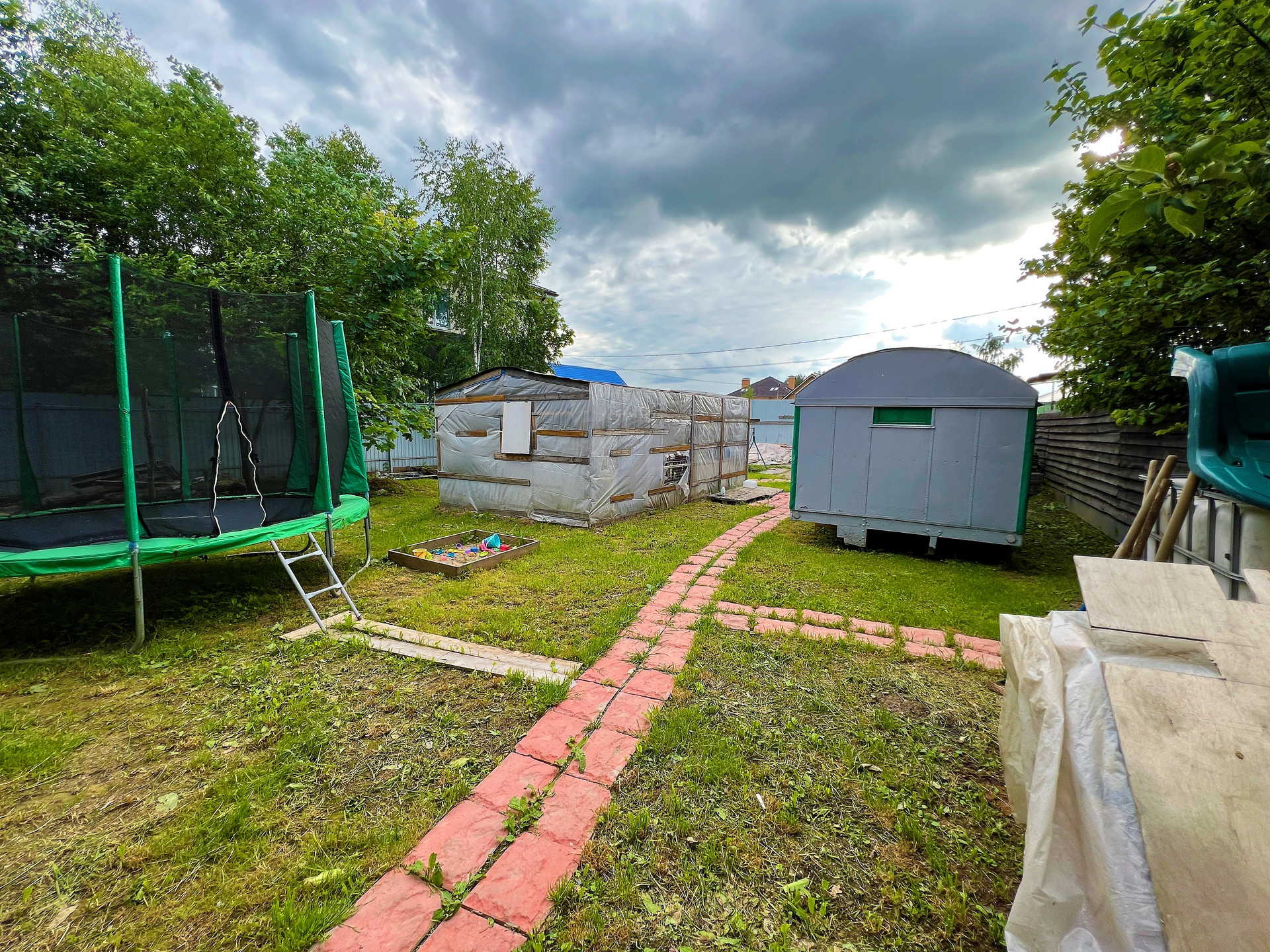 На участке растут плодовые деревья. Так же на территории бытовка, теплица, батут.