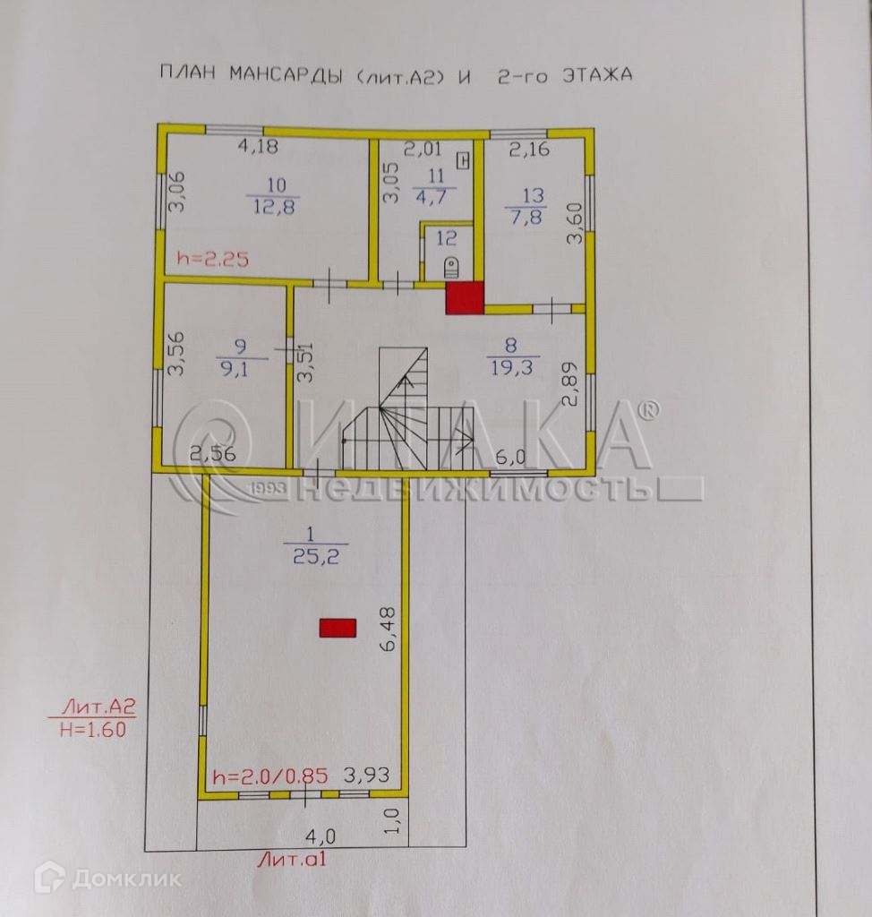 2 этаж: 4 комнаты – 25,2+12,8+9,1+7,8 м2, раздельный санузел - 6 м2. Холл 19,3 м2 с лестницей на первый и третий этажи. Выход на лоджию - 2м2.