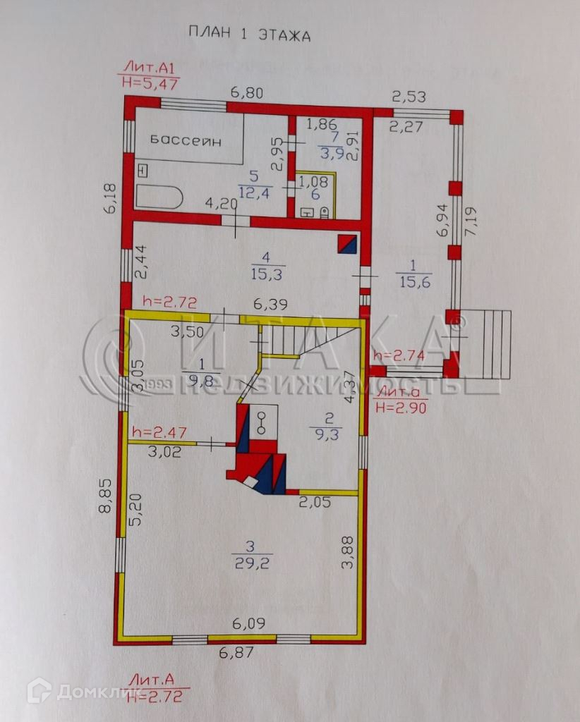 1 этаж: - комната с камином + кухня + сауна + бассейн + веранда = 60,8 м2, комната -29,2м2, прихожая -15,3 м2 +9,8 м2, санузел-1,4 м2, бассейн -12,4 м2, сауна-3,9м2, веранда-15,6 м2.