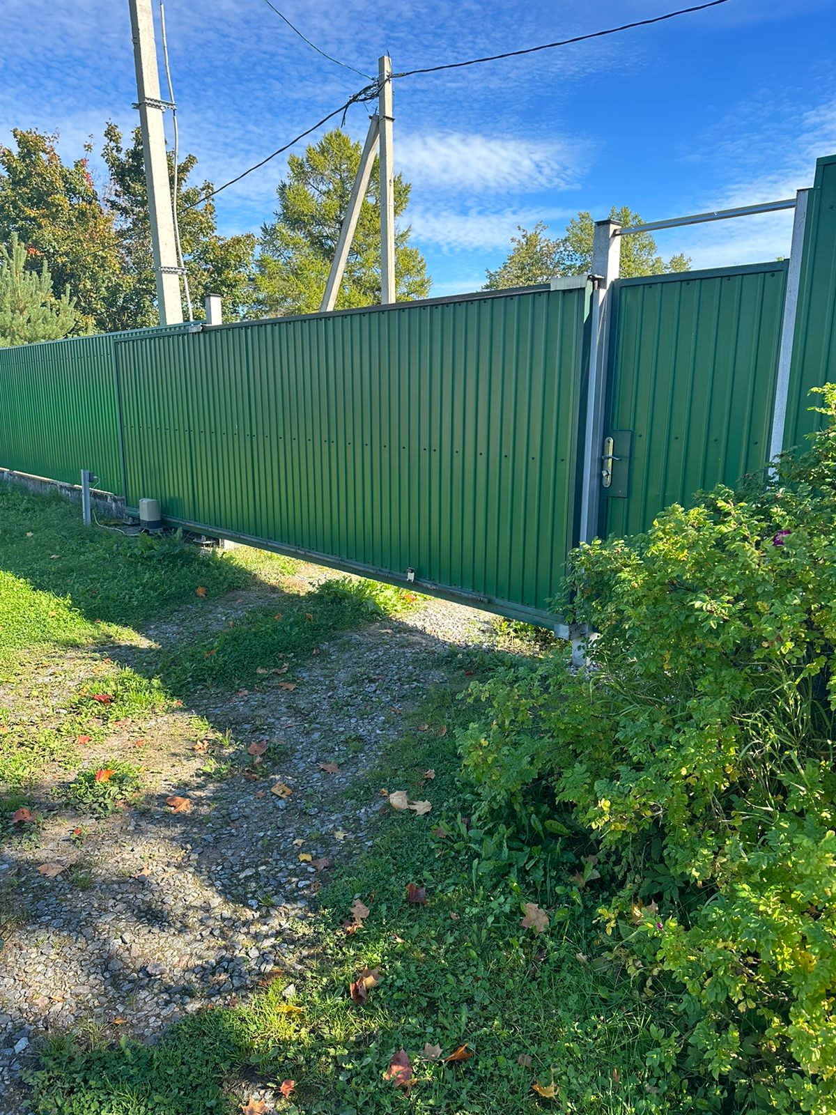 Участок огорожен забором, забор стоит на фундаменте. Откатные ворота с заездом на участок. Много парковочного места.