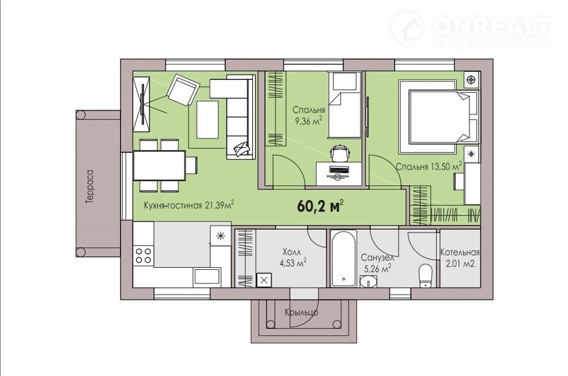 В доме 2 спальни, просторная кухня-гостиная, санузел, котельная с зоной хранения.