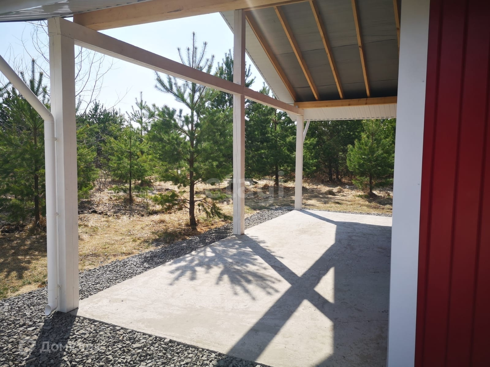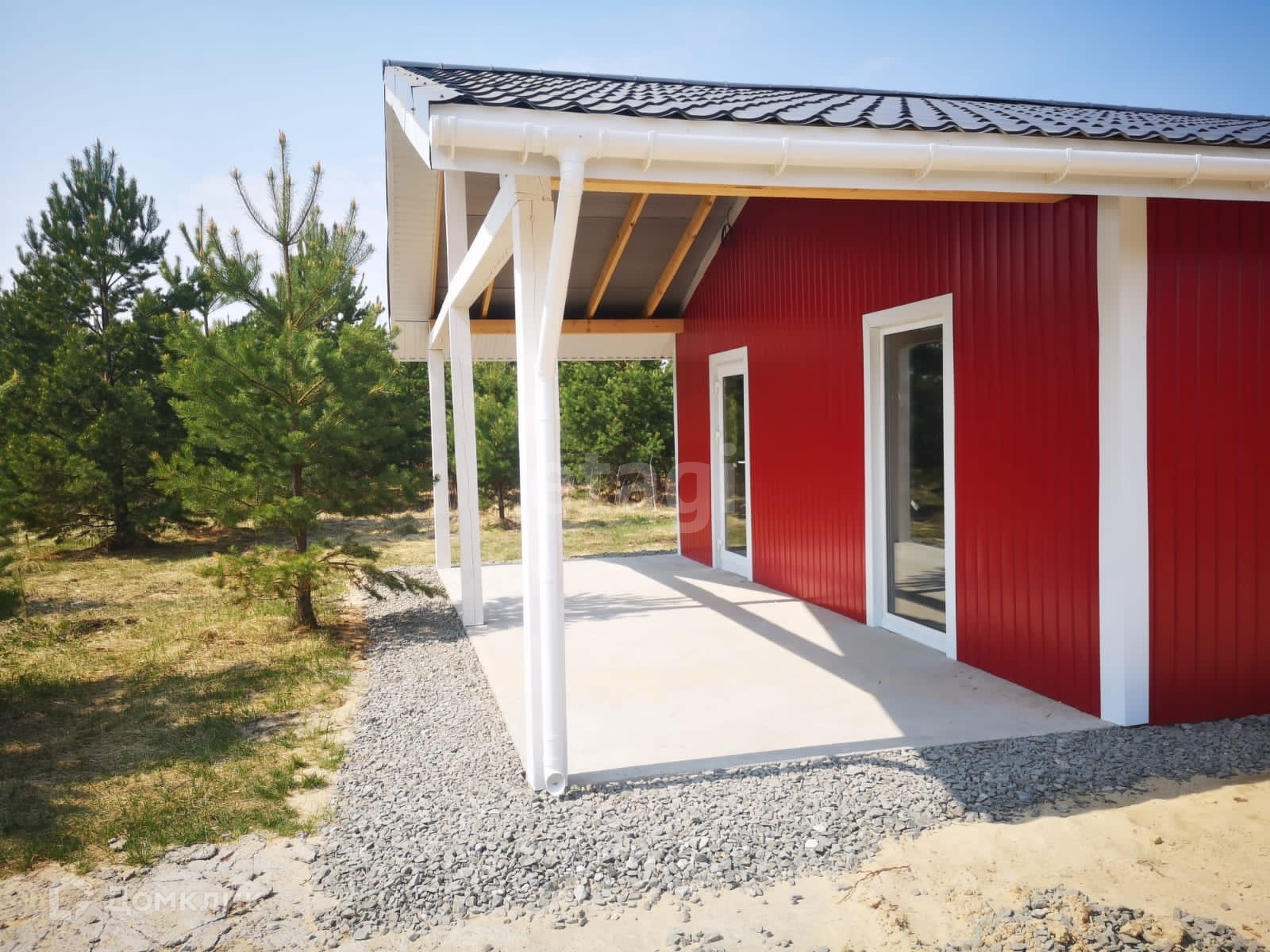 На участке имеются сосны, березовая полоса деревьев.