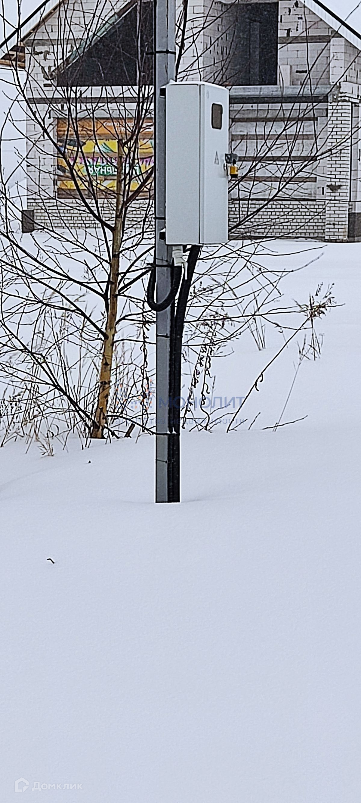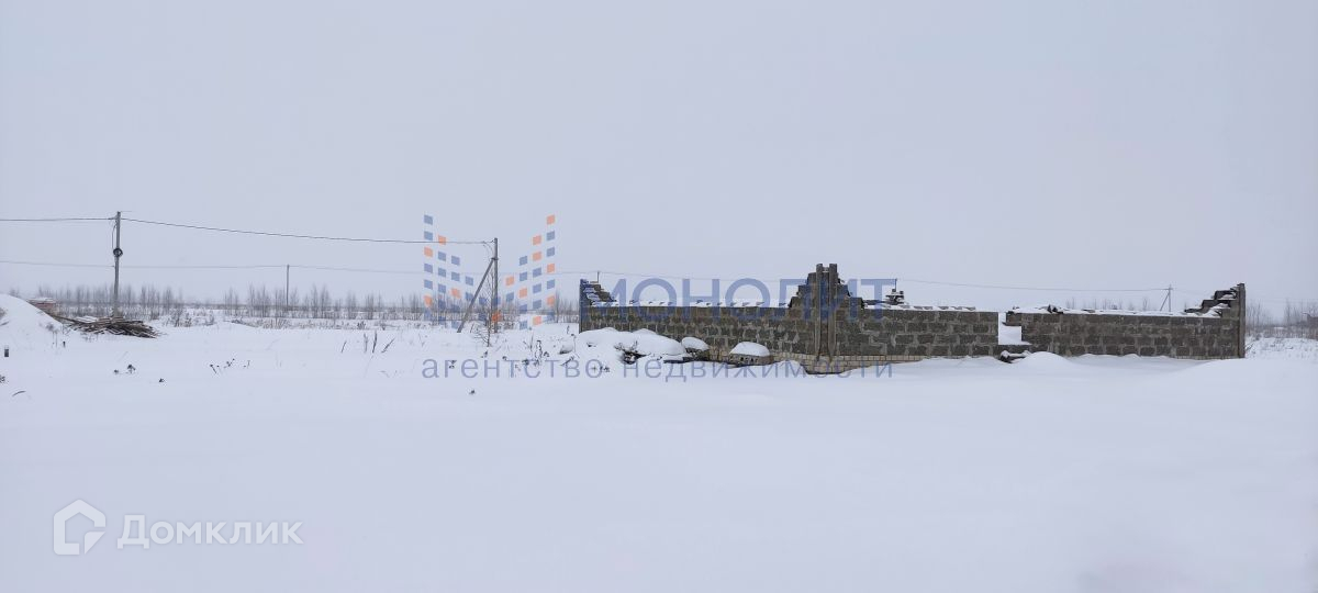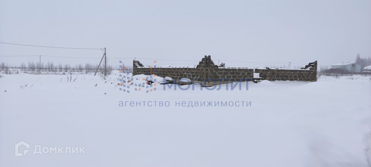 В продаже земельный участок, ровный, правильной формы, ухоженный. На участке имеется коробка под дом с блочным фундаментом и цокольным этажом (высота цоколя 2м, в половину этажа), меж этажные перекрытия ж/б плиты.  Коробка первого этажа возведена наполовину, строили из арболитовых блоков, стройка была не на продажу. Имеется проект дома, размер первого этажа 15,9м * 11,5м.. На участке есть скважина с водой и электричество, газ в процессе подведения по всей улице.