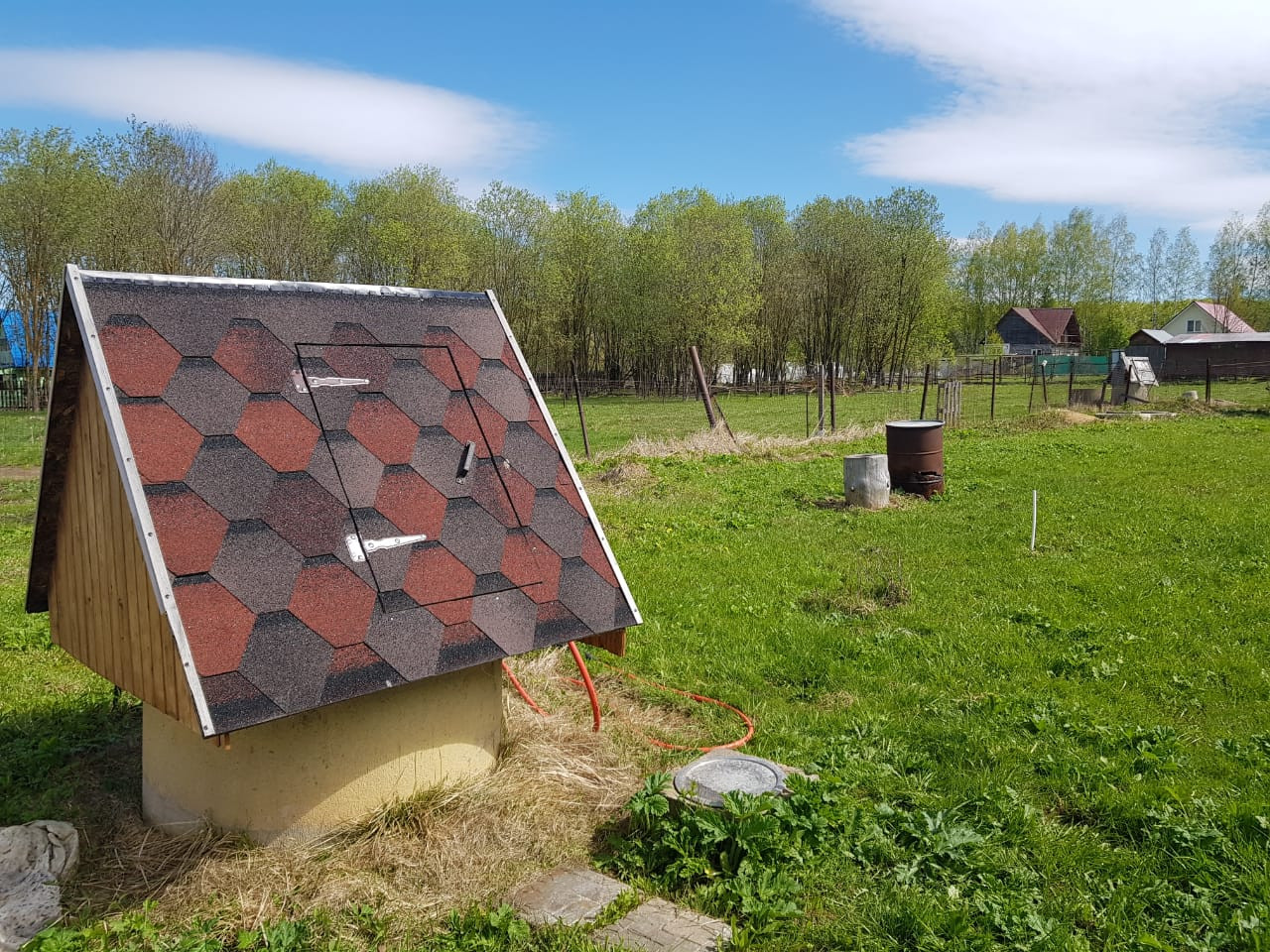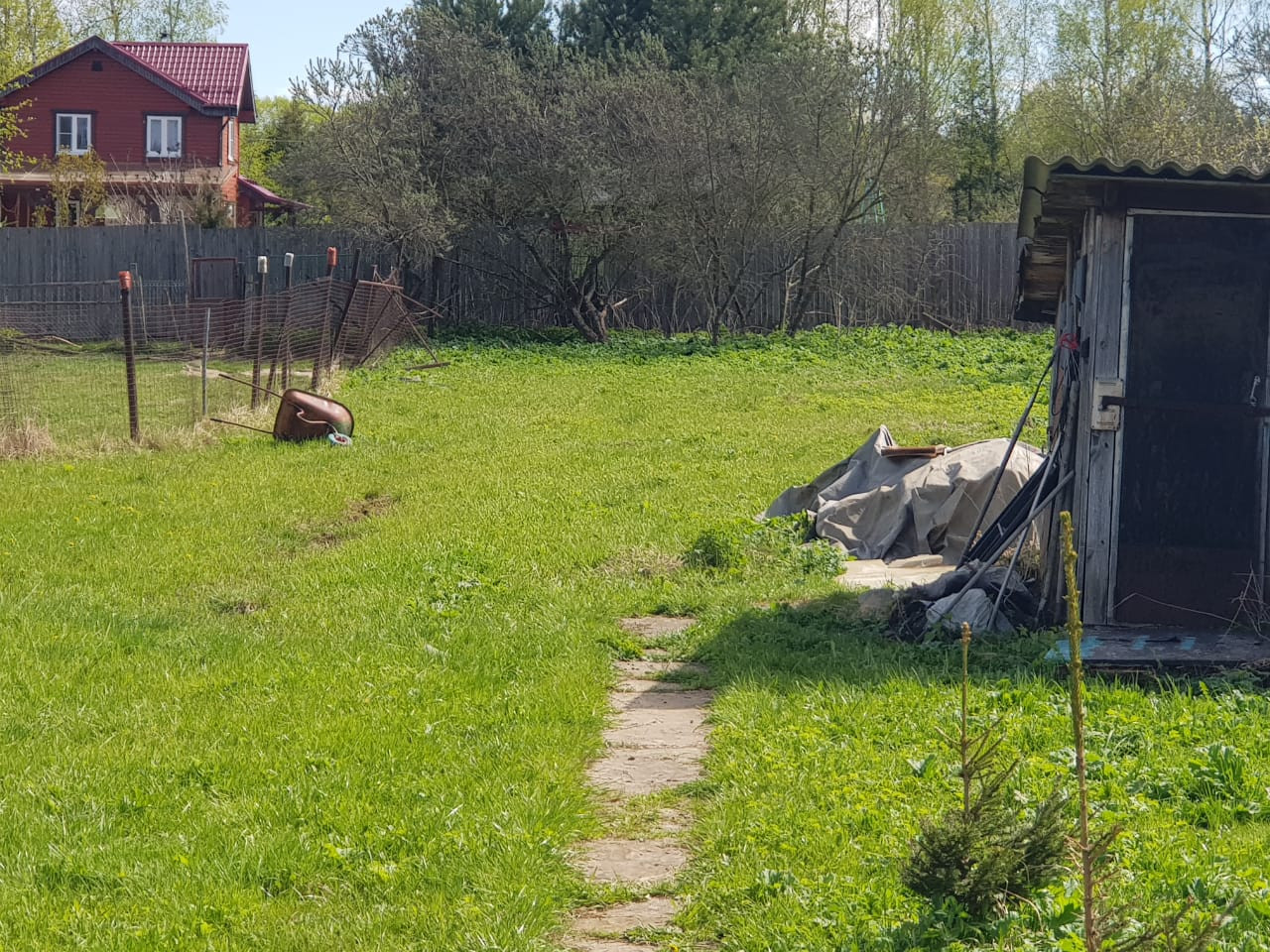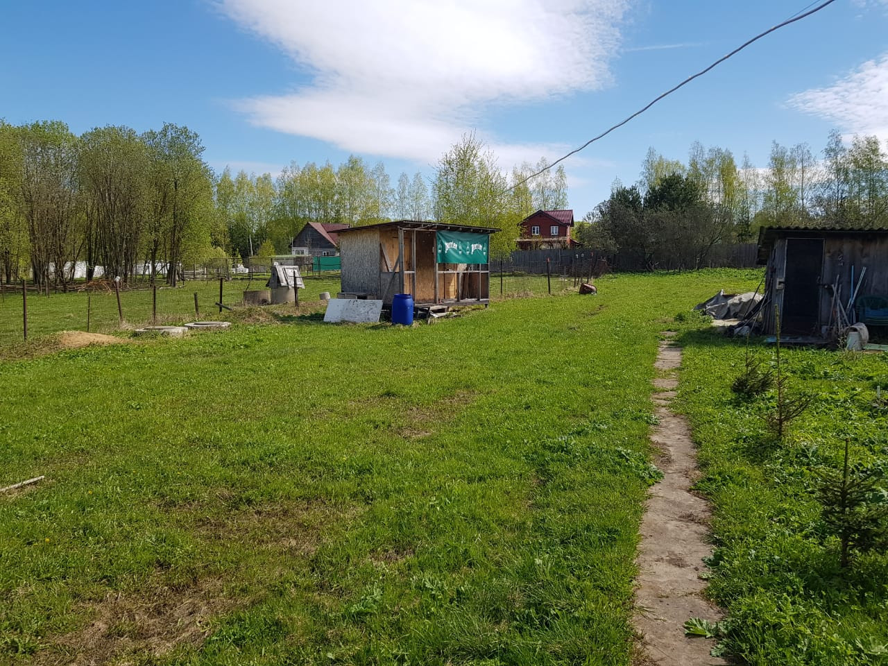 Участок огорожен, обработан, правильной формы, на участке вагончик, хоз. постройка, туалет, колодец (6 колец), септик.