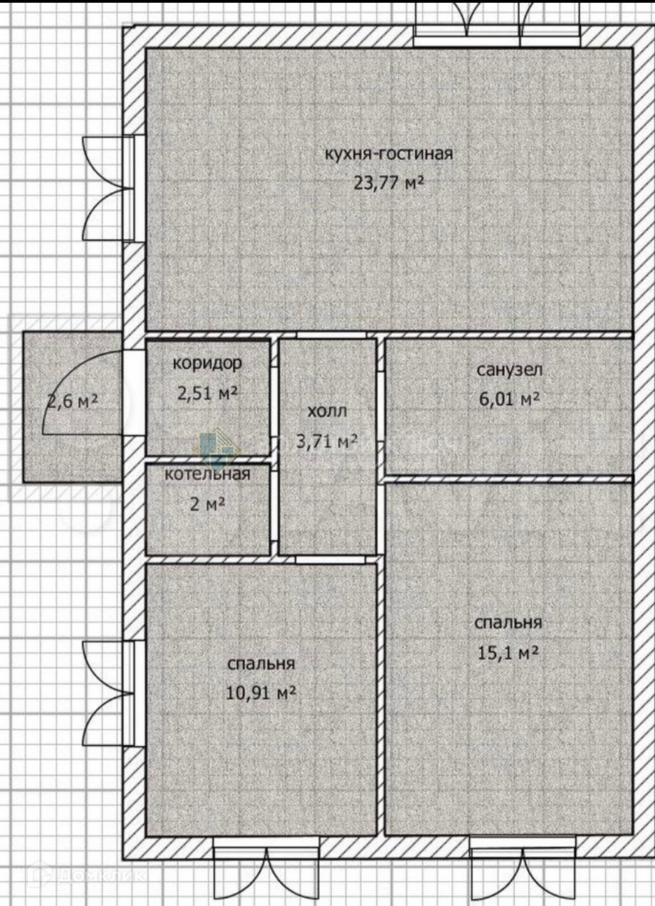 В доме 2 спальни (15+10 кв. м.), кухня-гостиная (23 кв. м.), прихожая (3 кв. м.), холл (3,7 кв. м.), санузел (6 кв. м.) и котельная (2 кв. м.).