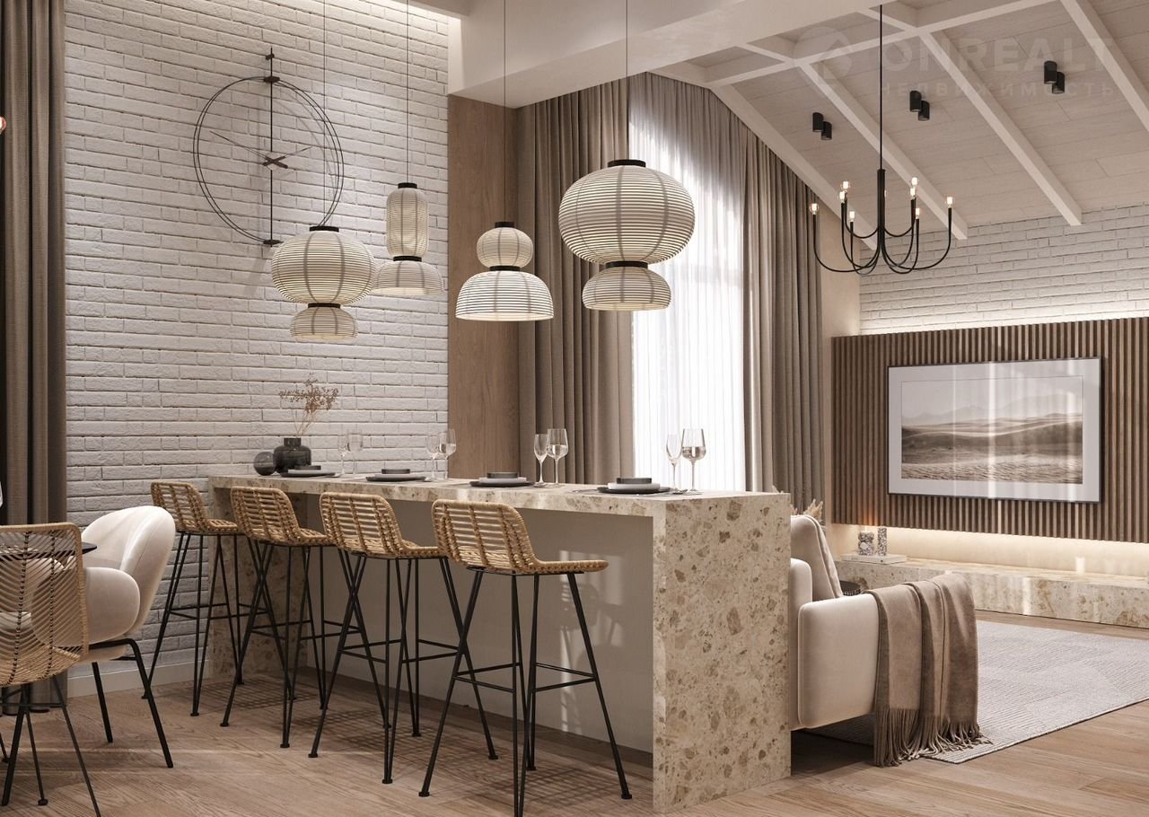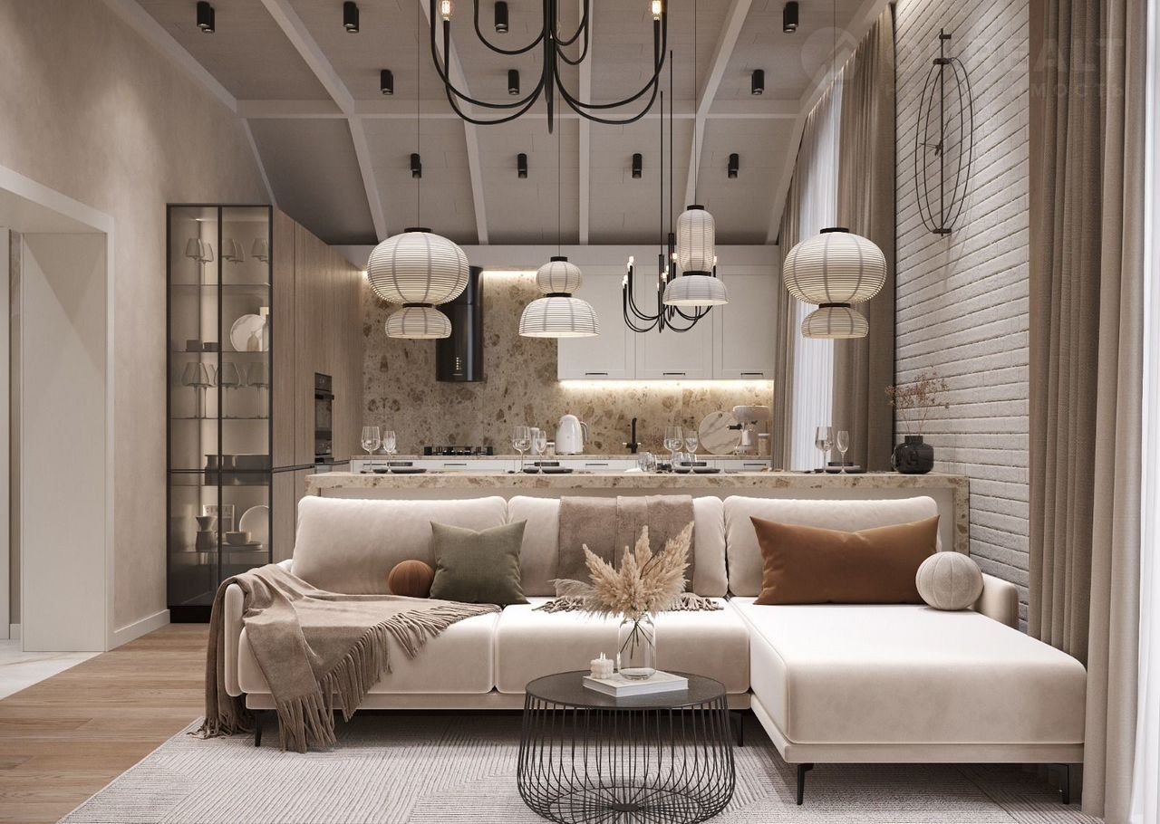 В доме совмещенная кухня-гостиная, отдельная комната/кабинет и что очень важно - гардеробная.