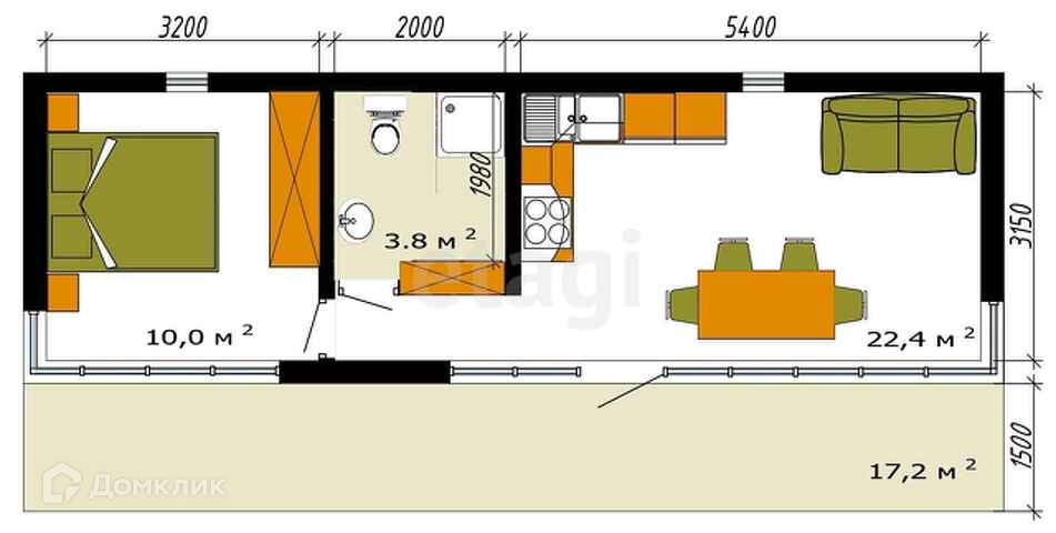 Общая площадь 53.4 м2
