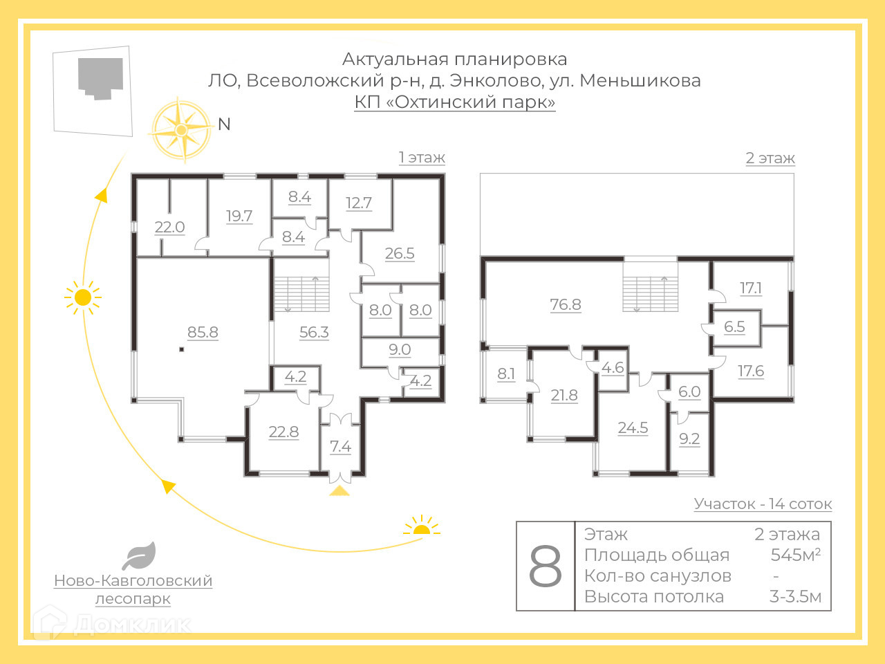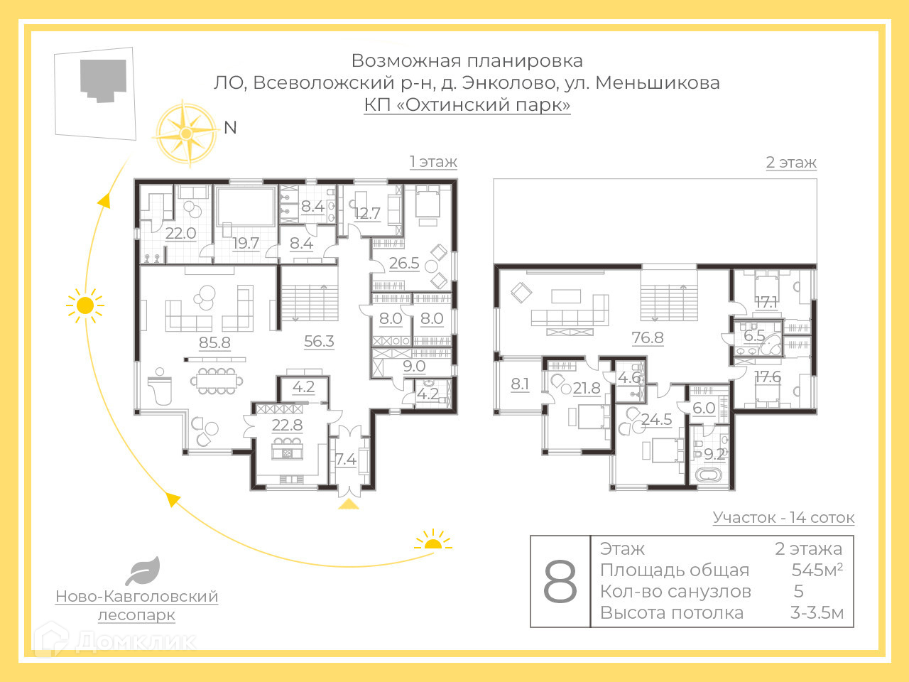 Общая площадь 545 кв/м, построен на участке ИЖС площадью 14 соток, в непосредственной близости от реки Охты.