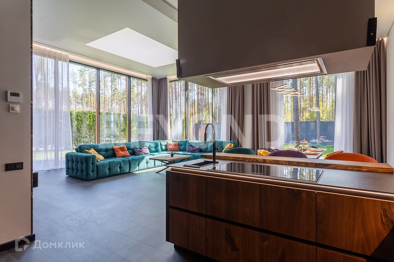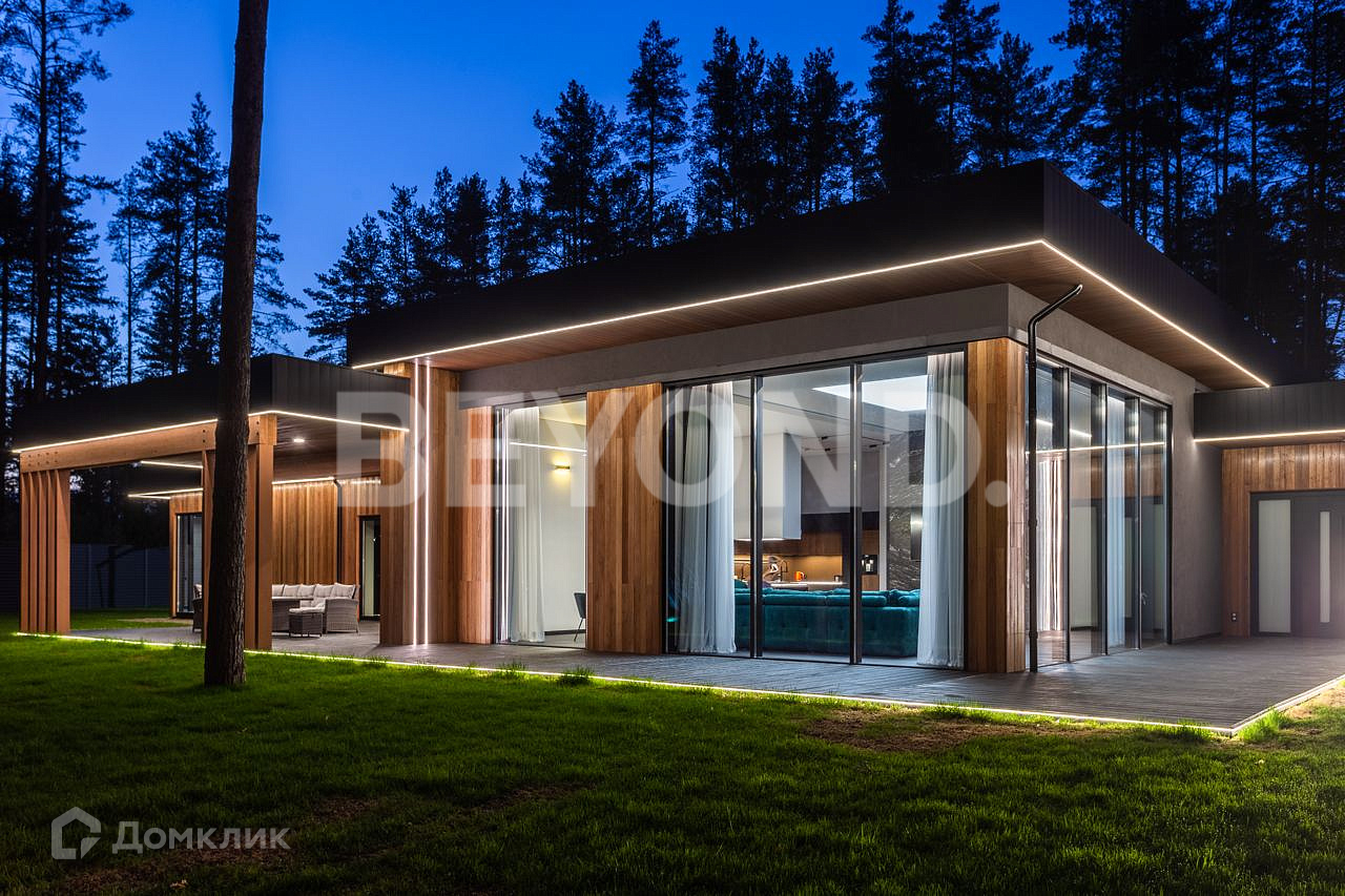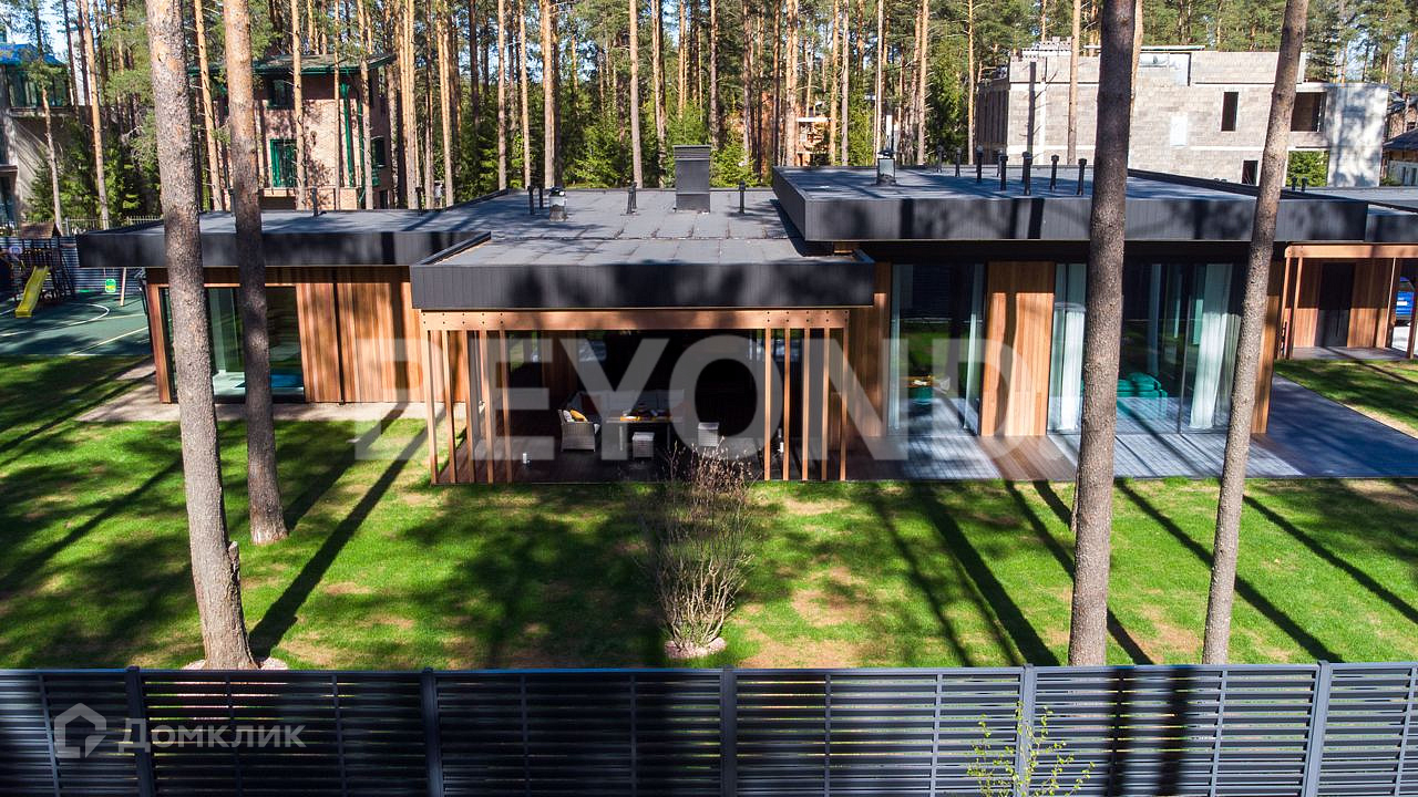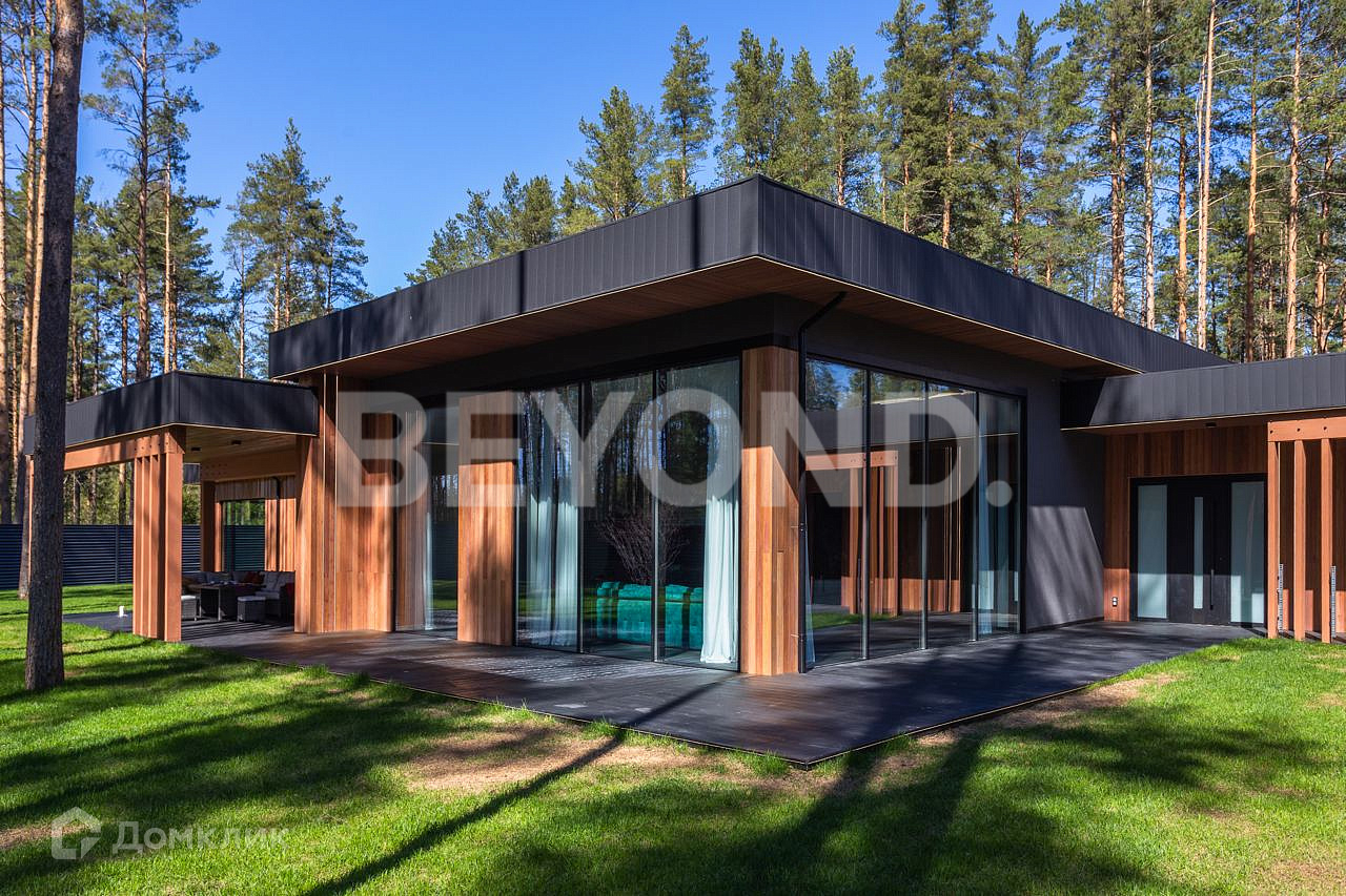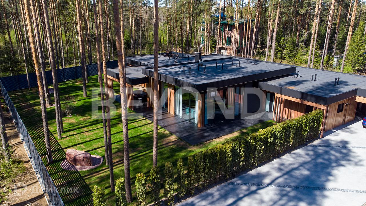 Одноэтажный, современный, стильный дом  общей площадью 590 кв. м, на участке 23 сотки в окружении вековых сосен. Есть возможность увеличения участка до 43 соток земли. Внешняя отделка дома выполнена по индивидуальному дизайн-проекту. Основной материал - красное дерево Меранти, известное своей долговечностью. Бесшовное панорамное остекление высотой 4 метра не только визуально расширяет пространство, но и дает невероятную естественную инсоляцию. Дом полностью меблирован, готов для проживания. Ремонт и отделка выполнены из самых дорогих и современных материалов. Эргономичная планировка разделяет дом на приватную и гостевую зоны.  В приватной зоне: мастер-спальня с большой гардеробной и собственной ванной комнатой, две детские комнаты и две гостевые. Есть постирочная и хозяйственная комната. В гостевой зоне: просторная кухня-гостиная, оборудованная мебелью и техникой с учетом всех последних тенденций, откуда можно пройти на террасу, где расположена столовая зона с местом под барбекю.  Дом высокотехнологичен и оборудован самой современной климат-системой вентиляции, рекуперации, подогревом и кондиционированием воздуха. Отопление теплыми полами и системой нагрева воздуха. Система фильтрации и очистка воды производится с помощью ультрафиолета.  Весь участок разработан: выполнен дренаж, отсеян газон, высажены туи, по периметру установлен забор 2,5 метра. На территории есть детская площадка, футбольное поле, установлено баскетбольное кольцо.  Для автомобилей организована гостевая парковка и гараж.