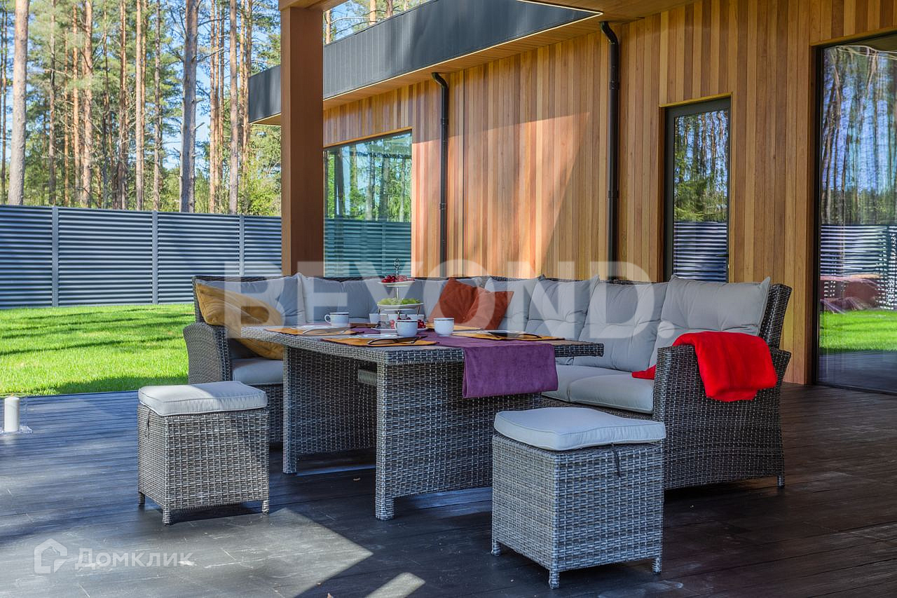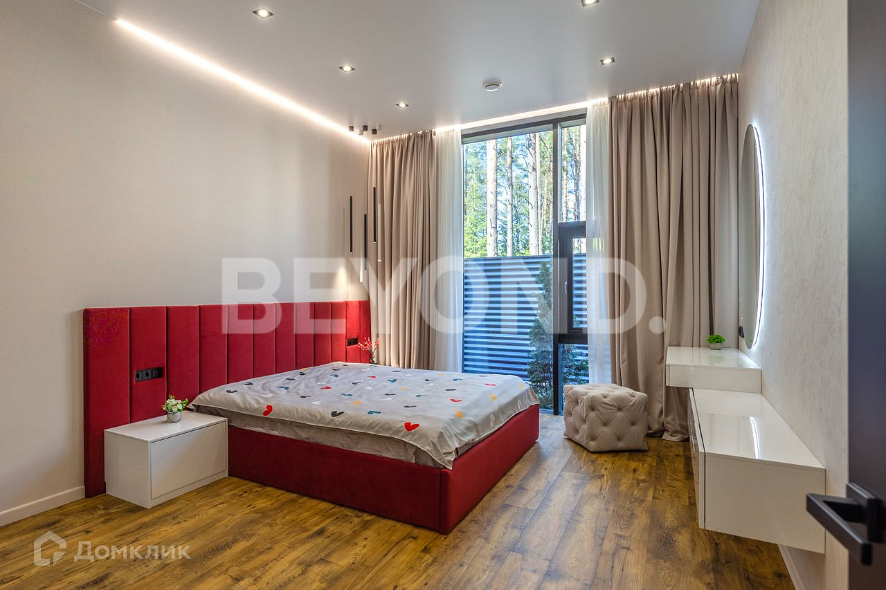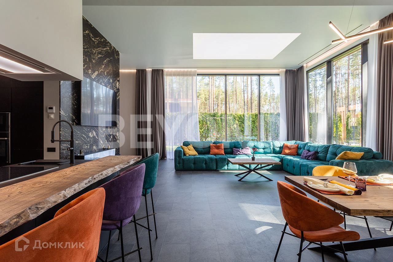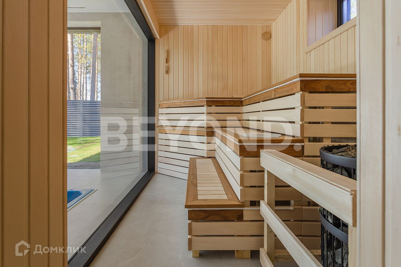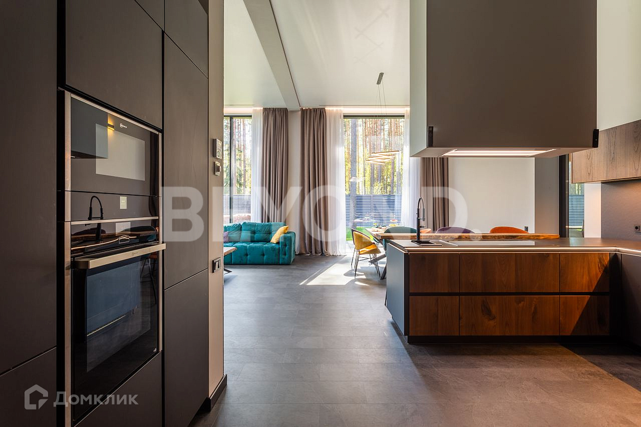 Одноэтажный, современный, стильный дом  общей площадью 590 кв. м, на участке 23 сотки в окружении вековых сосен. Есть возможность увеличения участка до 43 соток земли. Внешняя отделка дома выполнена по индивидуальному дизайн-проекту. Основной материал - красное дерево Меранти, известное своей долговечностью. Бесшовное панорамное остекление высотой 4 метра не только визуально расширяет пространство, но и дает невероятную естественную инсоляцию. Дом полностью меблирован, готов для проживания. Ремонт и отделка выполнены из самых дорогих и современных материалов. Эргономичная планировка разделяет дом на приватную и гостевую зоны.  В приватной зоне: мастер-спальня с большой гардеробной и собственной ванной комнатой, две детские комнаты и две гостевые. Есть постирочная и хозяйственная комната. В гостевой зоне: просторная кухня-гостиная, оборудованная мебелью и техникой с учетом всех последних тенденций, откуда можно пройти на террасу, где расположена столовая зона с местом под барбекю.  Дом высокотехнологичен и оборудован самой современной климат-системой вентиляции, рекуперации, подогревом и кондиционированием воздуха. Отопление теплыми полами и системой нагрева воздуха. Система фильтрации и очистка воды производится с помощью ультрафиолета.  Весь участок разработан: выполнен дренаж, отсеян газон, высажены туи, по периметру установлен забор 2,5 метра. На территории есть детская площадка, футбольное поле, установлено баскетбольное кольцо.  Для автомобилей организована гостевая парковка и гараж.