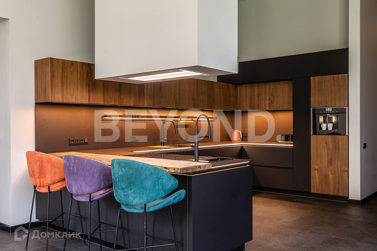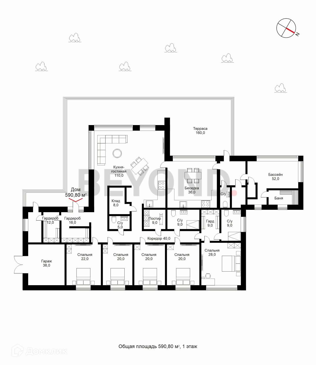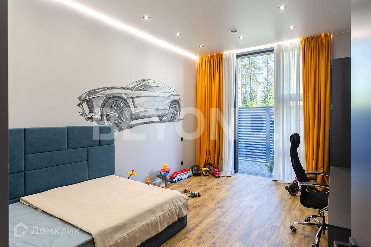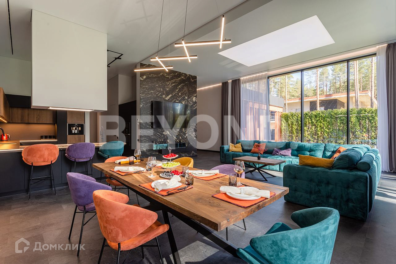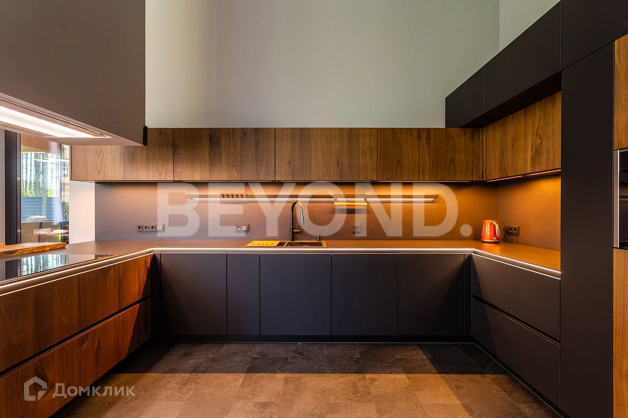 Одноэтажный, современный, стильный дом  общей площадью 590 кв. м, на участке 23 сотки в окружении вековых сосен. Есть возможность увеличения участка до 43 соток земли. Внешняя отделка дома выполнена по индивидуальному дизайн-проекту. Основной материал - красное дерево Меранти, известное своей долговечностью. Бесшовное панорамное остекление высотой 4 метра не только визуально расширяет пространство, но и дает невероятную естественную инсоляцию. Дом полностью меблирован, готов для проживания. Ремонт и отделка выполнены из самых дорогих и современных материалов. Эргономичная планировка разделяет дом на приватную и гостевую зоны.  В приватной зоне: мастер-спальня с большой гардеробной и собственной ванной комнатой, две детские комнаты и две гостевые. Есть постирочная и хозяйственная комната. В гостевой зоне: просторная кухня-гостиная, оборудованная мебелью и техникой с учетом всех последних тенденций, откуда можно пройти на террасу, где расположена столовая зона с местом под барбекю.  Дом высокотехнологичен и оборудован самой современной климат-системой вентиляции, рекуперации, подогревом и кондиционированием воздуха. Отопление теплыми полами и системой нагрева воздуха. Система фильтрации и очистка воды производится с помощью ультрафиолета.  Весь участок разработан: выполнен дренаж, отсеян газон, высажены туи, по периметру установлен забор 2,5 метра. На территории есть детская площадка, футбольное поле, установлено баскетбольное кольцо.  Для автомобилей организована гостевая парковка и гараж.