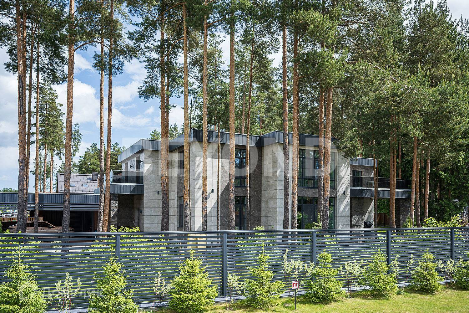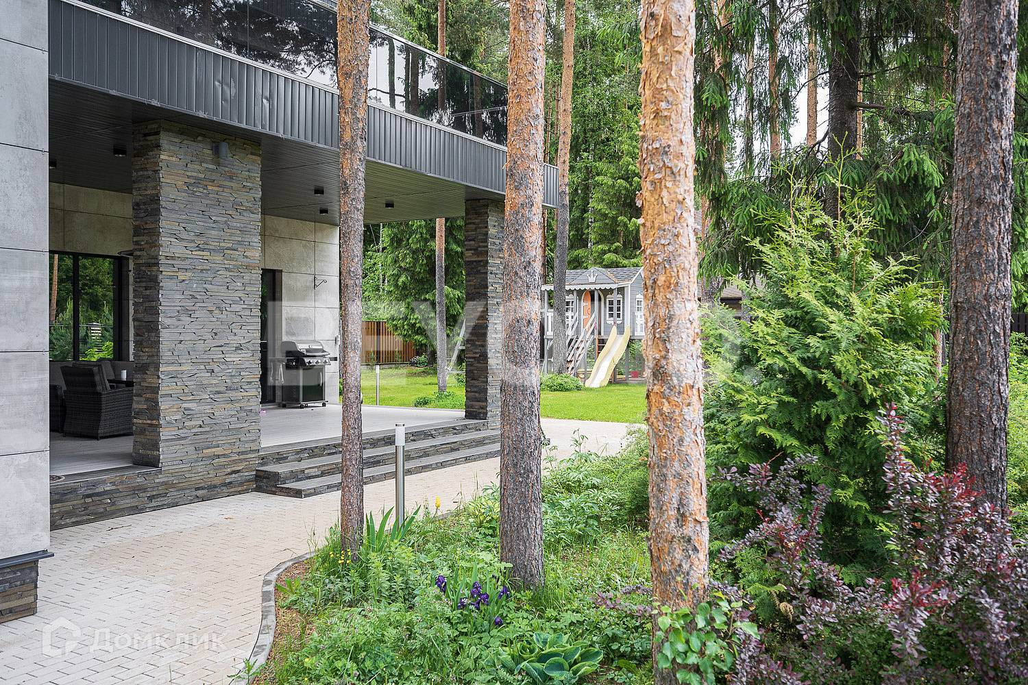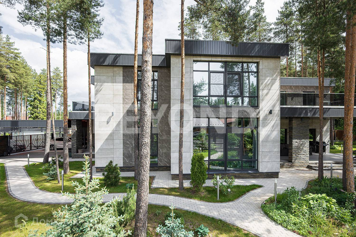 В продаже просторный стильный двухэтажный дом общей площадью 578 кв. м, на участке 17,5 сотки в окружении внушительных старых сосен.