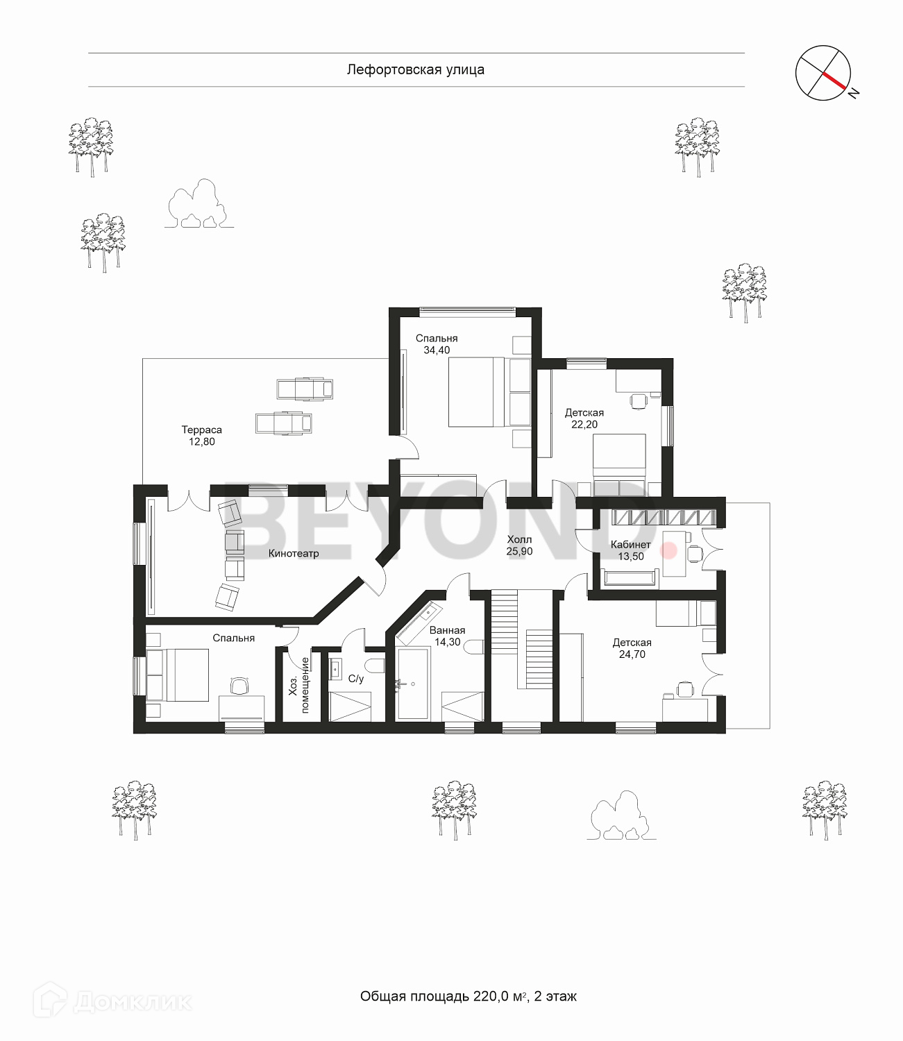 На втором этаже: мастер-спальня с выходом на террасу, две детские комнаты, гостевая и кинозал.