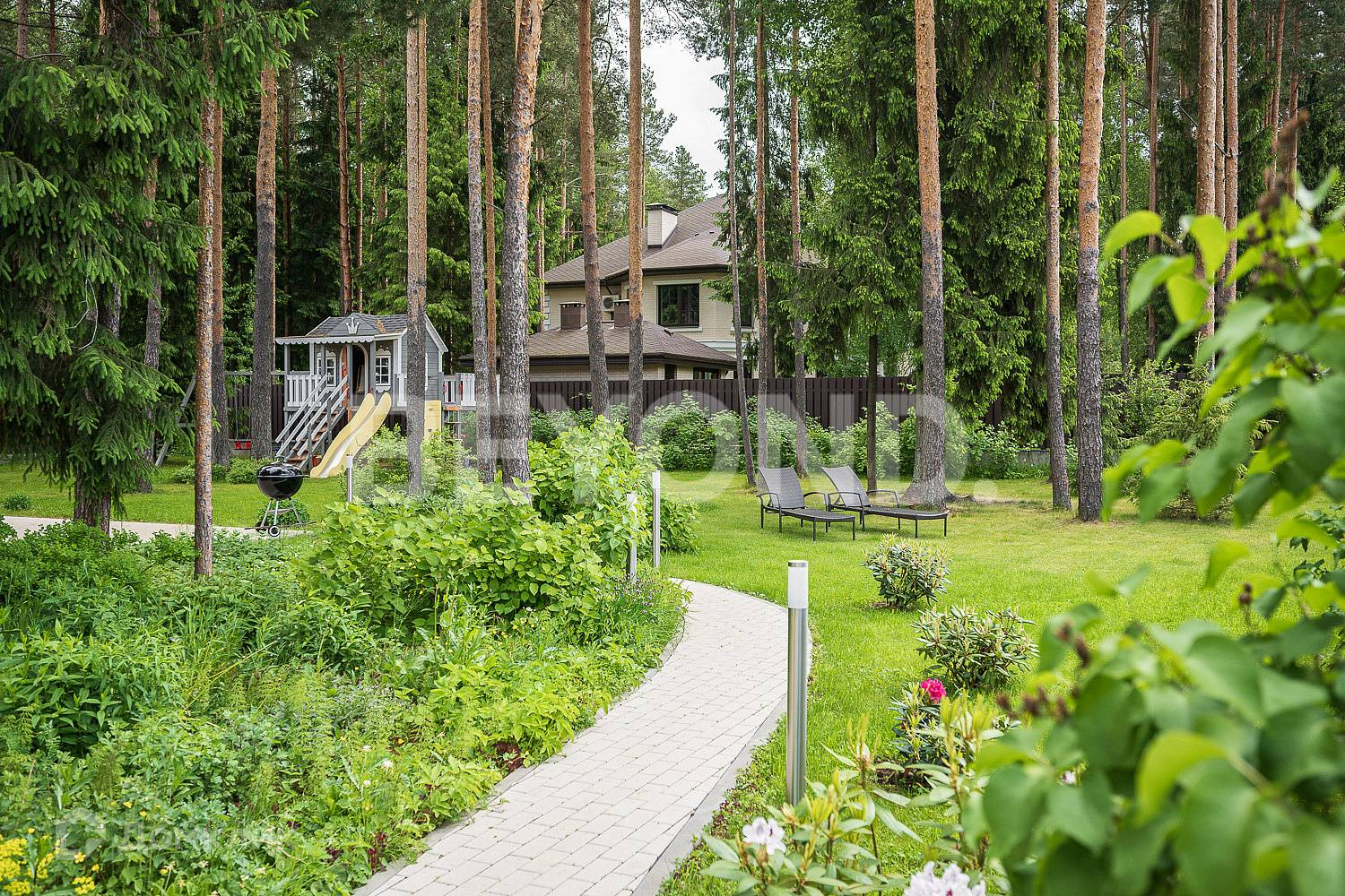 Участок вокруг дома спроектирован для удобства будущих резидентов: здесь выполнен дренаж, отсеян газон, вымощены садовые дорожки, установлен забор по всему периметру. На территории есть все необходимое для безопасного проживания - видеонаблюдение, освещение.