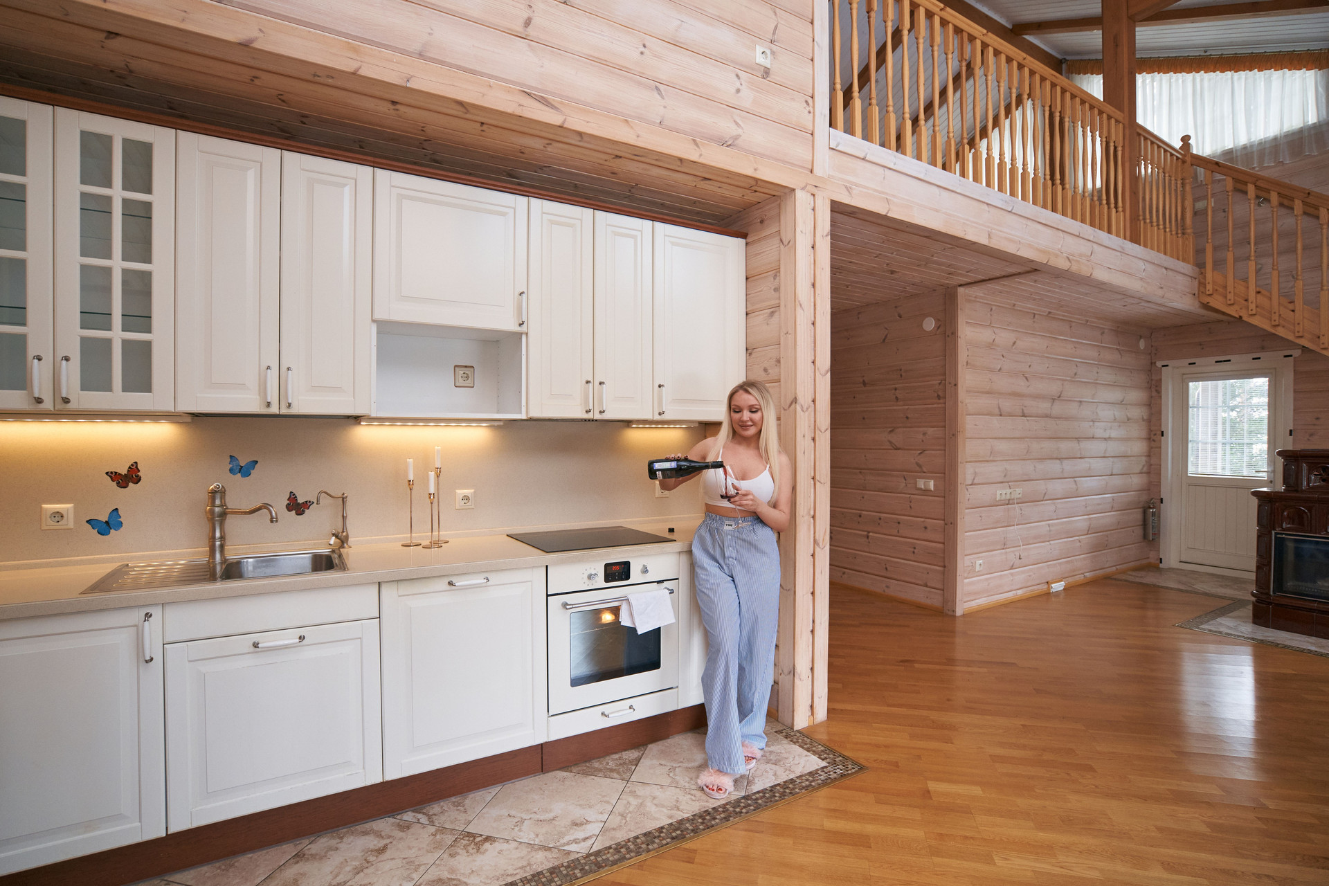 Дом оснащен современной кухней, оборудованной всей необходимой бытовой техникой, а также уютной гостиной с камином, идеальной для семейных вечеров и приема гостей.