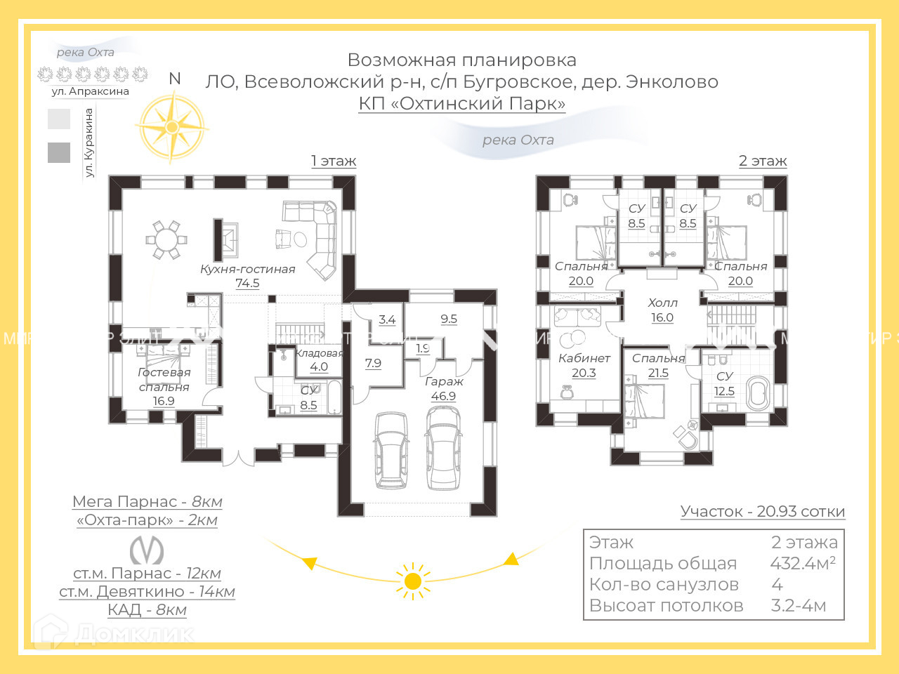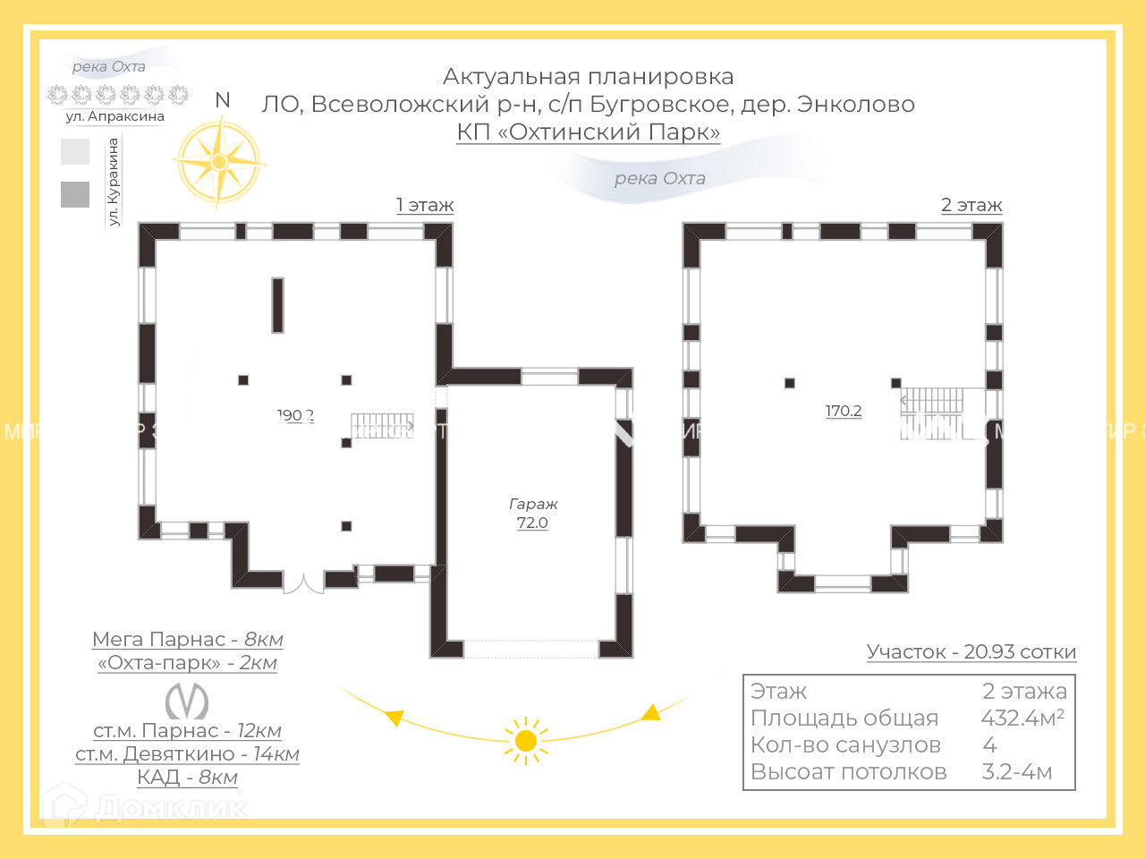 В радиусе 5 км, Мега-Парнас, горнолыжный курорт Охта-парк, конноспортивный клуб Дерби, работает школа и детский сад.