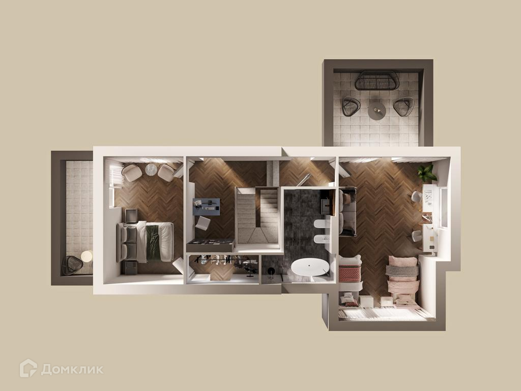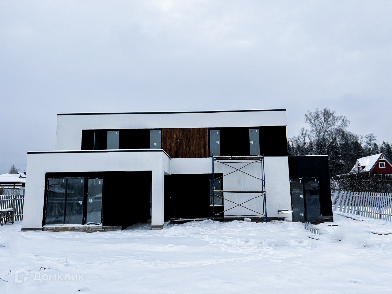 Дом имеет панорамное остекление, 4 выхода и плоскую эксплуатируемую кровлю. Внутри вы найдете большую кухню-гостиную, 3 спальни (включая мастер-спальню с гардеробной и ванной комнатой) и 2 санузла. Высота потолков составляет 3.2 метра.