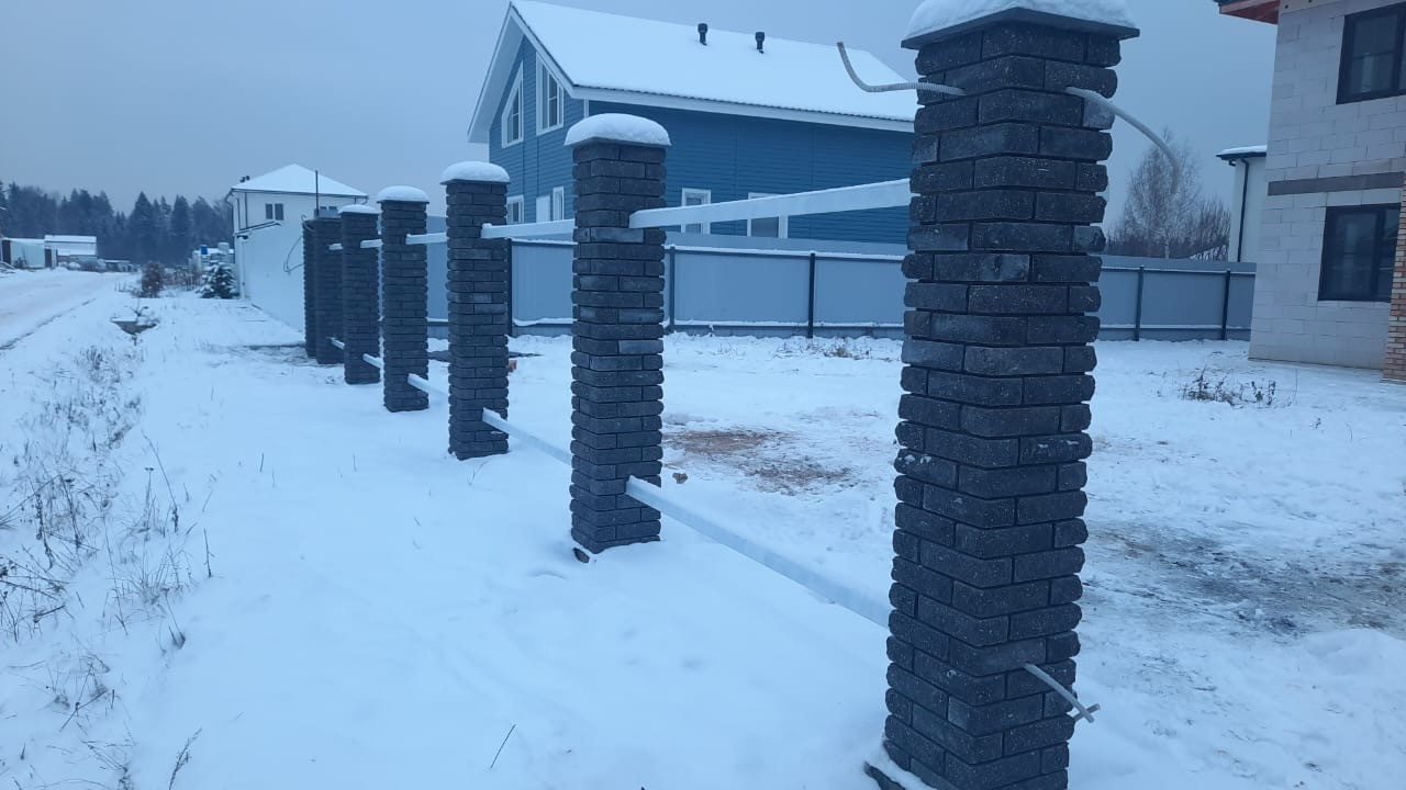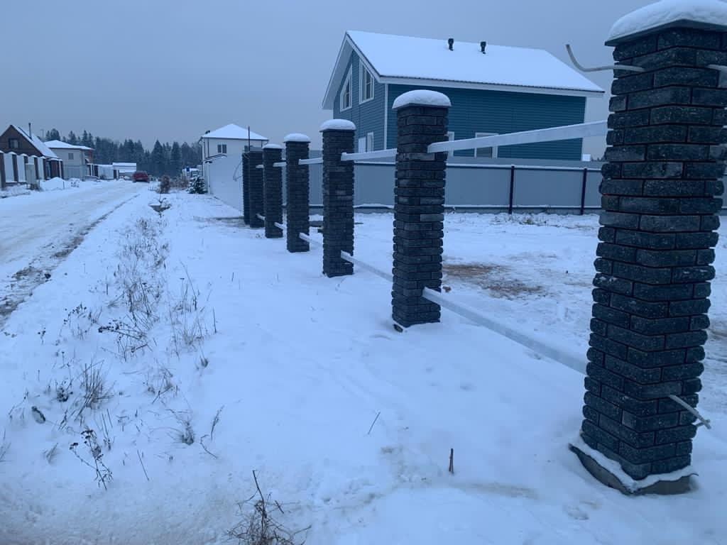 По периметру забор из профнастила,а перед дорогой забор из ленточного фундамента с кирпичными столбами.