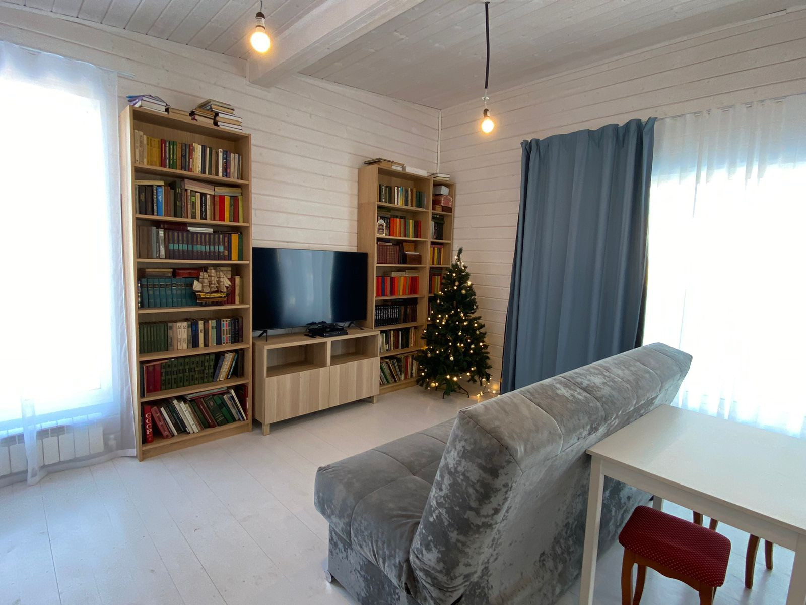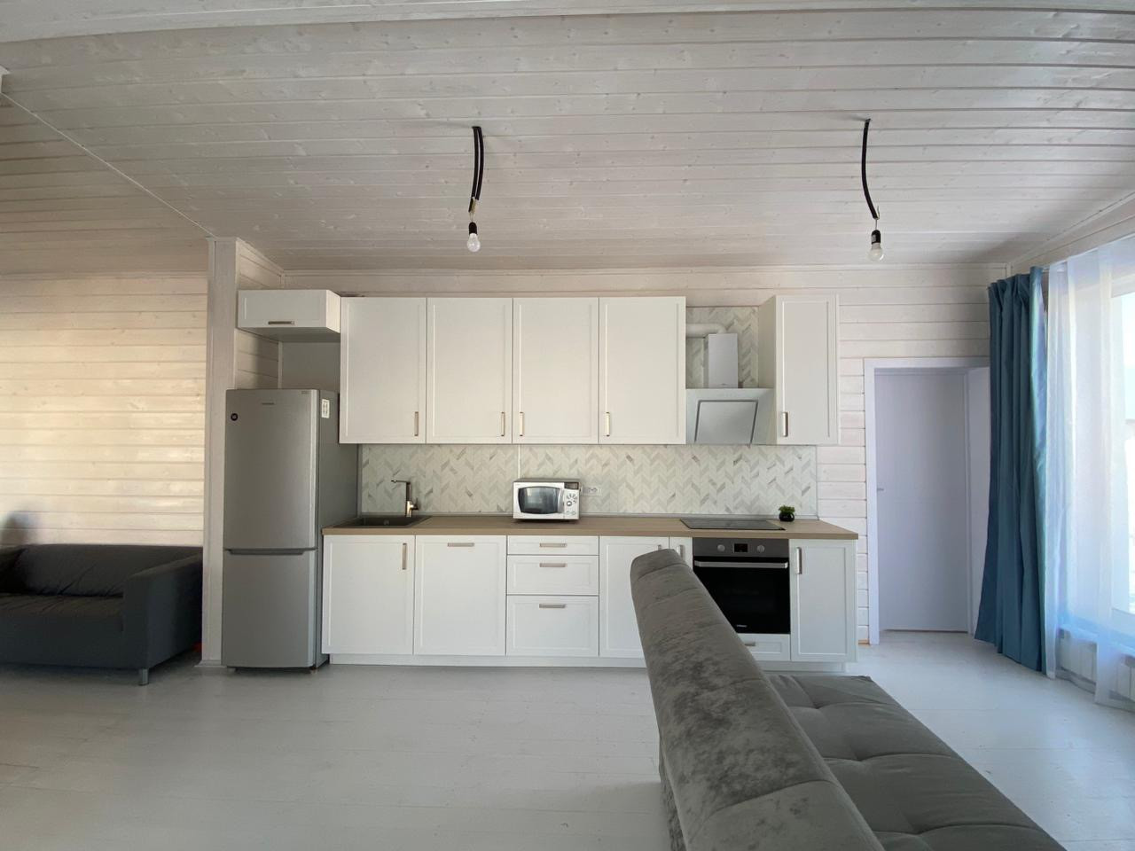 Просторная кухня гостиная с высотой потолков 4,5 метров