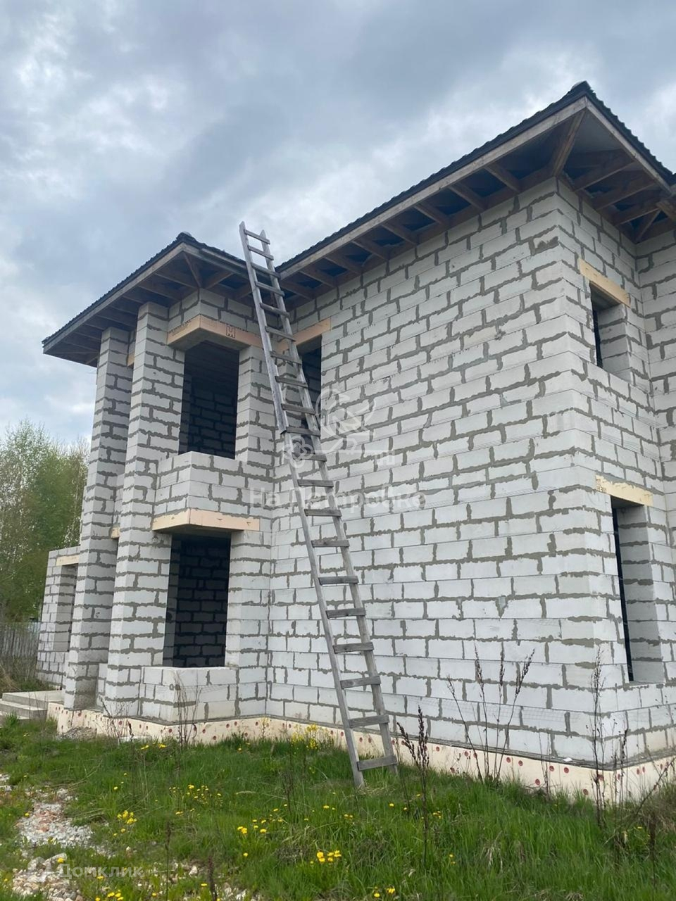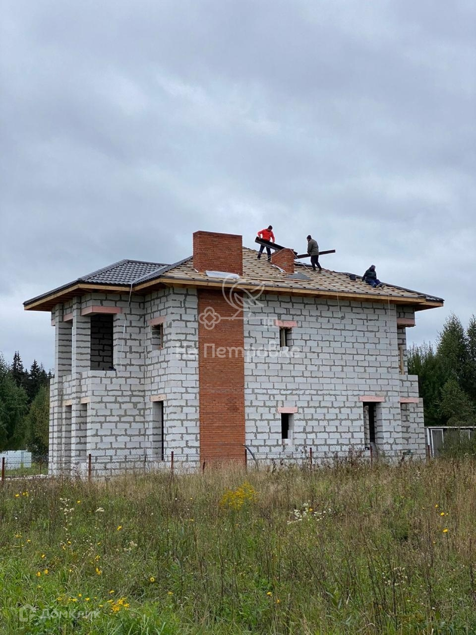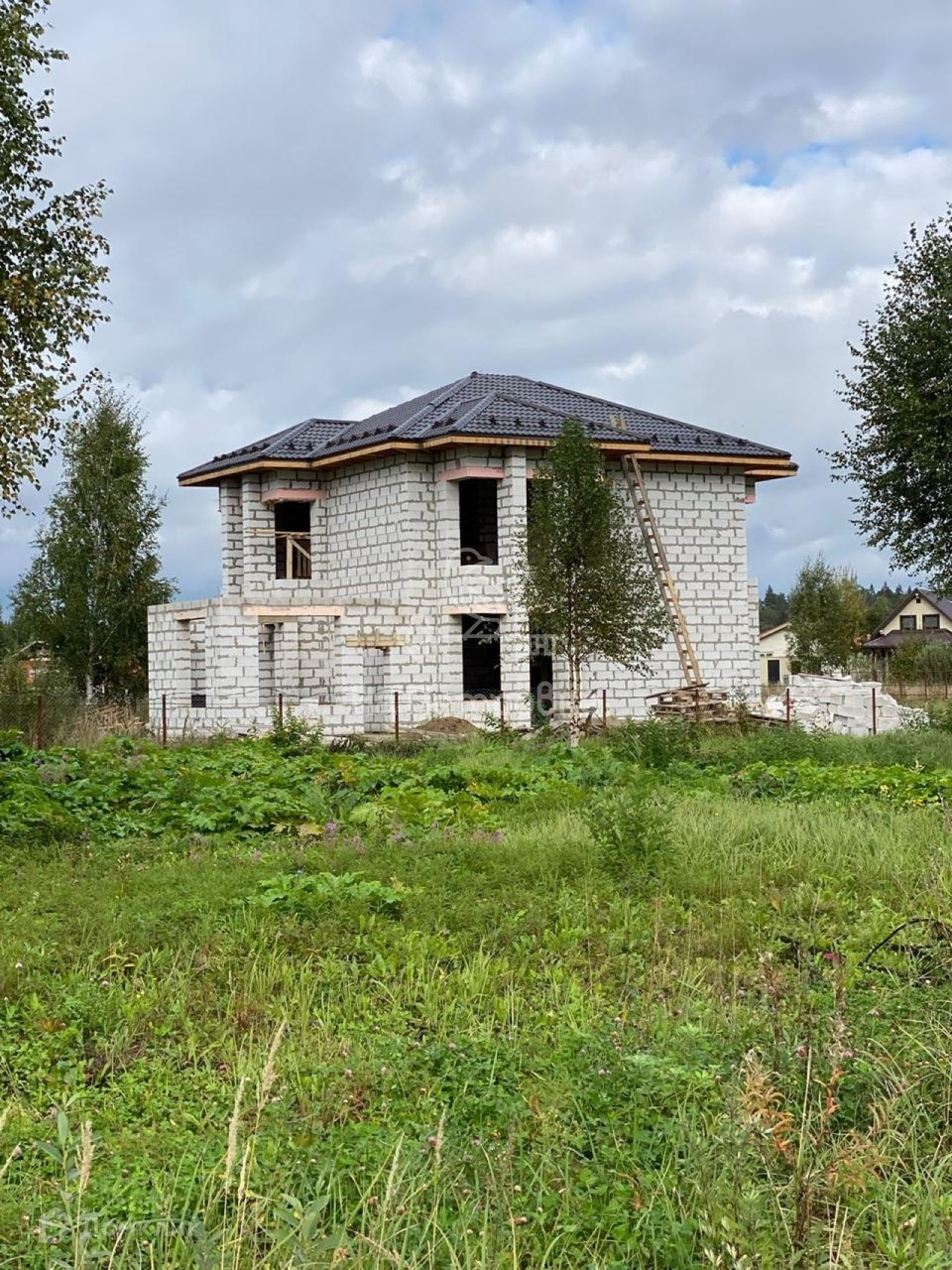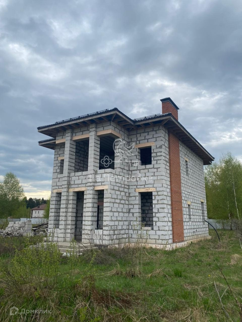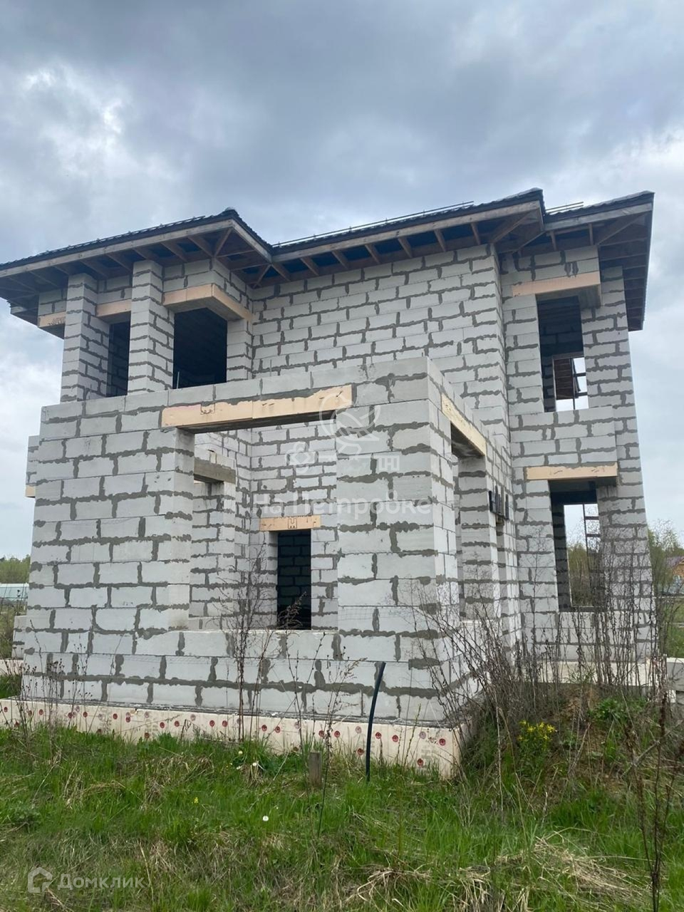 Дом возведен до уровня крыши (металлочерепица), требует дополнительного строительства.