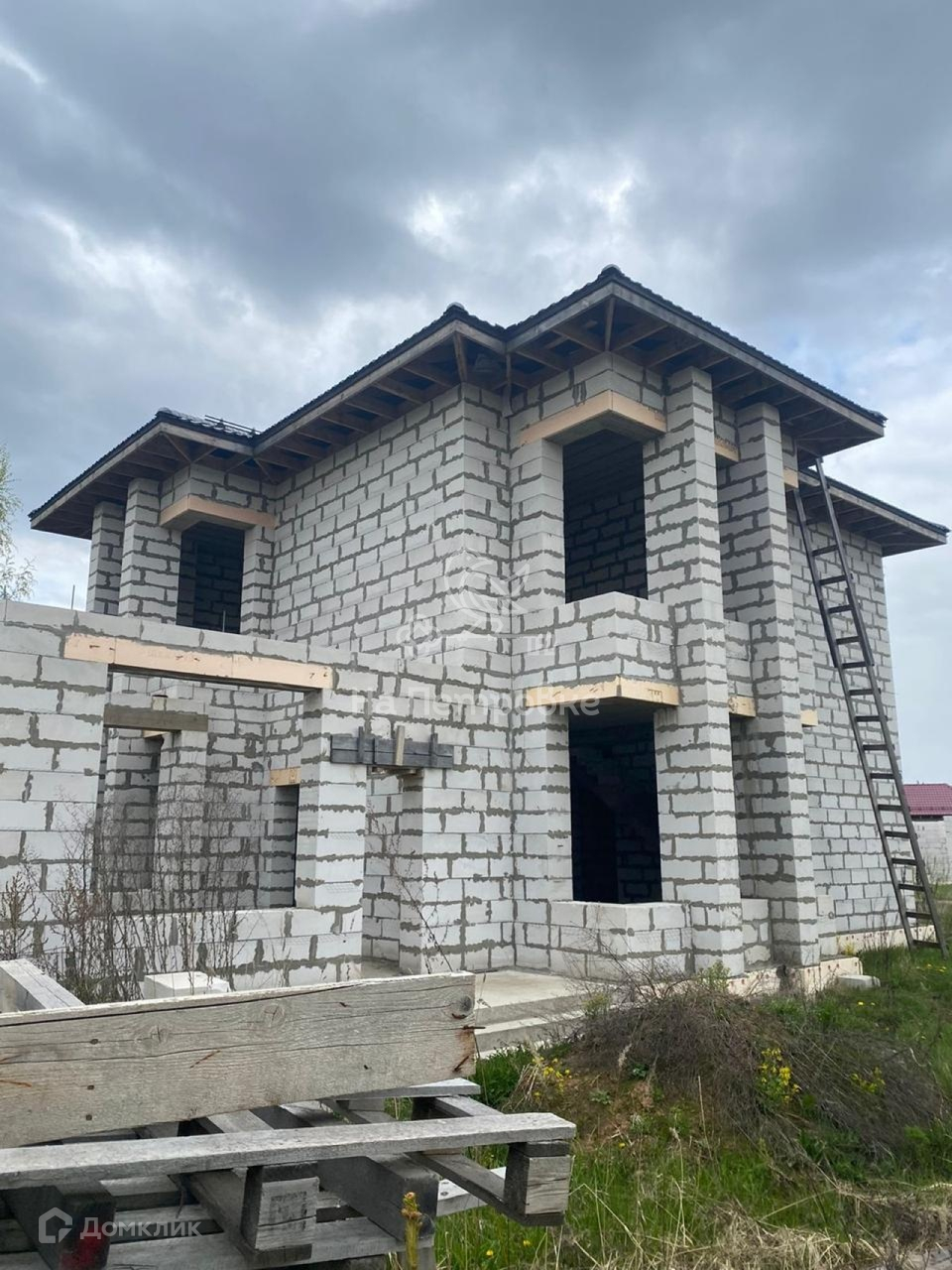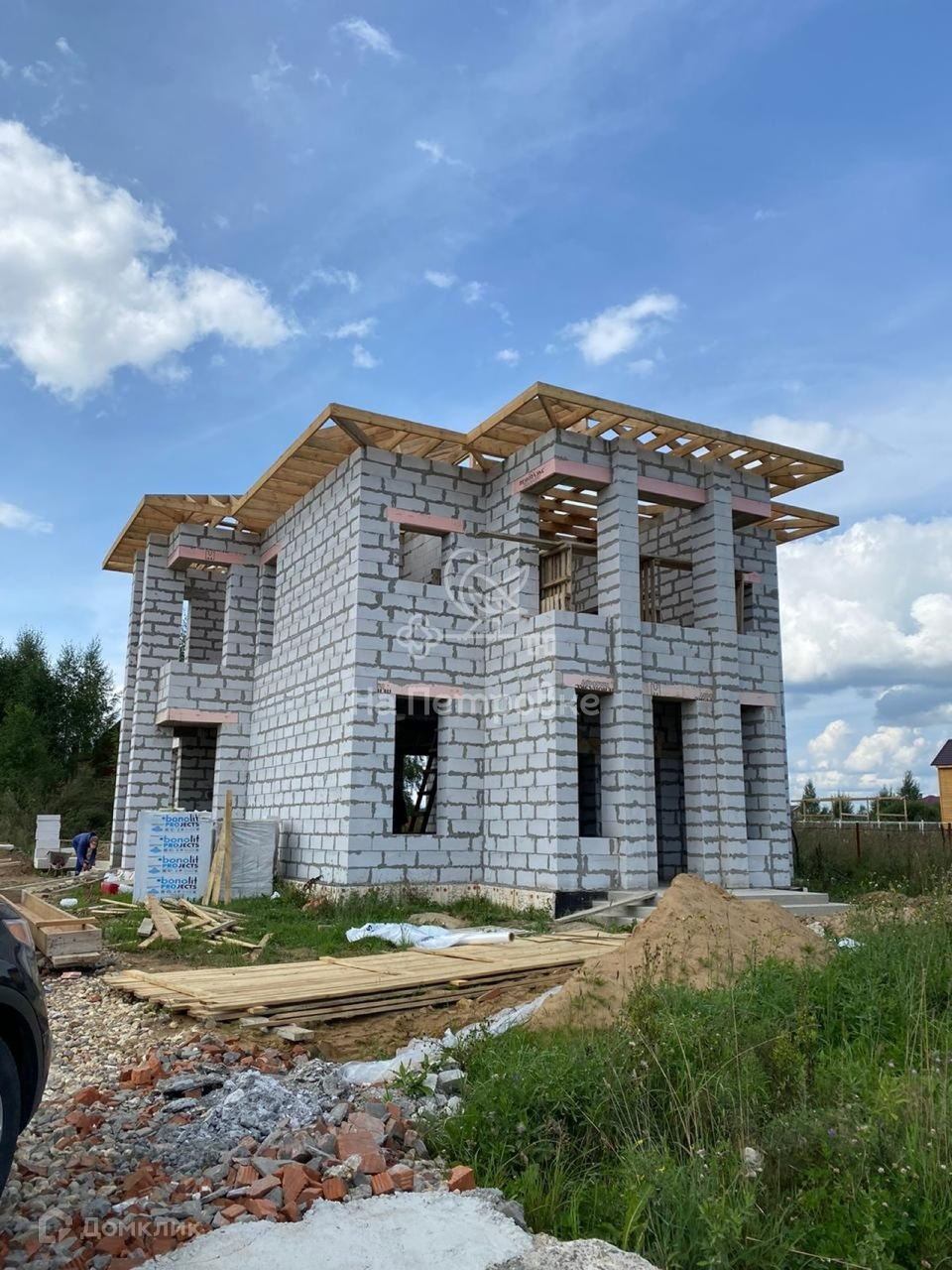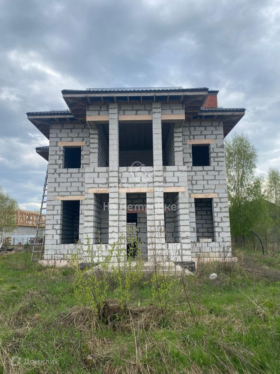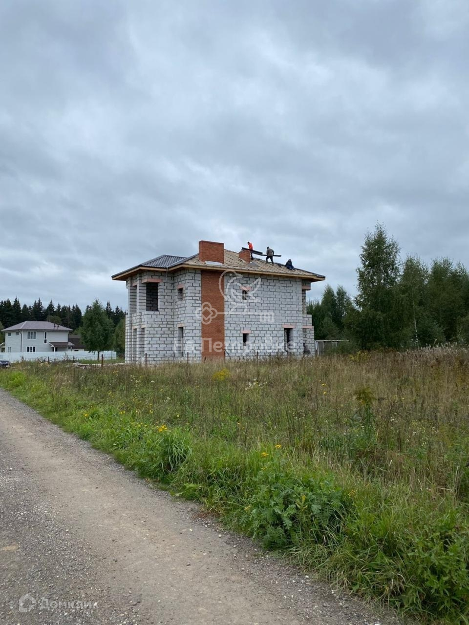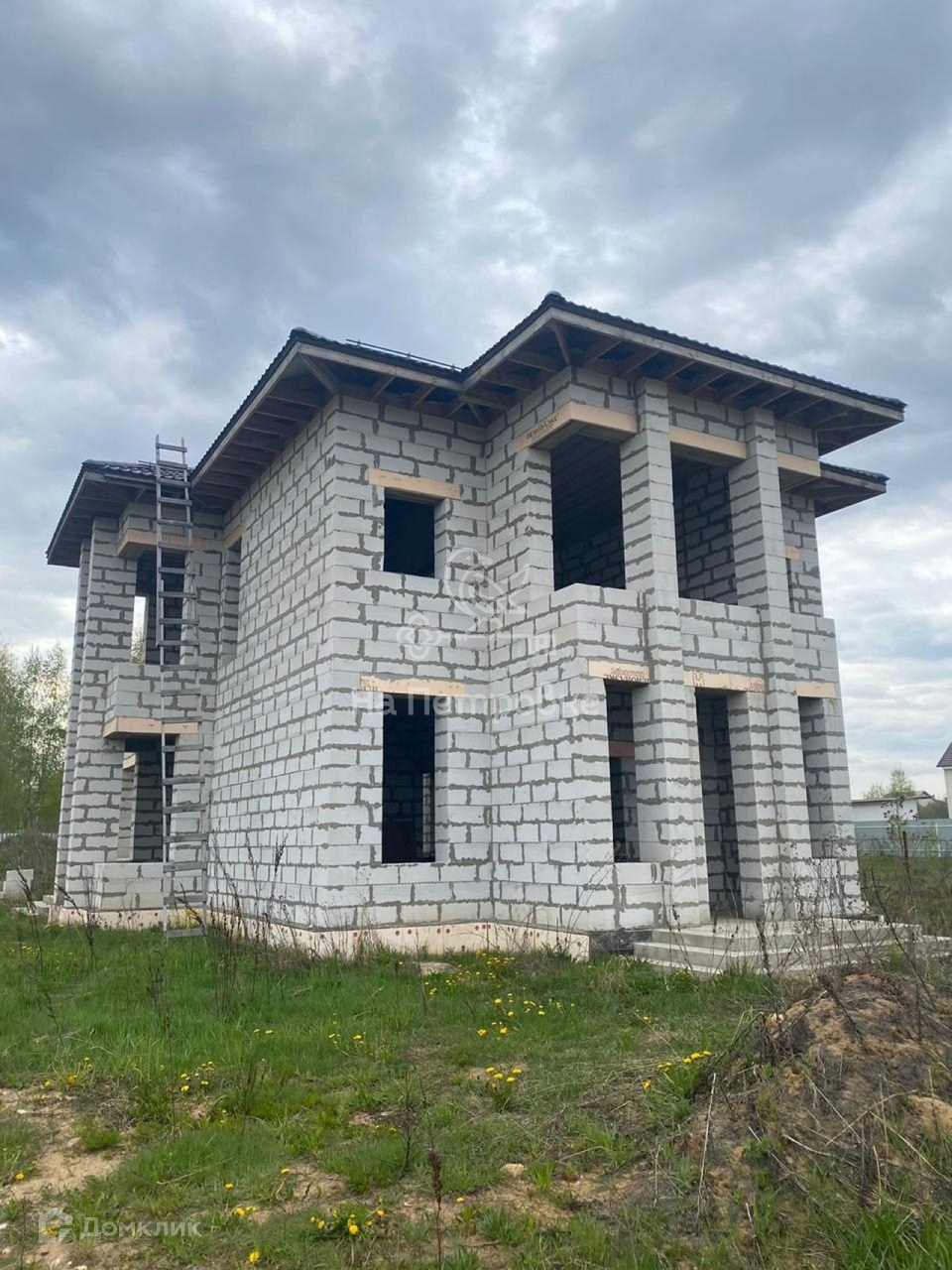 Дом возведен до уровня крыши (металлочерепица), требует дополнительного строительства.