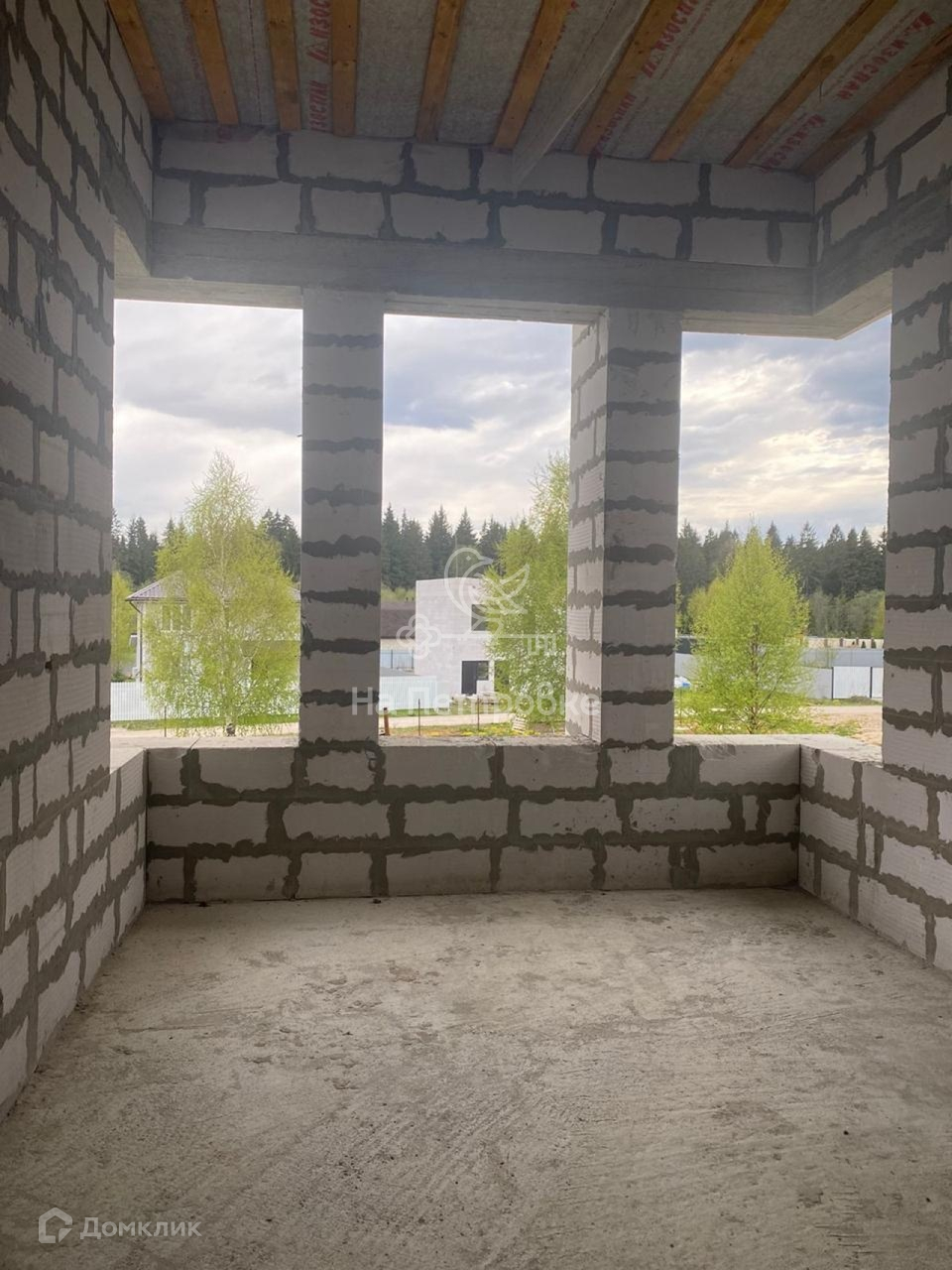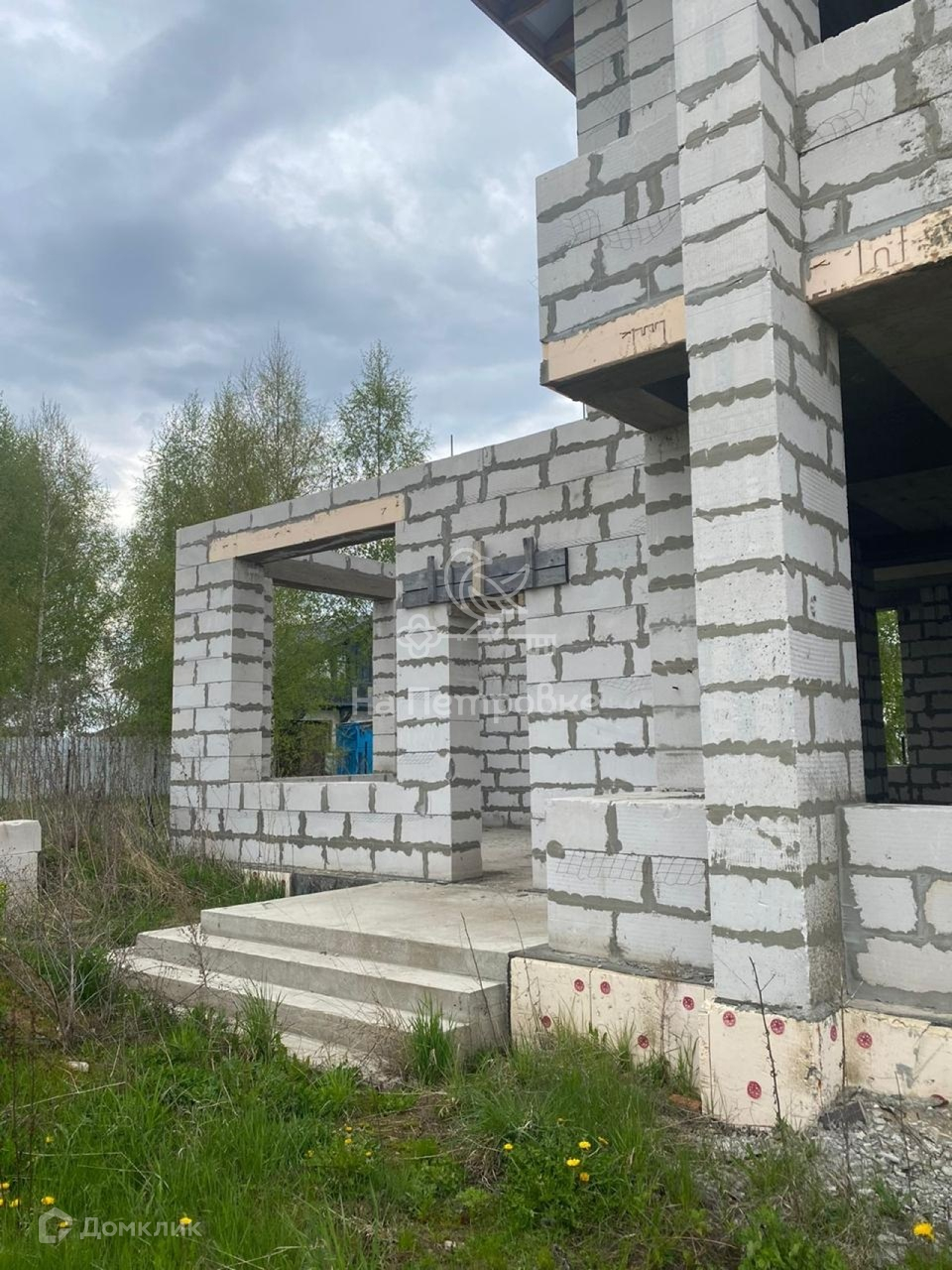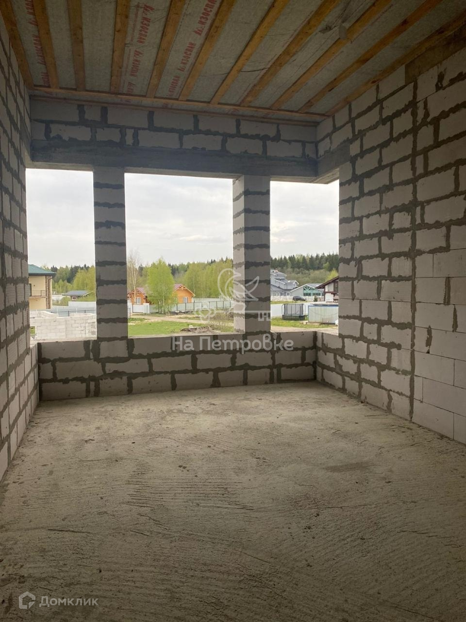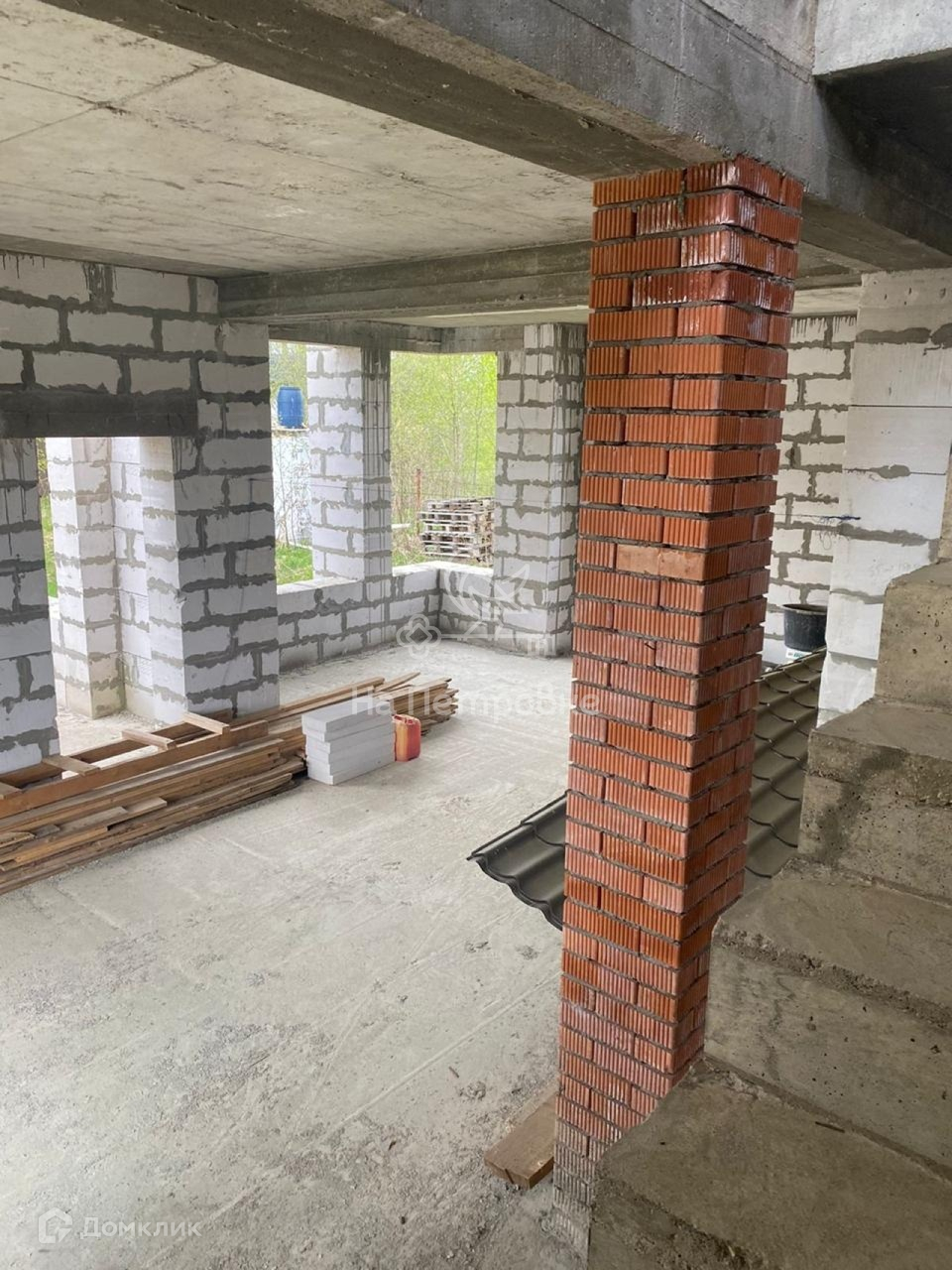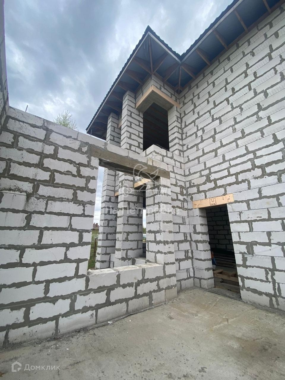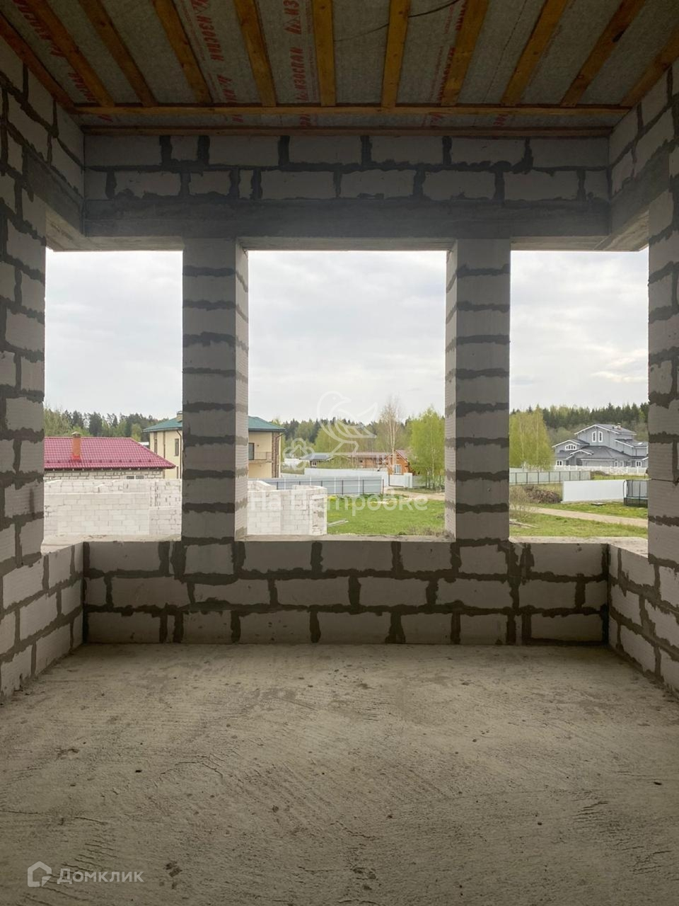 Дом возведен до уровня крыши (металлочерепица), требует дополнительного строительства.