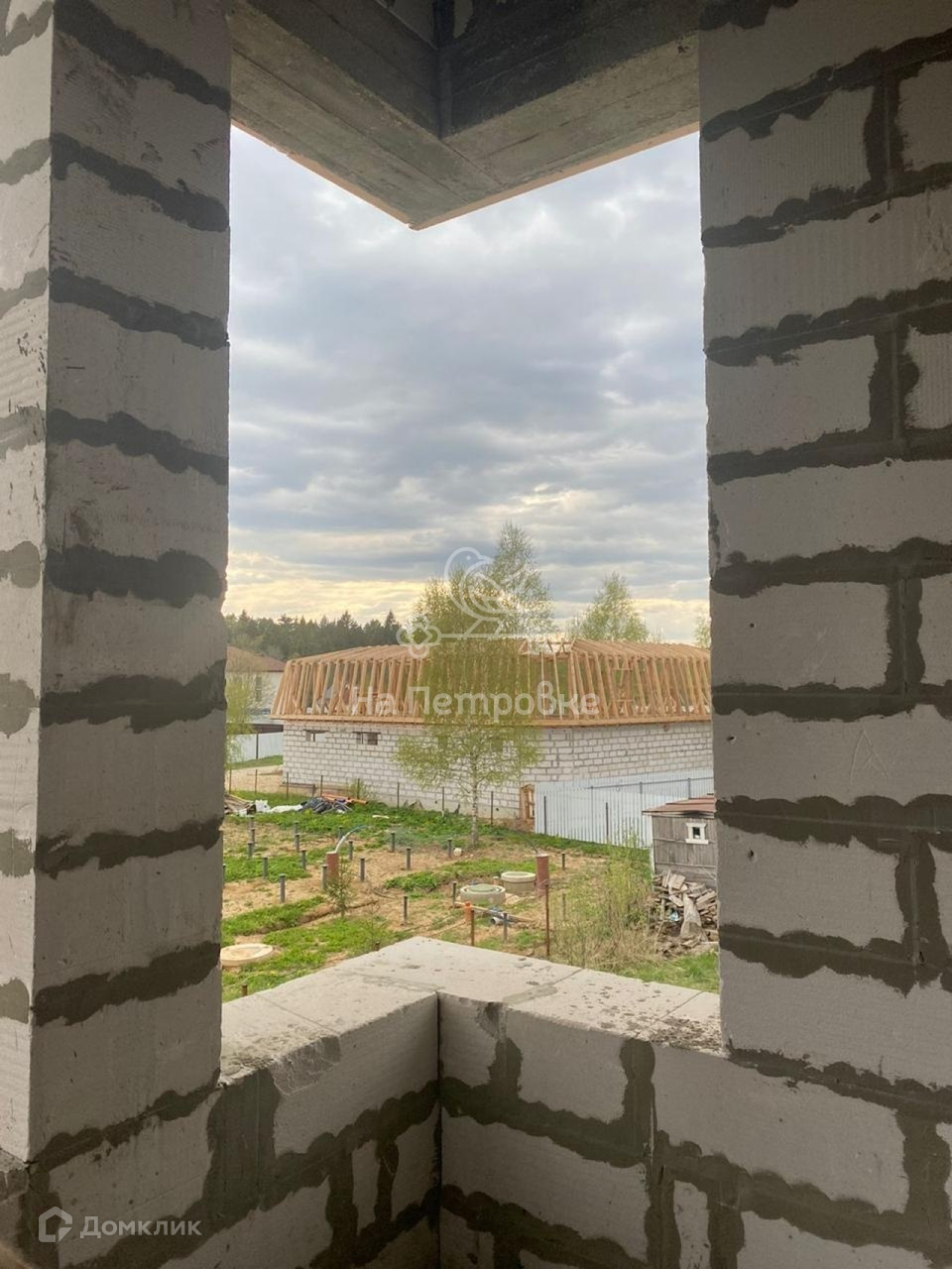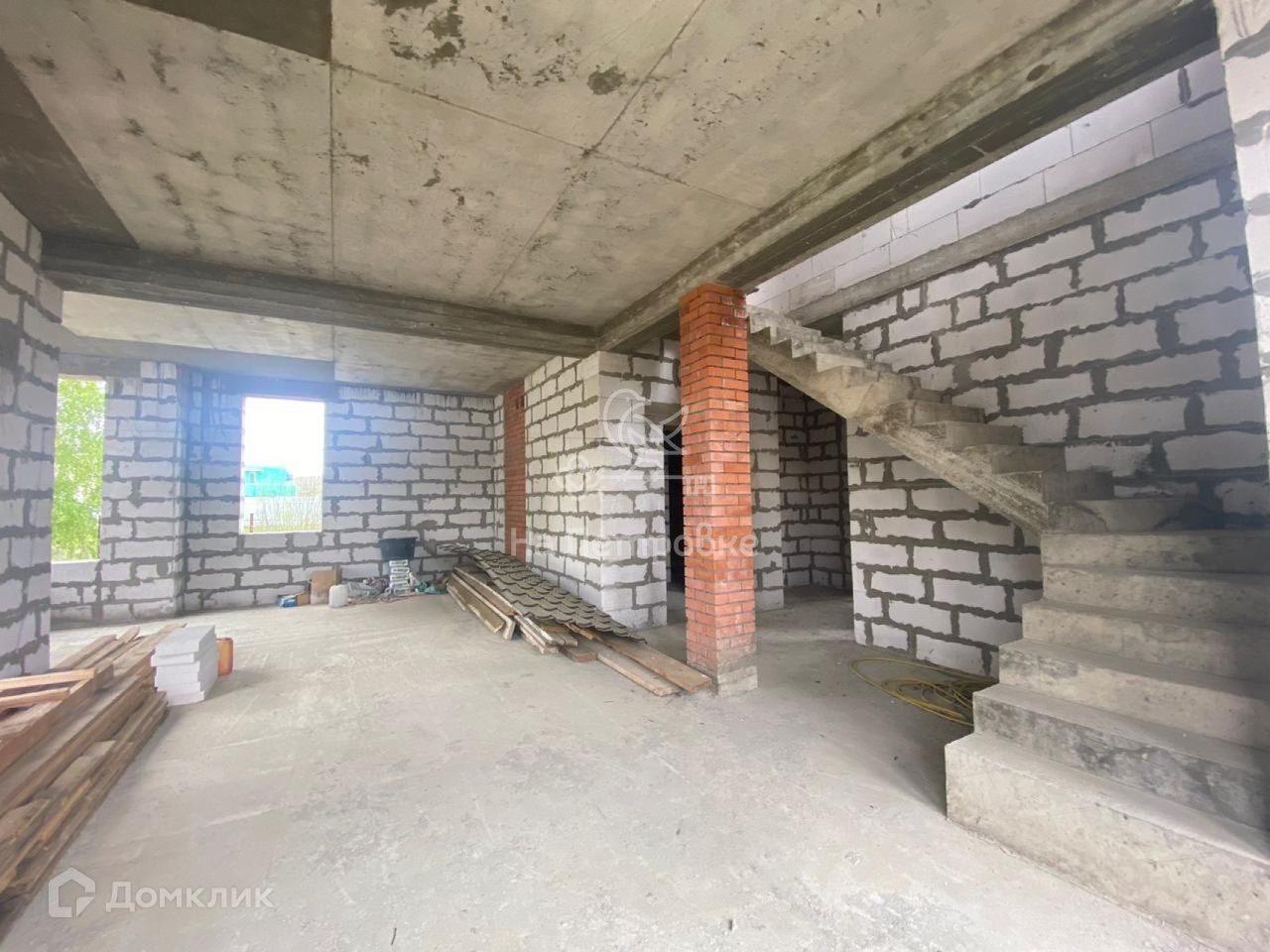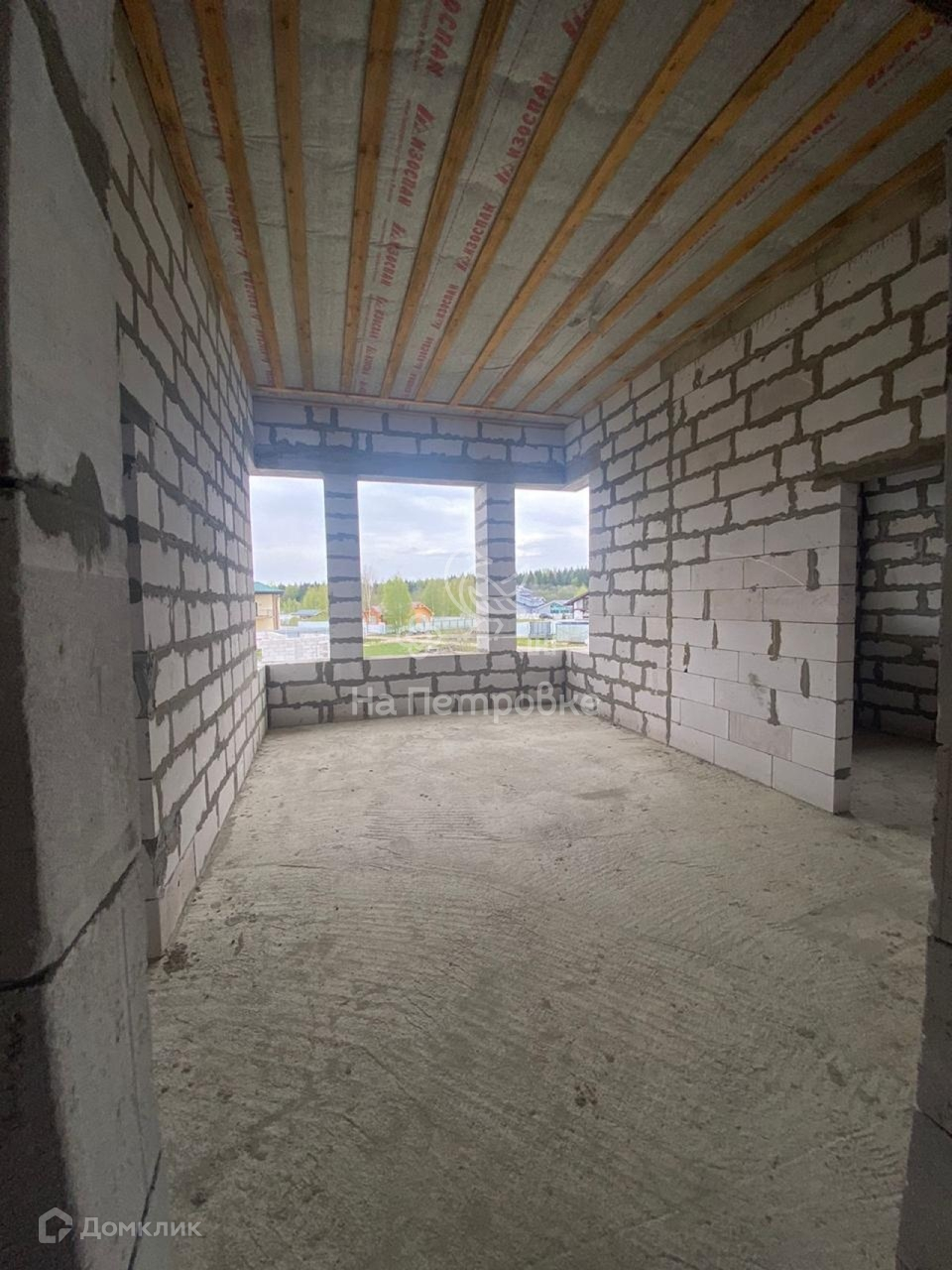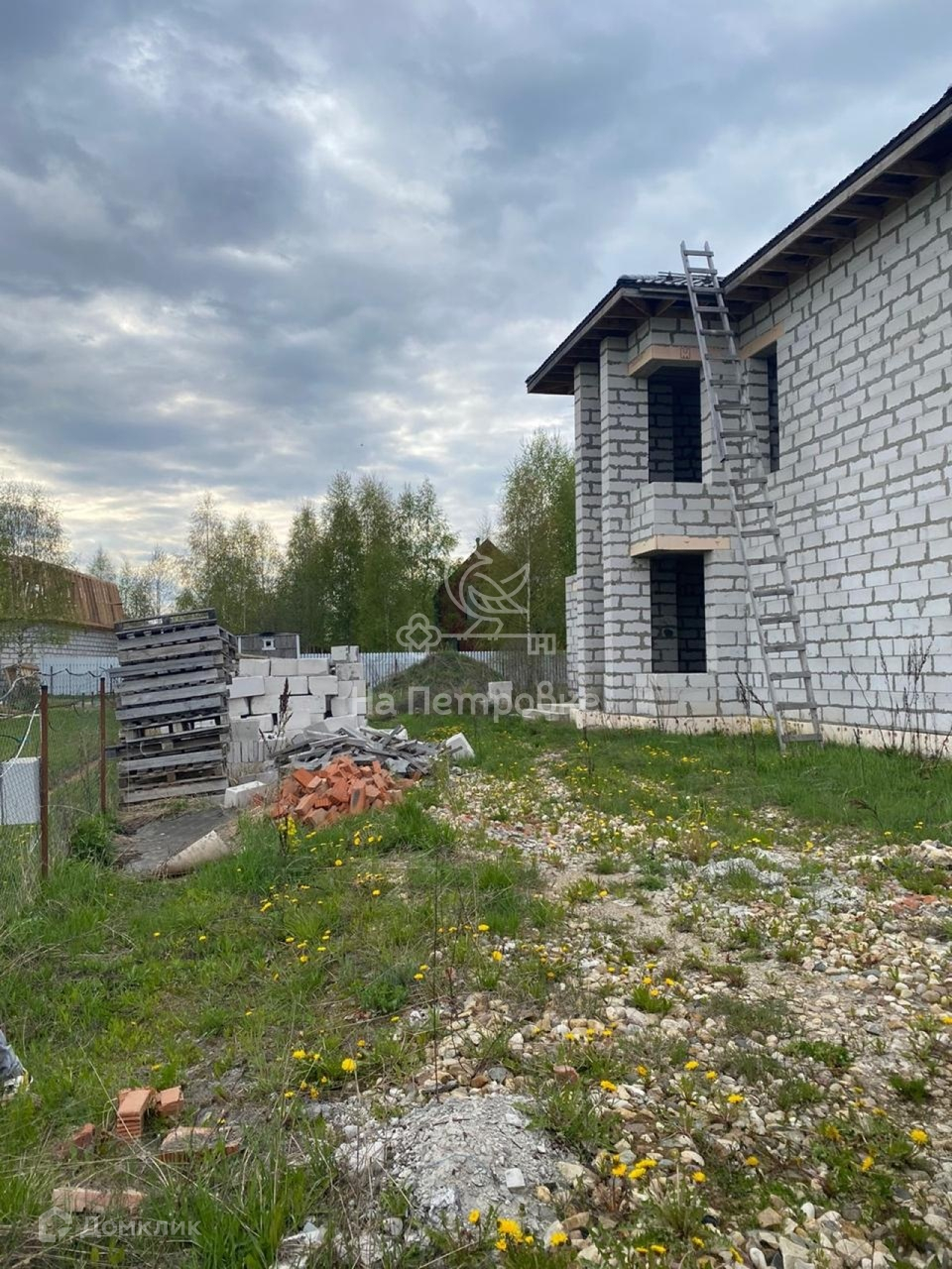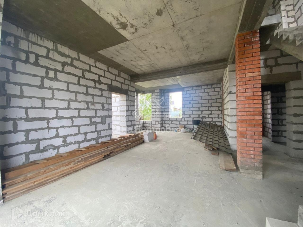 Дом возведен до уровня крыши (металлочерепица), требует дополнительного строительства.