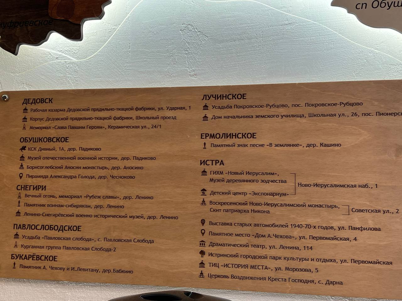 Самые популярные достопримечательности в Истринского р-на: Вознесенская церковь в Еремеево, Музей Снегиря, Воздвиженская церковь в Дарне, Казанская церковь в Глебово, Куртниково, Лучинское.
