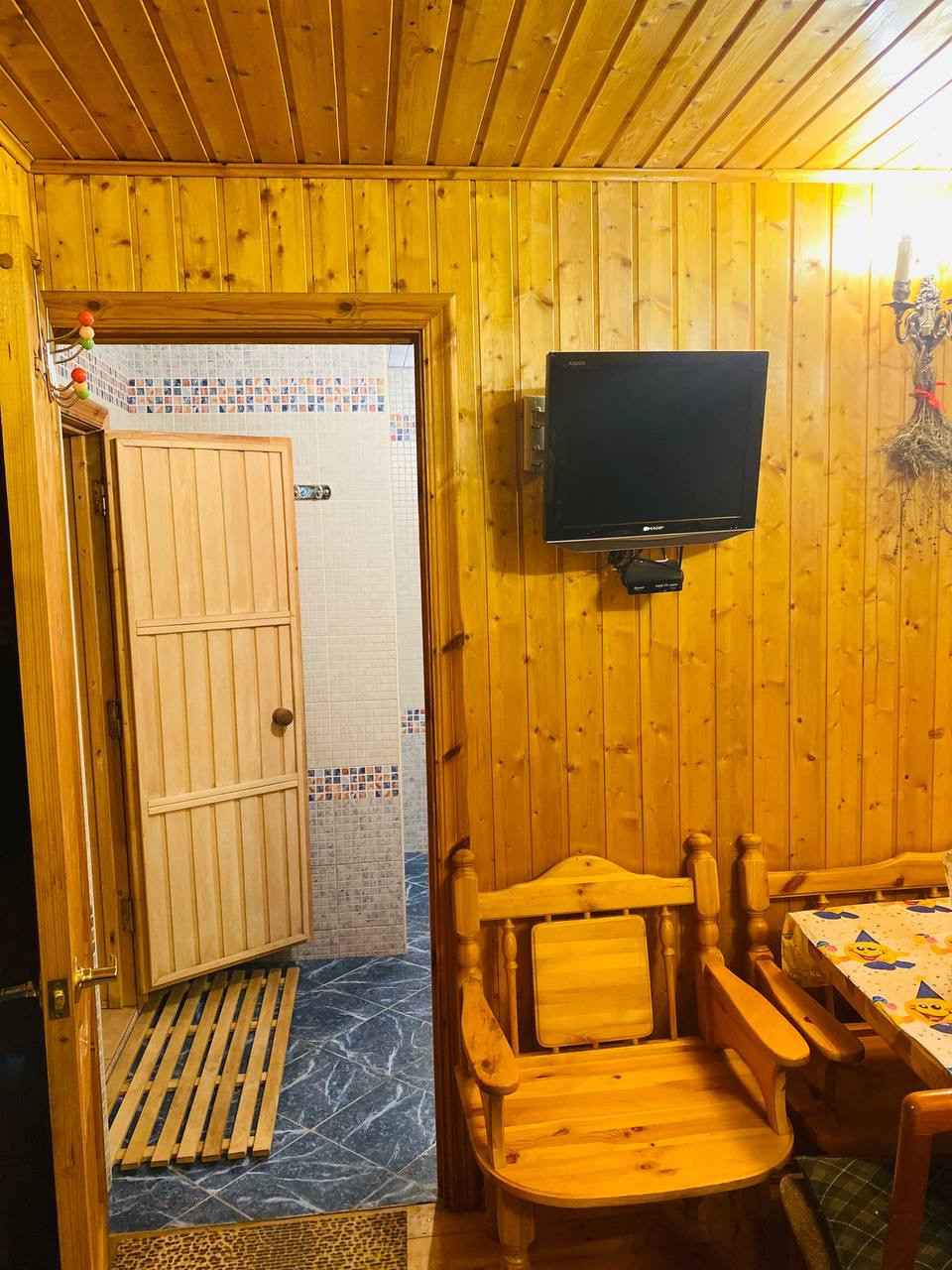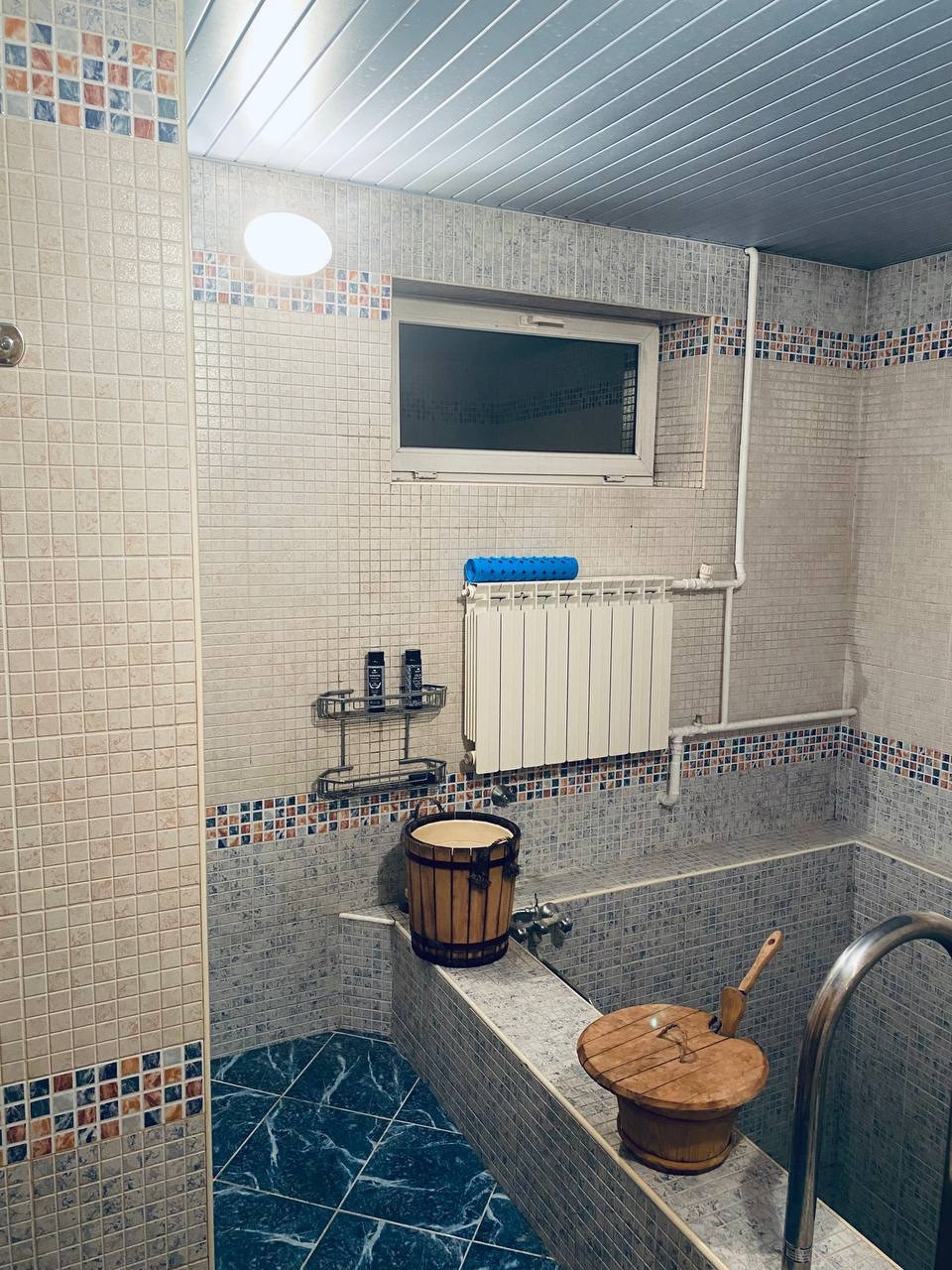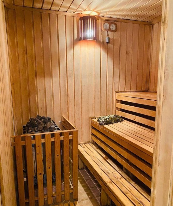 Сауна с комнатой отдыха, душевой, парилкой и бассейном.