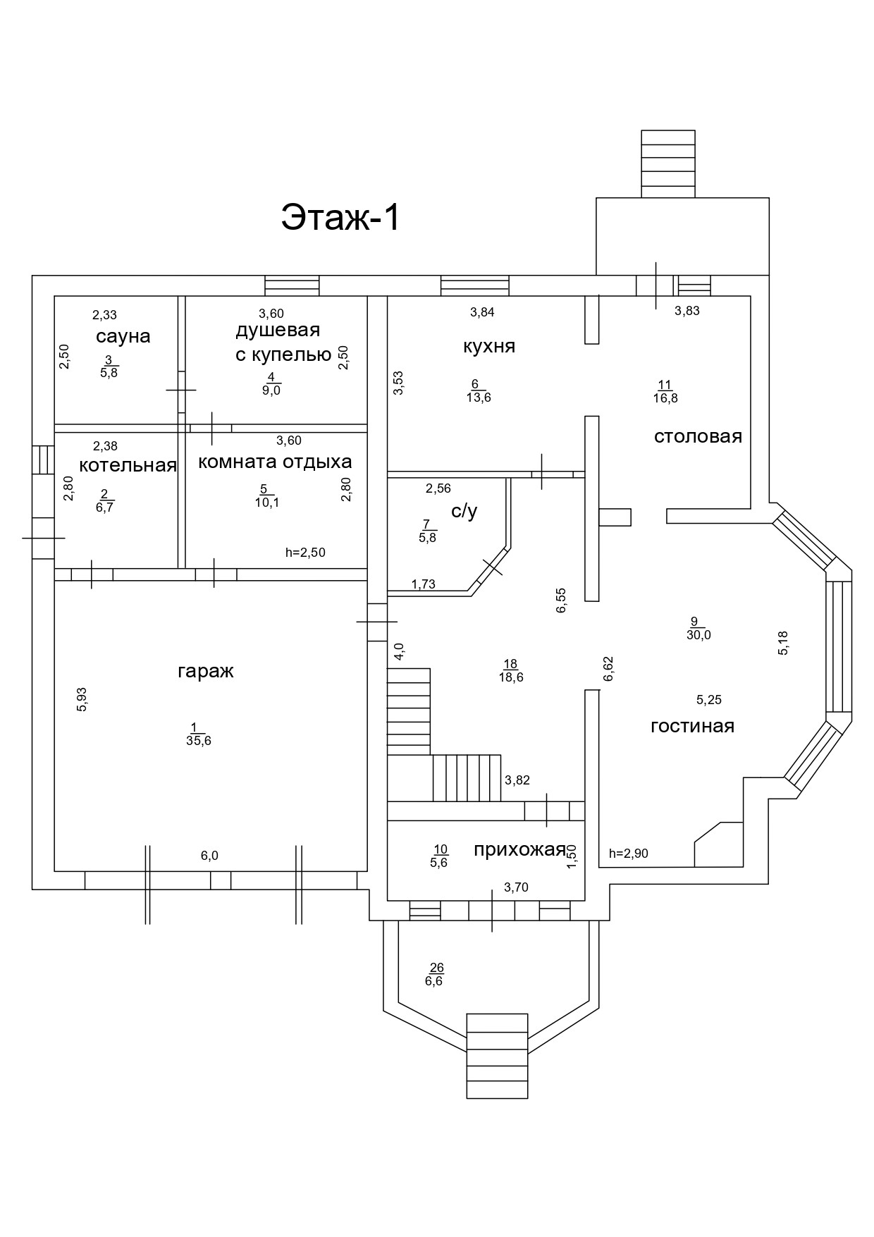 1 ЭТАЖ: кухня, столовая, гостиная с камином, санузел с душевой кабиной