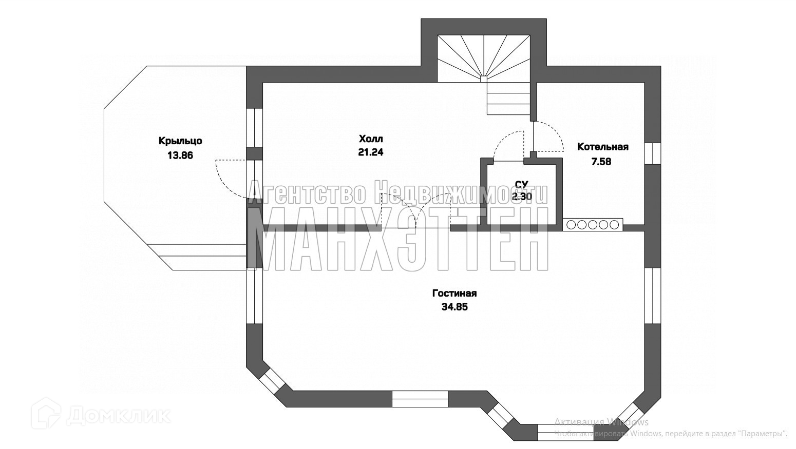 Кухня-гостиная-34,85 кв.м., холл-21,24 кв.м., котельная-7,58 кв.м., сан/узел-2,3 кв.м, крыльцо-13,86 кв.м.,