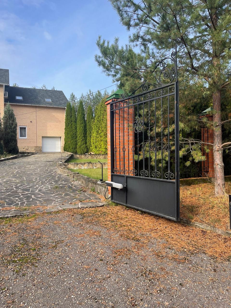 +Забор- кованые въездные ворота распашные итальянского бренда CAME и кирпичный 2,5 метровый забор по периметру.