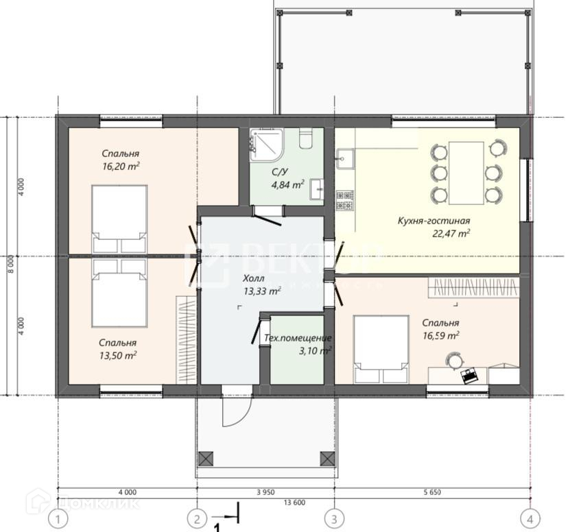 Кухня - гостиная 22,5 кВ.м. с панорамными окнами и выходом на будущую терассу, которую можно заказать дополнительно. Комнаты квадратные , с продуманным решением для хранения или рабочей зоны .