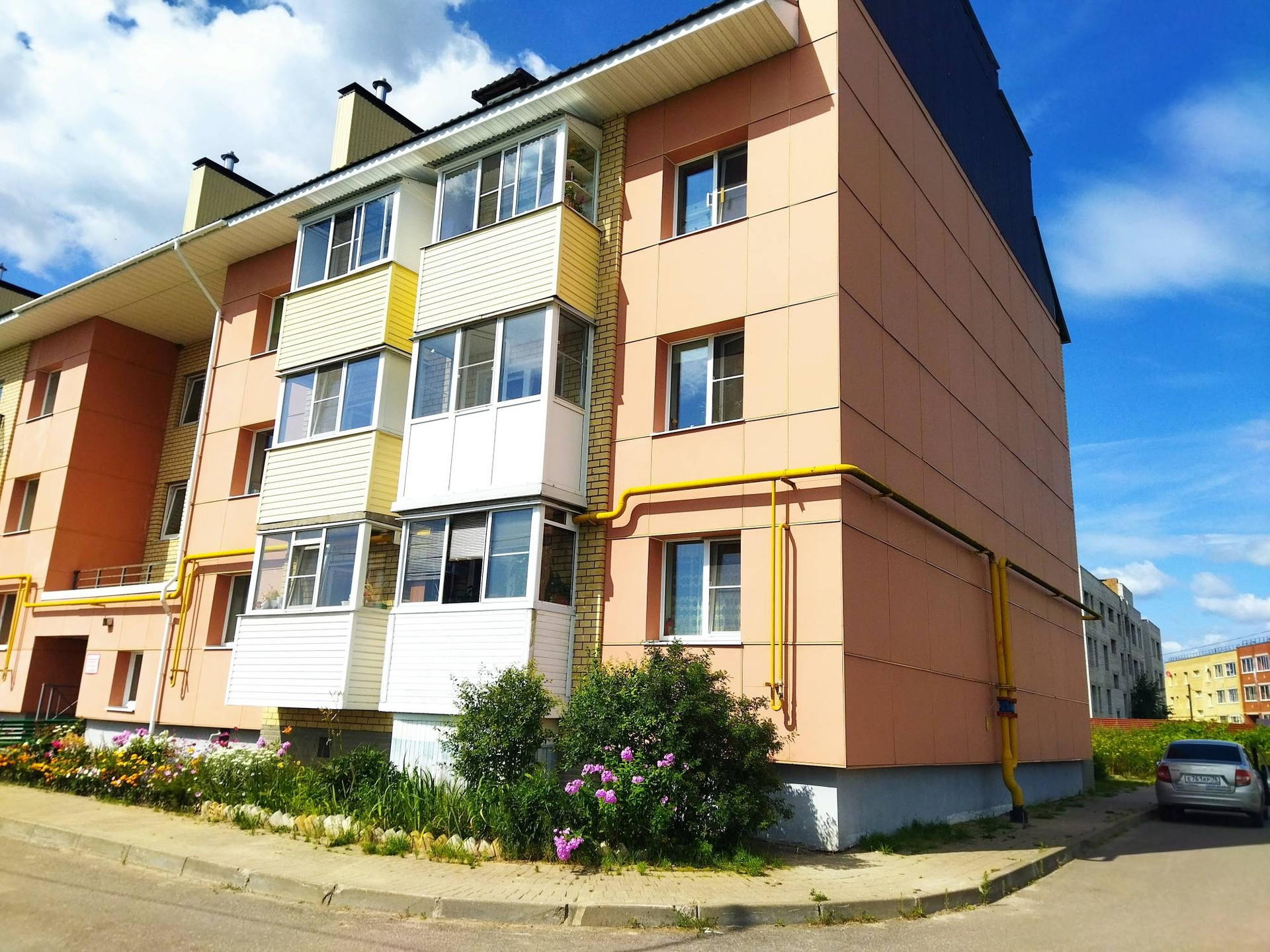 Квартира на первом этаже (высокий первый этаж) трёхэтажного дома с видом из окна на природу (поле и лес). Парковочных мест всегда хватает. Квартира очень тёплая.