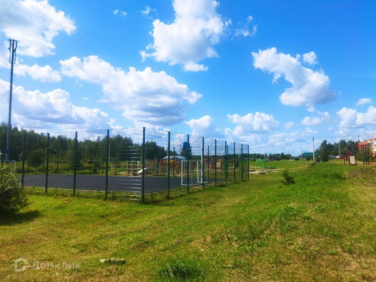 Огромная детская площадка, спортивная площадка, футбольное поле, закрытая баскетбольная площадка. Ходит школьный автобус.