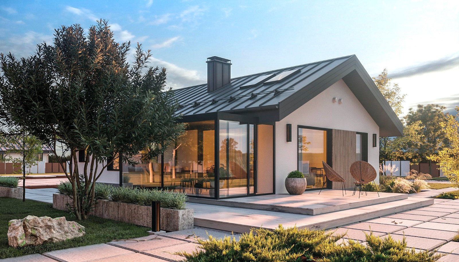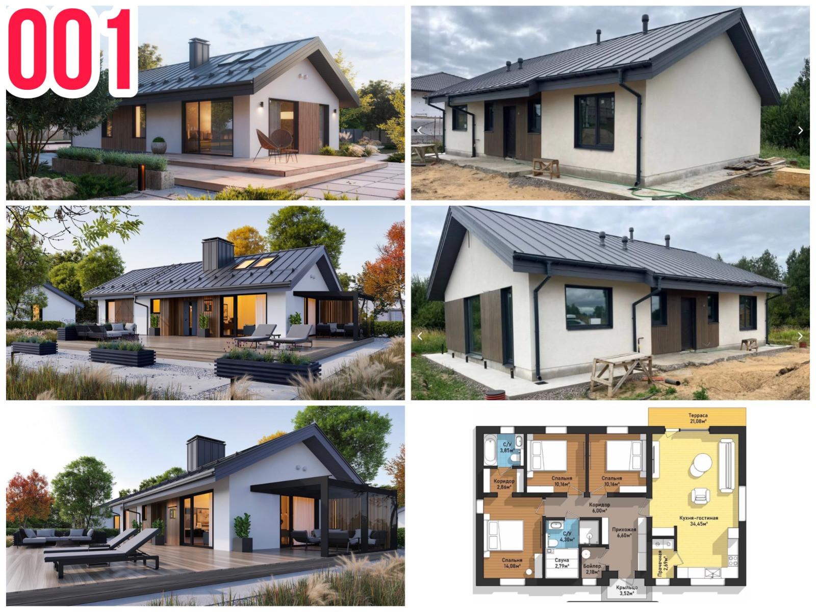 3 спальни, две по 10,16м2 и одна 14,08м Кухня-гостиная 34,45 м² , прачечная 2,69м2 Терраса 21, 8 м2 , два совмещенных санузла. Размеры на участке: 8,65х14,62м Характеристики: Фундамент: монолитная плита 300 мм Материал несущих стен: газобетон 400 мм Кровля: металлочерепица Окна с двойным остеклением. Облицовка стен: штукатурка короед, доска Отопление: котел электрический, теплый водяной пол в санузлах и на кухне,  Септик 10 м3, скважина.
