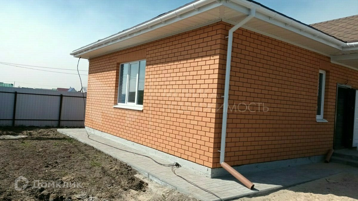 Готовый дом, выполненный из керамзитоблока 300. Дом утеплен пенополистиролом толщиной 50 мм. Фасад облицован кирпичом брылино, а крыша выполнена из мягкой кровли. На участке также имеется отмостка и брущадка.