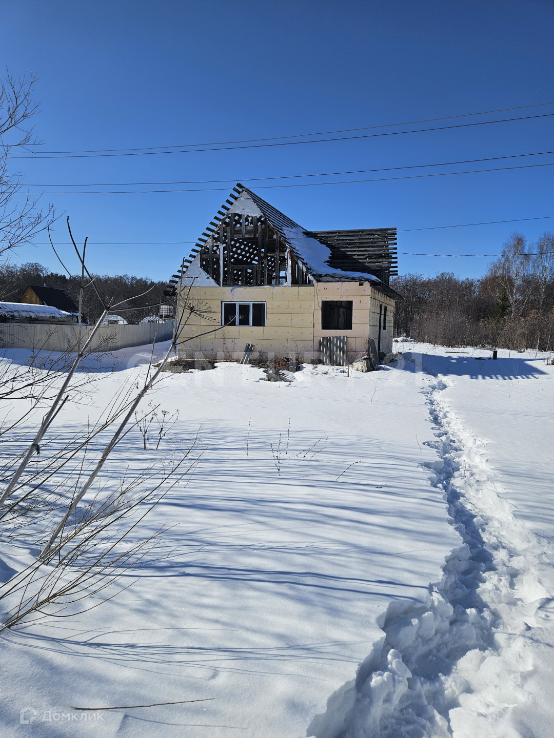 На участке уже установлены столбы для забора и есть не достроенный дом.