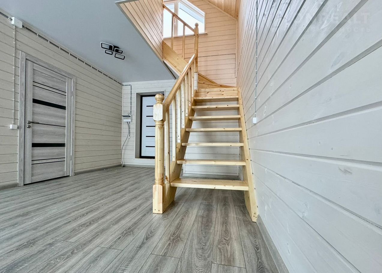 Внутренняя отделка первого этажа: пол - ламинат, натяжные потолки, стены - имитация бруса А сорта, с выкрашиванием антисептиком (слоновая кость).