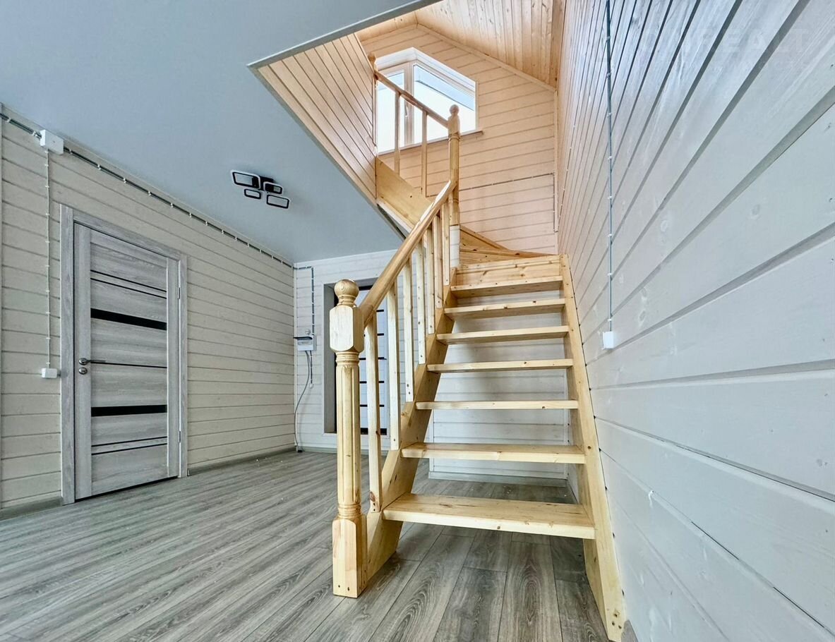Внутренняя отделка первого этажа: пол - ламинат, натяжные потолки, стены - имитация бруса А сорта, с выкрашиванием антисептиком (слоновая кость)